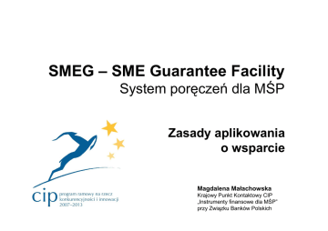 SMEG – SME Guarantee Facility System poręczeń dla MŚP Zasady aplikowania o wsparcie Magdalena Małachowska Krajowy Punkt Kontaktowy CIP „Instrumenty finansowe dla MŚP” przy Związku Banków Polskich Program ramowy na rzecz konkurencyjności i innowacji 2007-2013 Instrumenty finansowe dla MŚP Główny cel „Instrumentów finansowych dla MŚP”: ułatwienie małym i średnim przedsiębiorstwom (MŚP) dostępu do finansowania zewnętrznego w kaŜdej fazie ich rozwoju: na etapie zakładania, w fazie startu, w fazie ekspansji oraz na etapie transferu przedsiębiorstwa. 2 Program ramowy na rzecz konkurencyjności i innowacji 2007-2013 Instrumenty finansowe dla MŚP Komisja Europejska Europejski Fundusz Inwestycyjny zapewnia środki gwarantuje KPK CIP „Instrumenty finansowe dla MŚP” działania promocyjne, informacyjne, konsultacyjne Fundusz poręczeniowy gwarantuje inwestuje Fundusz kapitałowy oraz sieć Aniołów Biznesu gwarantuje Bank / Fundusz poŜyczkowy / Przedsiębiorstwo leasingowe inwestuje poŜycza MSP MSP 3 Program ramowy na rzecz konkurencyjności i innowacji 2007-2013 SMEG – System poręczeń dla MŚP SMEG – SME Guarantee Facility System poręczeń dla MŚP Cel: • Gwarancje portfelowe na rzecz Funduszy PoŜyczkowych • Regwarancje portfelowe na rzecz Funduszy Poręczeniowych Instytucja wdraŜająca: Europejski Fundusz Inwestycyjny (EFI) Nabór wniosków: • Otwarty (oficjalne uruchomienie instrumentu – 26.09.2007) • Tryb ciągły (nie ma rund aplikacyjnych) Prognozowana dźwignia finansowa: 1:50 4 Program ramowy na rzecz konkurencyjności i innowacji 2007-2013 SMEG – System poręczeń dla MŚP SMEG System poręczeń dla MŚP Gwarancje kredytów W tym równieŜ: Gwarancje poŜyczek Gwarancje leasingu Gwarancje mikrokredytów Gwarancje inwestycji kapitałowych Gwarancje transakcji sekurytyzacji 5 Program ramowy na rzecz konkurencyjności i innowacji 2007-2013 SMEG – System poręczeń dla MŚP SMEG dla Funduszy PoŜyczkowych • Gwarancje portfeli kredytów/poŜyczek udzielonych MŚP (bez opłat gwarancyjnych, w ramach opcji „Gwarancje kredytów”) • Gwarancje portfeli mikrokredytów/mikropoŜyczek udzielonych mikroprzedsiębiorcom (bez opłat gwarancyjnych, wsparcie techniczne 50 000 EUR, w ramach opcji „Gwarancje mikrokredytów”) SMEG dla Funduszy Poręczeniowych • Regwarancje portfeli poręczeń kredytów/poŜyczek udzielonych MŚP (bez opłat gwarancyjnych, w ramach opcji „Gwarancje kredytów”) • Regwarancje portfeli poręczeń mikrokredytów/mikropoŜyczek udzielonych mikroprzedsiębiorcom (bez opłat gwarancyjnych, wsparcie techniczne 50 000 EUR, w ramach opcji „Gwarancje mikrokredytów”) 6 Program ramowy na rzecz konkurencyjności i innowacji 2007-2013 SMEG – System poręczeń dla MŚP IDEA PoŜyczka / Poręczenie dla MŚP SMEG SMEG Wniosek Wniosek aplikacyjny aplikacyjny PoŜyczka / Poręczenie dla MŚP Gwarancja UE / Regwarancja UE Fundusz PoŜyczkowy / Fundusz Poręczeniowy PoŜyczka / Poręczenie dla MŚP Fundusz PoŜyczkowy / Fundusz Poręczeniowy Gwarancja UE / Regwarancja UE 7 SMEG – System poręczeń dla MŚP Zasady aplikowania o wsparcie PROCEDURA SKŁADANIA I OCENY WNIOSKÓW SMEG – System poręczeń dla MŚP Procedura składania i oceny wniosków (1) Kwestionariusz informacji wstępnych Wniosek o pełnienie funkcji pośrednika • zawiera podstawowe informacje o instytucji • dwa egzemplarze • forma elektroniczna • w języku angielskim • składany do EFI tylko poprzez e-mail – adres [email protected] • składany do EFI 9 SMEG – System poręczeń dla MŚP Procedura składania i oceny wniosków (2) Zgłoszenie do EFI chęci udziału w programie – zainteresowana instytucja finansowa przesyła Kwestionariusz informacji wstępnych ZłoŜenie przez instytucję finansową Wniosku o pełnienie funkcji pośrednika Wstępna selekcja wniosków przez EFI (chronologicznie, zgodnie z najlepszymi praktykami biznesowymi i przy wyeliminowaniu wszelkiego konfliktu interesów) Wstępna akceptacja wniosku przez EFI i wizyty Due Diligence instytucji finansowej (obejmują zagadnienia finansowe, operacyjne, umiejętności i moŜliwości instytucji do szerokiego informowania MŚP o wsparciu UE, itp.) EFI rekomenduje Komisji Europejskiej przyjęcie wniosku Ostateczna decyzja Komisji Europejskiej 10 Zawarcie umowy pomiędzy EFI i instytucją finansową SMEG – System poręczeń dla MŚP Procedura składania i oceny wniosków (3) Wniosek powinien w szczególności uwzględniać następujące zagadnienia: I. Oczekiwaną wartość dodaną Systemu poręczeń dla MŚP II. Przewidywane działania mające na celu wdroŜenie i zarządzanie Systemem poręczeń dla MŚP, w szczególności dotyczące jego uruchomienia (termin, zmiany podstawowych dokumentów prawnych itp.) III. Szacowaną zdolność absorpcyjną IV. Przewidywane procedury gromadzenia i przetwarzania danych w celu spełnienia wymagań sprawozdawczych V. Przewidywane strategie marketingowe/promocyjne, które istnieją/mają być wdroŜone w celu spełnienia wymagań unijnych w zakresie promocji i informacji 11 SMEG – System poręczeń dla MŚP Zasady aplikowania o wsparcie PODSTAWOWE ELEMENTY UMOWY I WSPÓŁPRACY SMEG – System poręczeń dla MŚP Podstawowe elementy umowy i współpracy (1) PoŜyczka / Poręczenie Instrument finansowy dla MŚP - Nowy produkt w ofercie lub zmodyfikowany Produkt dotychczasowy - Określona nazwa i parametry produktu, korzystniejsze od obecnie oferowanych - KaŜdy tego typu produkt obowiązkowo włączany do Portfela, objętego Gwarancją UE Portfel PoŜyczek / Portfel Poręczeń - Budowany z transakcji zawartych w ramach określonego produktu finansowego - Objęty Gwarancją UE - Wolumen dla PoŜyczek / Poręczeń – portfel około 20 mln EUR - Wolumen dla MikropoŜyczek / Mikroporęczeń – odpowiednio niŜsze 13 wartości portfeli SMEG – System poręczeń dla MŚP Podstawowe elementy umowy i współpracy (2) Rozszerzony do