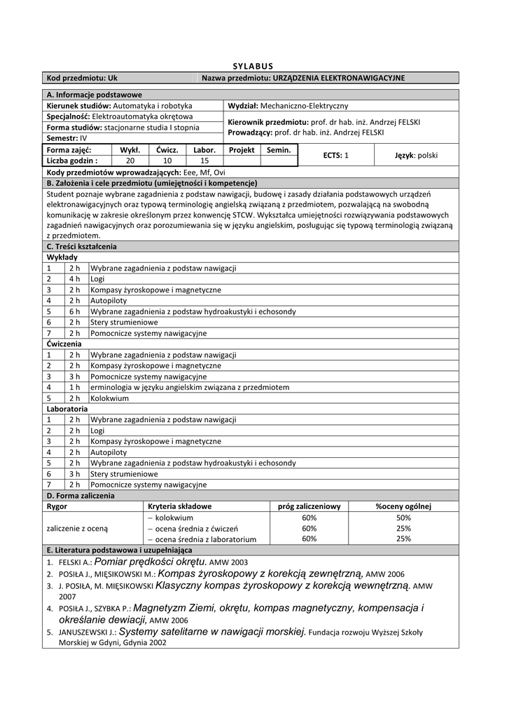 SYL ABUS Kod przedmiotu: Uk Nazwa przedmiotu: URZĄDZENIA ELEKTRONAWIGACYJNE A. Informacje podstawowe Kierunek studiów: Automatyka i robotyka Wydział: Mechaniczno-Elektryczny Specjalność: Elektroautomatyka okrętowa Kierownik przedmiotu: prof. dr hab. inż. Andrzej FELSKI Forma studiów: stacjonarne studia I stopnia Prowadzący: prof. dr hab. inż. Andrzej FELSKI Semestr: IV Forma zajęć: Wykł. Ćwicz. Labor. Projekt Semin. ECTS: 1 Język: polski Liczba godzin : 20 10 15 Kody przedmiotów wprowadzających: Eee, Mf, Ovi B. Założenia i cele przedmiotu (umiejętności i kompetencje) Student poznaje wybrane zagadnienia z podstaw nawigacji, budowę i zasady działania podstawowych urządzeń elektronawigacyjnych oraz typową terminologię angielską związaną z przedmiotem, pozwalającą na swobodną komunikację w zakresie określonym przez konwencję STCW. Wykształca umiejętności rozwiązywania podstawowych zagadnień nawigacyjnych oraz porozumiewania się w języku angielskim, posługując się typową terminologią związaną z przedmiotem. C. Treści kształcenia Wykłady 1 2 h Wybrane zagadnienia z podstaw nawigacji 2 4 h Logi 3 2 h Kompasy żyroskopowe i magnetyczne 4 2 h Autopiloty 5 6 h Wybrane zagadnienia z podstaw hydroakustyki i echosondy 6 2 h Stery strumieniowe 7 2 h Pomocnicze systemy nawigacyjne Ćwiczenia 1 2 h Wybrane zagadnienia z podstaw nawigacji 2 2 h Kompasy żyroskopowe i magnetyczne 3 3 h Pomocnicze systemy nawigacyjne 4 1 h erminologia w języku angielskim związana z przedmiotem 5 2 h Kolokwium Laboratoria 1 2 h Wybrane zagadnienia z podstaw nawigacji 2 2 h Logi 3 2 h Kompasy żyroskopowe i magnetyczne 4 2 h Autopiloty 5 2 h Wybrane zagadnienia z podstaw hydroakustyki i echosondy 6 3 h Stery strumieniowe 7 2 h Pomocnicze systemy nawigacyjne D. Forma zaliczenia Rygor Kryteria składowe próg zaliczeniowy %oceny ogólnej − kolokwium 60% 50% zaliczenie z oceną 60% 25% − ocena średnia z ćwiczeń 60% 25% − ocena średnia z laboratorium E. Literatura podstawowa i uzupełniająca 1. FELSKI A.: Pomiar prędkości okrętu. AMW 2003 2. POSIŁA J., MIĘSIKOWSKI M.: Kompas żyroskopowy z korekcją zewnętrzną, AMW 2006 3. J. POSIŁA, M. MIĘSIKOWSKI Klasyczny kompas żyroskopowy z korekcją wewnętrzną. AMW 2007 4. POSIŁA J., SZYBKA P.: Magnetyzm Ziemi, okrętu, kompas magnetyczny, kompensacja i określanie dewiacji, AMW 2006 5. JANUSZEWSKI J.: Systemy satelitarne w nawigacji morskiej. Fundacja rozwoju Wyższej Szkoły Morskiej w Gdyni, Gdynia 2002 6. SZYMOŃSKI M.: Nawigacyjne wykorzystanie sztucznych satelitów Ziemi, WKiŁ, Warszawa 1989 7. HOFMANN-WELLENHOF, LICHTENEGGER H., COLLINS J.: GPS Theory and practice, Fourth edition, Springer, Wien New York 1997 8. SPILKER J., PARKINSON B., i inni: Global Positioning System: Theory and Applications, AIAA 1996. 9. WELLS (red), Guide to GPS Positioning, Canadian GPS Associates, Fredericton 1987. 10. ICD - GPS – 200, NAVSTAR GPS Joint Program Office, Navtech, February 1995. (pozycja dostępna w Internecie). 11. SPS (2001), Global Positioning System Standard Positioning Service, Performance Standard, Assistant Secretary of Defense (pozycja dostępna w Internecie).