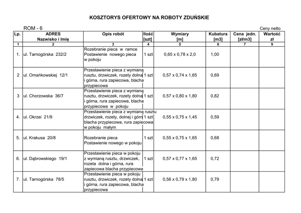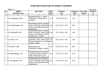 KOSZTORYS OFERTOWY NA ROBOTY ZDUŃSKIE ROM - 6 Lp. ADRES Nazwisko i Imię Opis robót Ilość [szt] Wymiary [m] Kubatura [m3] 1 2 3 4 5 6 1 szt 0,65 x 0,78 x 2,0 1,00 0,57 x 0,74 x 1,65 0,69 0,57 x 0,80 x 1,80 0,82 0,55 x 0,75 x 1,45 0,59 0,55 x 0,75 x 1,65 0,68 0,57 x 0,77 x 1,65 0,72 0,56 x 0,79 x 1,80 0,79 1. ul. Tarnogórska 232/2 2 ul. Omańkowskiej 12/1 3 ul. Chorzowska 36/7 4. ul. Okrzei 21/9 5. ul. Krakusa 20/8 6. ul. Dąbrowskiego 19/1 7. ul. Tarnogórska 78/5 Rozebranie pieca w ramce Postawienie nowego pieca w pokoju Przestawienie pieca z wymianą rusztu, drzwiczek, rozety dolna 1 szt i górna, rura zapiecowa, blacha przypiecowa Przestawienie pieca z wymianą rusztu, drzwiczek, rozety dolna 1 szt i górna, rura zapiecowa, blacha przypiecowa w pokoju Przestawienie pieca z wymianą rusztu drzwiczek, rozety, dolnej i górnej 1 szt blacha przypiecowa, rura zapiecowa w pokoju małym Rozebranie pieca 1 szt Postawienie nowego w pokoju Przestawienie pieca w pokoju z wymianą rusztu, drzwiczek, 1 szt rozeta dolna i górna, rura zapiecowa blacha przypiecowa Przestawienie pieca w pokoju rusztu, drzwiczek, rozety dolna 1 szt i górna, rura zapiecowa, blacha przypiecowa Ceny netto Cena jedn. Wartość [zł/m3] zł 7 9 KOSZTORYS OFERTOWY NA ROBOTY ZDUŃSKIE ROM - 6 Lp. ADRES Nazwisko i Imię 1 2 8. ul. Witkiewicza 31/2 9. ul. Libelta 10/9 10. ul. Libelta 4/8 11. ul. Lipowa 25/8 12. ul. Okrzei 7/1 13. ul. Wróblewskiego 31/2 14. ul. Chodkiewicza 25/2 Opis robót Ilość [szt] Wymiary [m] Kubatura [m3] 3 4 5 6 Przestawienienie pieca z wymianą rusztu, drzwiczek, rozety dolna 1 szt i górna rura zapiecowa, blacha przypiecowa ( w pokoju) Przestawienie pieca z wymianą rusztu, drzwiczek, rozety dolna 1 szt i górna rura zapiecowa, blacha przypiecowa ( w pokoju ) Przestawienienie pieca z wymianą rusztu, drzwiczek, rozety dolna 1 szt i górna rura zapiecowa, blacha przypiecowa (w pokoju ) Przestawienienie pieca z wymianą rusztu, drzwiczek, rozety dolna 1 szt i górna rura zapiecowa, blacha przypiecowa ( w pokoju małym ) Rozebranie pieca w pokoju Postawienie nowego pieca 1 szt kaflowego w pokoju małym Przestawienie pieca z wymianą rusztu, drzwiczek, rozety dolna 1 szt i górna, rura zapiecowa blacha przypuiecowa pokój od podwórka Przestawienienie piecy z wymianą rusztu, drzwiczek, rozety dolna 1 szt i górna rura zapiecowa, blacha 1 szt przypiecowa ( w pokojach ) 0,55 x 0,75 x 1,75 0,72 0,55 x 0,74 x 1,75 0,71 0,58 x 0,78 x 1,76 0,79 0,45 x 0,75 x 1,75 0,59 0,65 x 0,75 x 1,65 0,80 0,55 x 0,75 x 1,79 0,73 0,47 x 0,68 x 1,71 0,47 x 0,68 x 1,71 0,54 0,54 Ceny netto Cena jedn. Wartość [zł/m3] [zł] 7 9 KOSZTORYS OFERTOWY NA ROBOTY ZDUŃSKIE ROM - 6 Lp. ADRES Nazwisko i Imię 1 2 15. ul. Okrzei 19/9 16. ul. Wróblewskiego 27/1 Opis robót Ilość [szt] Wymiary [m] Kubatura [m3] 3 4 5 6 Przestawienienie pieca z wymianą rusztu, drzwiczek, rozety dolna 1 szt i górna rura zapiecowa, blacha przypiecowa ( w pokoju) Rozebranie pieca Postawienie nowego pieca 1 szt 0,78 x 0,55 x 1,65 0,70 0,55x 0,77 x 1,70 0,71 Ceny netto Cena jedn. Wartość [zł/m3] [zł] 7 9 KOSZTORYS OFERTOWY NA ROBOTY ZDUŃSKIE ROM - 10 Opis robót L.p Adres Nazwisko i imię Ilość szt Wymiary m kubatura m3 Cena jedn. zł/m3 Wartość zł 1 2 3 4 5 6 7 8 1 ul. Staromiejska 18/3 oficyna 2 ul. Staromiewjska 18/1 3 ul. Staromiejska 4a/1 4 ul. Zawadzkiego 10/2 Przestawienie pieca z wymianą rusztu, drzwiczek, rozety dolna 1 szt i górna, rura zapiecowa blacha przypiecowa Przestawienie pieca w ramce ruszta, drzwiczki, rozety dolna 1 szt i górna, rura zapiecowa blacha przypiecowa Rozebranie pieca w pokoju Postawienie nowego pieca 1 szt 0,55 x 0,65 x 1,85 0,67 0,47 x 0,70 x 1,45 0,47 0,56 x 0,80 x 1,60 0,71 Przestawienie pieca z wymianą rusztu, drzwiczek, rozety dolna 1 szt 0,55 x 0,77 x 1,50 i górna, rura zapiecowa blacha przypiecowa ( brak fundamentu ) 0,64 5 ul. Zawadzkiego 10/2 Postawienie pieca kaflowego kuchennego 1 szt 0,64 x 0,80 x 1,0 0,51 6 ul. Miła 5/6 Przestawienie pieca kuchennego 1 szt 1,0 x 0,64 x 0,80 0,51 7 ul. Gojawiczyńskiej 10/2 Postawienie nowego pieca kuchennego 1 szt 1,0 x 0,64 x 0,80 0,51 KOSZTORYS OFERTOWY NA ROBOTY ZDUŃSKIE ROM - 10 Lp. Adres Nazwisko i imię 1 2 8 ul. Zawadzkiego 10/1 Opis robót Ilość szt Wymiary m Kubatura m3 Cena jedn. zł/m3 Wartość zł 3 4 5 6 7 8 0,56 x 0,81 x 1,75 0,80 Rozebranie pieca pokojowego Postawienie nowego pieca 1 szt