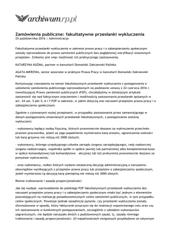Zamówienia publiczne: fakultatywne przesłanki wykluczenia 25 października 2016 | Administracja Fakultatywne przesłanki wykluczenia w zakresie prawa pracy i o zabezpieczeniu społecznym zostały wprowadzone do prawa zamówień publicznych bez pogłębionej weryfikacji stosownych przepisów. Znikoma jest więc możliwość ich praktycznego zastosowania. KATARZYNA KUŹMA, partner w kancelarii Domański Zakrzewski Palinka AGATA MIERZWA, senior associate w praktyce Prawa Pracy w kancelarii Domański Zakrzewski Palinka Kontynuując rozważania na temat fakultatywnych przesłanek wykluczenia z postępowania o udzielenie zamówienia publicznego wprowadzonych na podstawie ustawy z 22 czerwca 2016 r. nowelizującej Prawo zamówień publicznych (PZP), chciałybyśmy w dzisiejszym artykule zastanowić się nad faktycznym znaczeniem i możliwością zastosowania przesłanek opisanych w art. 24 ust. 5 pkt 5, 6 i 7 PZP w zakresie, w jakim dotyczą one naruszeń przepisów prawa pracy i o zabezpieczeniu społecznym. Zgodnie z cytowanymi wyżej przepisami, w przypadku zastosowania przez zamawiającego w danym postępowaniu omawianych przesłanek fakultatywnych, z postępowania zostaną wykluczeni: - wykonawcy będący osobą fizyczną, których prawomocnie skazano za wykroczenie przeciwko prawom pracownika, jeżeli za jego popełnienie wymierzono karę aresztu, ograniczenia wolności lub karę grzywny nie niższą niż 3000 złotych; - wykonawcy, którego urzędującego członka zarządu (organu zarządzającego), rady nadzorczej (organu nadzorczego), wspólnika spółki w spółce jawnej lub partnerskiej albo komplementariusza w spółce komandytowej lub komandytowo – akcyjnej lub też prokurenta prawomocnie skazano za powyższe wykroczenia; - oraz wykonawcy, wobec których wydano ostateczną decyzję administracyjną o naruszeniu obowiązków wynikających z przepisów prawa pracy lub przepisów o zabezpieczeniu społecznym, jeżeli wymierzono tą decyzją karę pieniężną nie niższą niż 3000 złotych. Równe traktowanie i zasada proporcjonalności Jak się wydaje, wprowadzenie do polskiego PZP fakultatywnych przesłanek wykluczenia dot. naruszeń przepisów prawa pracy i o zabezpieczeniu społecznym miało być jednym z elementów pozwalających na realizację pozaekonomicznych celów zamówień publicznych, w tym przypadku celów społecznych. Powstaje jednak zasadnicze pytanie, czy przesłanki wykluczenia zostały sformułowane w sposób, który faktycznie przyczyni się do realizacji wspomnianego celu oraz czy ich zastosowanie w konkretnych postępowaniach, szczególnie z udziałem wykonawców zagranicznych, nie będzie naruszało dwóch z podstawowych zasad, tj. zasady równego traktowania i zasady proporcjonalności. (O wątpliwościach związanych przykładowo ze sztywnym ustanowieniem progu grzywny, od której nałożenia uzależnione jest wykluczenie z postępowania, na poziomie 3000 złotych, pisaliśmy już w artykule wprowadzającym do niniejszego cyklu opublikowanym w dniu 18 października br.). Należy bowiem przypomnieć, iż zgodnie z motywem 37 preambuły do dyrektywy 2014/24/UE, „jest rzeczą szczególnie istotną, by państwa członkowskie i instytucje zamawiające podjęły stosowne środki w celu zapewnienia przestrzegania obowiązków w dziedzinie (...) prawa socjalnego i prawa pracy (...). Stosowne środki powinny mieć zastosowanie zgodnie z podstawowymi zasadami prawa Unii, w szczególności z myślą o zapewnieniu równego traktowania." To ostatnie może okazać się w konkretnych przypadkach wątpliwe, zastosowanie bądź nie danej przesłanki wykluczenia powinno być zatem przez zamawiających przemyślane również z tego punktu widzenia, szczególnie w sytuacji, w której realizują oni projekt (inwestycję) współfinansowaną ze środków unijnych. Innym zagadnieniem jest praktyczny wymiar stosowania omawianych przesłanek. Zacznijmy od ostatniej cytowanej uprzednio przesłanki dotyczącej nałożenia na wykonawcę ostatecznej decyzji administracyjnej o naruszeniu obowiązków wynikających z przepisów prawa pracy lub przepisów o zabezpieczeniu społecznym. W sprawach z zakresu prawa pracy ostateczne decyzje administracyjne stwierdzające naruszenie obowiązków i wymierzające za to naruszenie kary pieniężne są absolutnym wyjątkiem. Z taką decyzją będziemy mieli do czynienia głównie w dwóch przypadkach. Pierwszym z nich będzie sytuacja, w której pracodawca nie opłaci składek na ubezpieczenie społeczne lub je opłaci, ale w zaniżonej wysokości. Zgodnie z ustawą o systemie ubezpieczeń społecznych, Zakład Ubezpieczeń Społecznych będzie mógł wówczas nałożyć na płatnika (czyli podmiot będący pracodawcą) dodatkową opłatę do wysokości 100 proc. nieopłaconych składek. Przykładem nieopłacenia składek na ubezpieczenie społeczne będzie sytuacja, w której firma zawierała umowy o dzieło (nieobjęte obowiązkiem składkowym), podczas gdy Zakład Ubezpieczeń Społecznych ustali w trakcie kontroli, iż w rzeczywistości ubezpieczeni wykonują czynności w sposób odpowiadający umowom zlecenia lub umowom o pracę (objęte obowiązkiem składkowym). Dodatkowa opłata jest nakładana w formie decyzji administracyjnej. Ustawa nie posługuje się co prawda sformułowaniem kary pieniężnej, ale dodatkowa opłata ma niezaprzeczalnie charakter kary. Jednoczesne ukaranie pracodawcy będącego osobą fizyczną za przestępstwo lub wykroczenie polegające na nieopłacaniu składek na ubezpieczenie społeczne skutkuje tym, iż opłaty dodatkowej za ten sam czyn nie wymierza się. Płatnik ma prawo odwołać się od decyzji wydanej przez ZUS do sądu okręgowego, jednak wyrok wydany przez sąd nie zmienia charakteru podstawy obciążenia pracodawcy opłatą dodatkową. Wyrok utrzymuje bowiem w mocy (lub w razie skutecznego podniesienia zarzutów – zmienia) decyzję ZUS, która w ten sposób zyskuje przymiot decyzji ostatecznej. Obl