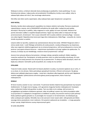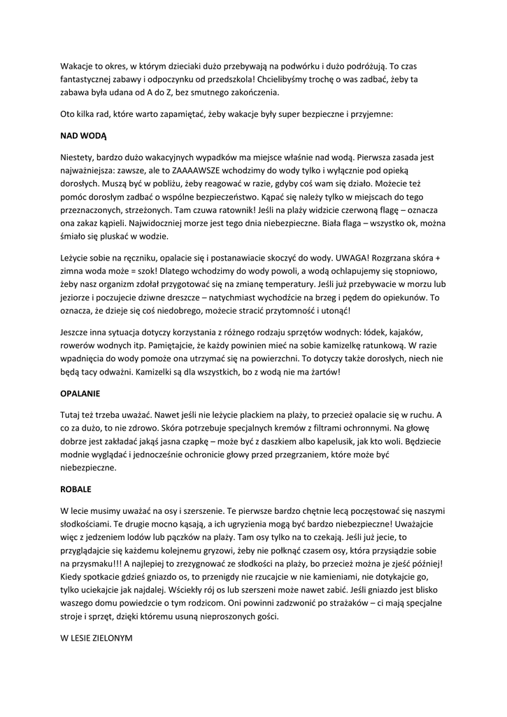 Wakacje to okres, w którym dzieciaki dużo przebywają na podwórku i dużo podróżują. To czas fantastycznej zabawy i odpoczynku od przedszkola! Chcielibyśmy trochę o was zadbać, żeby ta zabawa była udana od A do Z, bez smutnego zakończenia. Oto kilka rad, które warto zapamiętać, żeby wakacje były super bezpieczne i przyjemne: NAD WODĄ Niestety, bardzo dużo wakacyjnych wypadków ma miejsce właśnie nad wodą. Pierwsza zasada jest najważniejsza: zawsze, ale to ZAAAAWSZE wchodzimy do wody tylko i wyłącznie pod opieką dorosłych. Muszą być w pobliżu, żeby reagować w razie, gdyby coś wam się działo. Możecie też pomóc dorosłym zadbać o wspólne bezpieczeństwo. Kąpać się należy tylko w miejscach do tego przeznaczonych, strzeżonych. Tam czuwa ratownik! Jeśli na plaży widzicie czerwoną flagę – oznacza ona zakaz kąpieli. Najwidoczniej morze jest tego dnia niebezpieczne. Biała flaga – wszystko ok, można śmiało się pluskać w wodzie. Leżycie sobie na ręczniku, opalacie się i postanawiacie skoczyć do wody. UWAGA! Rozgrzana skóra + zimna woda może = szok! Dlatego wchodzimy do wody powoli, a wodą ochlapujemy się stopniowo, żeby nasz organizm zdołał przygotować się na zmianę temperatury. Jeśli już przebywacie w morzu lub jeziorze i poczujecie dziwne dreszcze – natychmiast wychodźcie na brzeg i pędem do opiekunów. To oznacza, że dzieje się coś niedobrego, możecie stracić przytomność i utonąć! Jeszcze inna sytuacja dotyczy korzystania z różnego rodzaju sprzętów wodnych: łódek, kajaków, rowerów wodnych itp. Pamiętajcie, że każdy powinien mieć na sobie kamizelkę ratunkową. W razie wpadnięcia do wody pomoże ona utrzymać się na powierzchni. To dotyczy także dorosłych, niech nie będą tacy odważni. Kamizelki są dla wszystkich, bo z wodą nie ma żartów! OPALANIE Tutaj też trzeba uważać. Nawet jeśli nie leżycie plackiem na plaży, to przecież opalacie się w ruchu. A co za dużo, to nie zdrowo. Skóra potrzebuje specjalnych kremów z filtrami ochronnymi. Na głowę dobrze jest zakładać jakąś jasna czapkę – może być z daszkiem albo kapelusik, jak kto woli. Będziecie modnie wyglądać i jednocześnie ochronicie głowy przed przegrzaniem, które może być niebezpieczne. ROBALE W lecie musimy uważać na osy i szerszenie. Te pierwsze bardzo chętnie lecą poczęstować się naszymi słodkościami. Te drugie mocno kąsają, a ich ugryzienia mogą być bardzo niebezpieczne! Uważajcie więc z jedzeniem lodów lub pączków na plaży. Tam osy tylko na to czekają. Jeśli już jecie, to przyglądajcie się każdemu kolejnemu gryzowi, żeby nie połknąć czasem osy, która przysiądzie sobie na przysmaku!!! A najlepiej to zrezygnować ze słodkości na plaży, bo przecież można je zjeść później! Kiedy spotkacie gdzieś gniazdo os, to przenigdy nie rzucajcie w nie kamieniami, nie dotykajcie go, tylko uciekajcie jak najdalej. Wściekły rój os lub szerszeni może nawet zabić. Jeśli gniazdo jest blisko waszego domu powiedzcie o tym rodzicom. Oni powinni zadzwonić po strażaków – ci mają specjalne stroje i sprzęt, dzięki któremu usuną nieproszonych gości. W LESIE ZIELONYM Las jest piękny latem, ale bardzo biedny. Często ze względu na gorąco i suszę drzewom grożą pożary. Musimy więc im pomóc. Jeśli maszerujemy przez las, to nie zostawiajmy w nim śmieci, zwłaszcza szklanych butelek. Padające przez nie promienie słoneczne mogą wywołać ogień. W ogóle nie wolno śmiecić w lasach, ani trochę! Podobnie sprawa ma się z ogniskami. Można je rozpalać tylko w specjalnie wyznaczonych do tego miejscach, a po udanej zabawie ognisko trzeba zalać wodą. Jeśli rozpalimy ogień w lesie i stracimy nad nim kontrolę, to zginie wiele biednych zwierząt, ptaków i drzew. A tego na pewno nie chcecie. Uważajcie także na zwierzęta, zarówno te dzikie, jak i domowe. Absolutnie nie bierzemy na ręce nietoperzy, nie głaszczemy lisów gdy podejdą – mogą nas ugryźć i zarazić wścieklizną, a to oznacza pobyt w szpitalu! Nie zaczepiamy obcych psów ani kotów. BURZA Nawet Ci, którzy się nie boją burzy powinni pewne rzeczy wiedzieć. Jeśli zaskoczy nas gdzieś burza, to nie chowajmy się pod drzewami. One przyciągają pioruny. Jak najszybciej powinniśmy schować się w jakimś budynku , bo te posiadają piorunochrony! Można też skryć się w samochodzie. Powyłączajcie telefony komórkowe, żeby one nie ściągnęły błyskawic! ZGUBY I KOLEDZY Zgubiliście gdzieś na plaży rodziców? Nie możecie ich znaleźć? Podejdźcie do ratownika lub kogoś dorosłego i poproście o pomoc. Powiedzcie jak się nazywacie, ile macie lat i skąd przyjechaliście. Ratownicy przekażą sobie wiadomość za pomocą krótkofalówek a potem pomogą szukać rodzinki. Uff… Prawie koniec. Jeszcze tylko uważajcie na siebie na drogach. No! Tak przygotowanych możemy was puścić na wakacje. Bawcie się wesoło, wracajcie cali i zdrowi!