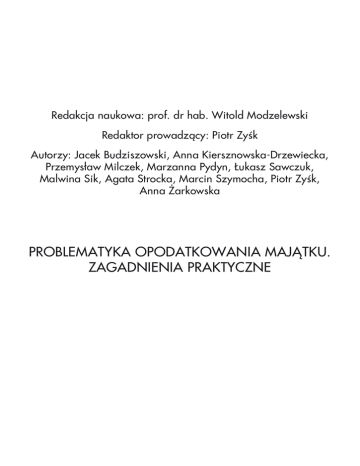 Redakcja naukowa: prof. dr hab. Witold Modzelewski Redaktor prowadzący: Piotr Zyśk Autorzy: Jacek Budziszowski, Anna Kiersznowska-Drzewiecka, Przemysław Milczek, Marzanna Pydyn, Łukasz Sawczuk, Malwina Sik, Agata Strocka, Marcin Szymocha, Piotr Zyśk, Anna Żarkowska Problematyka opodatkowania majątku. Zagadnienia praktyczne Spis treści Wykaz ważniejszych skrótów........................................................................................................................................ 4 Wstęp............................................................................................................................................................................. 5 Rozdział I. Podatki od posiadania majątku: Podatek od nieruchomości, rolny, leśny i od środków transportowych..... 5 1. Podmiot podatku........................................................................................................................................................ 5 A. Opodatkowanie nieruchomości stanowiących współwłasność........................................................................... 5 B. Gmina zapłaci podatek od własnych nieruchomości.......................................................................................... 6 C. Termin złożenia deklaracji dla celów podatku od nieruchomości...................................................................... 6 D. Nabycie przez spółkę kapitałową nieruchomości w trakcie roku podatkowego a podatek od nieruchomości.... 6 E. Fakt posiadania nieruchomości przez przedsiębiorcę skutkuje tym, że budynek, budowla lub grunt jest związany z prowadzeniem działalności gospodarczej........................................................................................ 6 F. Podatnik podatku leśnego.................................................................................................................................. 7 G. Zakres podmiotowy podatku od środków transportowych................................................................................. 7 2. Przedmiot podatku..................................................................................................................................................... 7 A. Część budynku, a stawka podatkowa................................................................................................................. 7 B. Nieruchomości nie wykorzystywane w działalności gospodarczej ze względów technicznych......................... 8 C. Podatek od nieruchomości od budynku bez zadaszenia. ................................................................................... 8 D. Dane z ewidencji gruntów i budynków a podatek od nieruchomości................................................................. 9 E. Opodatkowanie systemów antenowych............................................................................................................. 9 F. Moment powstania obowiązku podatkowego w przypadku używania części budowli....................................... 9 G. Kwalifikacja domów pomocy społecznej dla potrzeb podatku od nieruchomości............................................ 10 H. Podatek od nieruchomości a podjazdy, chodniki i parkingi............................................................................. 10 I. Podatek od nieruchomości a względy techniczne............................................................................................ 11 J. Wpływ danych z ewidencji gruntów i budynków na podatek od nieruchomości............................................. 11 K. Transformator jako opodatkowany element sieci............................................................................................. 11 L. Definicja względów technicznych.................................................................................................................... 12 M. Opodatkowani nie podlegają budowle zlokalizowane na gruntach związanych z budynkami mieszkalnymi oraz służące realizacji potrzeb mieszkaniowych.............................................................................................. 12 N. Grunty położone poza obszarem parku narodowego a podatek od nieruchomości........................................... 13 O. Spór o opodatkowanie podatkiem od nieruchomości kolejek linowych........................................................... 14 P. Nieruchomość uczelni wyższej zajęta na prowadzenie działalności gospodarczej podlega opodatkowaniu podatkiem od nieruchomości........................................................................................................................... 14 Q. Tablica reklamowa jest budowlą...................................................................................................................... 15 R. Wyrejestrowanie pojazdu a podatek od środków transportowych.................................................................... 15 S. Projekt nowego rozporządzenia dotyczącego deklaracji elektronicznych w podatku od środków transportowych................................................................................................................................................ 15 T. Użytki rolne – podatek rolny czy od nieruchomości........................................................................................ 16 3. Podstawa opodatkowania......................................................................................................................................... 17 A. Powierzchnia gruntu a podatek od nieruchomości........................................................................................... 17 B. Podatek od nieruchomości - termin składania deklaracji................................................................................. 17 C. Podatek od nieruchomości od budowli wniesionych aportem.......................................................................... 17 D. Zmiana prz