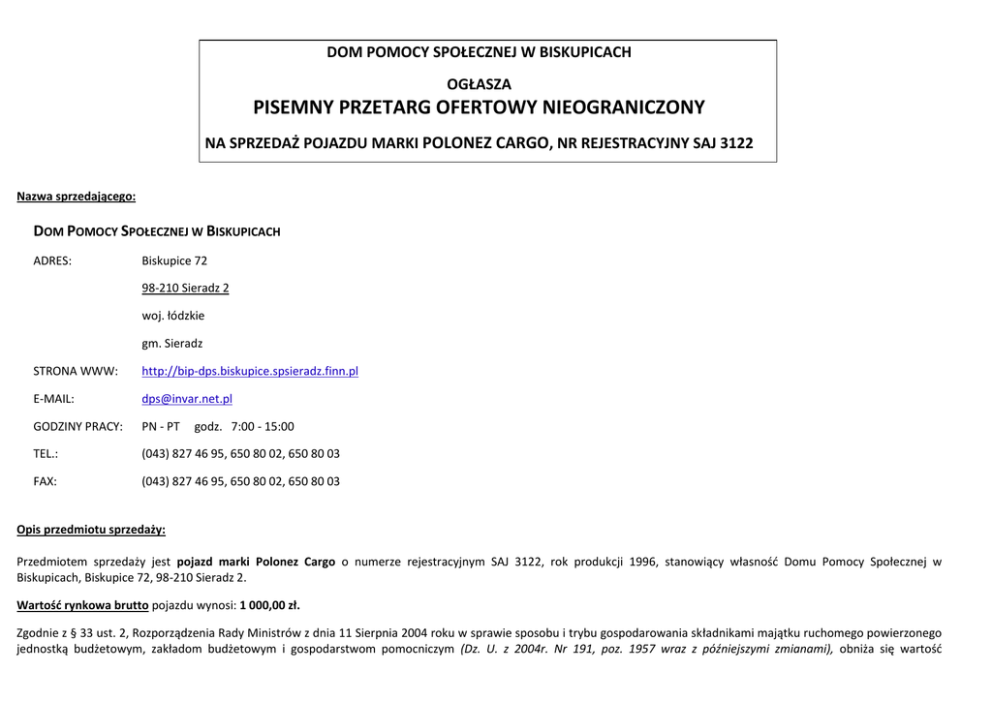 DOM POMOCY SPOŁECZNEJ W BISKUPICACH OGŁASZA PISEMNY PRZETARG OFERTOWY NIEOGRANICZONY NA SPRZEDAŻ POJAZDU MARKI POLONEZ CARGO, NR REJESTRACYJNY SAJ 3122 Nazwa sprzedającego: DOM POMOCY SPOŁECZNEJ W BISKUPICACH ADRES: Biskupice 72 98-210 Sieradz 2 woj. łódzkie gm. Sieradz STRONA WWW: http://bip-dps.biskupice.spsieradz.finn.pl E-MAIL: [email protected] GODZINY PRACY: PN - PT TEL.: (043) 827 46 95, 650 80 02, 650 80 03 FAX: (043) 827 46 95, 650 80 02, 650 80 03 godz. 7:00 - 15:00 Opis przedmiotu sprzedaży: Przedmiotem sprzedaży jest pojazd marki Polonez Cargo o numerze rejestracyjnym SAJ 3122, rok produkcji 1996, stanowiący własnośd Domu Pomocy Społecznej w Biskupicach, Biskupice 72, 98-210 Sieradz 2. Wartośd rynkowa brutto pojazdu wynosi: 1 000,00 zł. Zgodnie z § 33 ust. 2, Rozporządzenia Rady Ministrów z dnia 11 Sierpnia 2004 roku w sprawie sposobu i trybu gospodarowania składnikami majątku ruchomego powierzonego jednostką budżetowym, zakładom budżetowym i gospodarstwom pomocniczym (Dz. U. z 2004r. Nr 191, poz. 1957 wraz z późniejszymi zmianami), obniża się wartośd wywoławczą pojazdu marki FSO Polonez Cargo, nr rejestracyjny SAJ 3122, w stosunku do ustalonej ceny rynkowej pojazdu o 40%, tj. do ceny 600,00 zł (brutto). CENA WYWOŁAWCZA POJAZDU WYNOSI: 600,00 ZŁ Dane identyfikacyjne pojazdu: Marka : FSO POLONEZ Model: CARGO Rodzaj pojazdu: SAMOCHÓD OSOBOWY Nr rejestracyjny: SAJ 3122 Rok produkcji: 1996 Rodzaj nadwozia: ZAMKNIĘTE Nr identyfikacyjny: SUPB08CEBTG838901 Rodzaj silnika: BENZYNOWY Pojemnośd skokowa silnika: 1598,00 cm3 Moc silnika: 57,00 kW Przebieg: 116 687 km Data pierwszej rejestracji: 23.10.1996r. Pojazd można oglądad od poniedziałku do piątku w godzinach 8:00 – 14:00. W sprawie oględzin pojazdu proszę kontaktowad się ze Sławomirem Janiakiem – Pokój Nr 17 Pawilon „B” Domu Pomocy Społecznej w Biskupicach, Tel. 0 43 827 46 95 lub 0 693 333 150. Warunkiem uczestnictwa w przetargu jest: 1. Złożenie oferty na formularzu będącym załącznikiem nr 1 do niniejszego ogłoszenia. w terminie: do dnia 11 Lutego 2010r. do godz. 9:00. w Pawilonie „B” - Administracja Domu Pomocy Społecznej w Biskupicach, Biskupice 72, 98-210 Sieradz 2, pokój nr 17 Formularz ofertowy można pobrad w siedzibie sprzedawcy, tj. w Domu Pomocy Społecznej w Biskupicach, Biskupice 72, 98-210 Sieradz 2, Pawilon „B” - Administracja Pokój Nr 17 lub ze strony internetowej Biuletynu Informacji Publicznych DPS Biskupice: http://bip-dps.biskupice.spsieradz.finn.pl. Oferta powinna zawierad: - Imię i nazwisko lub nazwę oferenta, - adres siedziby oferenta, - numer telefonu kontaktowego, - numer PESEL lub NIP oferenta, - oferowaną cenę, -oświadczenie, że oferent zapoznał się z warunkami przetargu i stanem technicznym przedmiotu sprzedaży oraz przyjmuje warunki bez zastrzeżeo. Do oferty należy dołączyd kopie wniesienia wadium. Każdy oferent może złożyd tylko jedną ofertę. Sprzedający nie dopuszcza składania ofert wariantowych. Oferty należy składad w zaklejonych kopertach z napisem: „Przetarg ofertowy nieograniczony na sprzedaż samochodu FSO Polonez Cargo. 2. Wpłacenie wadium w wysokości 10 % ceny wywoławczej pojazdu , co stanowi 60,00 zł (słownie: sześddziesiąt 00/100 złotych). Wadium należy wpłacid najpóźniej do dnia 11 Lutego 2010 roku do godz. 9:00 w kasie Domu Pomocy Społecznej w Biskupicach. Zwrot wadium nastąpi z kasy Domu Pomocy Społecznej w Biskupicach najpóźniej w dniu 12 Lutego 2010r. Wadium nie odebrane w terminie 7 dni od daty przetargu zwraca się przekazem pocztowym po potrąceniu kosztów opłaty pocztowej. Pozostałe informacje: 1. Otwarcie ofert nastąpi w dniu 11 Lutego 2010 roku o godz. 9:00, w Pawilonie „B” - Administracja pokój nr 17 Domu Pomocy Społecznej w Biskupicach. Wpłacone wadium będzie zaliczone na poczet sprzedaży samochodu dla osoby, która wygra przetarg. Jeżeli osoba ta nie zgłosi się w ustalonym przez Dom Pomocy Społecznej w Biskupicach terminie do zawarcia umowy to wpłacone wadium ulegnie przepadkowi a przetarg zostanie unieważniony. Wadium przepada na rzecz DPS, jeżeli żaden z oferentów nie zaofiaruje ceny nabycia równej co najmniej cenie wywoławczej. 2. Samochód zostanie sprzedany za najwyższą zaoferowaną cenę. Odbiór następuje po wpłacie oferowanej kwoty pomniejszonej o wpłacone wadium. 3. W przypadku zaoferowania takiej samej ceny przez więcej niż jednego oferenta na dany pojazd zostanie dodatkowo przeprowadzona licytacja ustna. 4. W przypadku uchylenia się wygrywającego przetarg od zawarcia umowy kupna – sprzedaży i zapłaty ceny nabycia w terminie nie dłuższym niż 7 dni od daty rozstrzygnięcia przetargu, wadium wpłacone przez wygrywającego przepada na rzecz sprzedawcy. 5. Sprzedawca nie bierze odpowiedzialności za stan techniczny sprzedawanego w przetargu pojazdu. Sprzedawca nie odpowiada za wady fizyczne i braki oraz nie uzupełnia wyposażenia sprzedawanego pojazdu. 6. Oferty cenowe poniżej ceny wywoławczej nie będą rozpatrywane. 7. Wszelkie informacje na temat sprzedaży samochodu uzyskad można w Domu Pomocy Społecznej w Biskupicach, Pawilon „B” - Administracja, pokój Nr 17. Informacji udziela Sławomir Janiak, Tel. 043 827 46 95 lub 693 333 150. 8. Sprzedający zastrzega sobie możliwośd unieważnienia przetargu bez podania przyczyny. (-) Maria Antczak Dyrektor