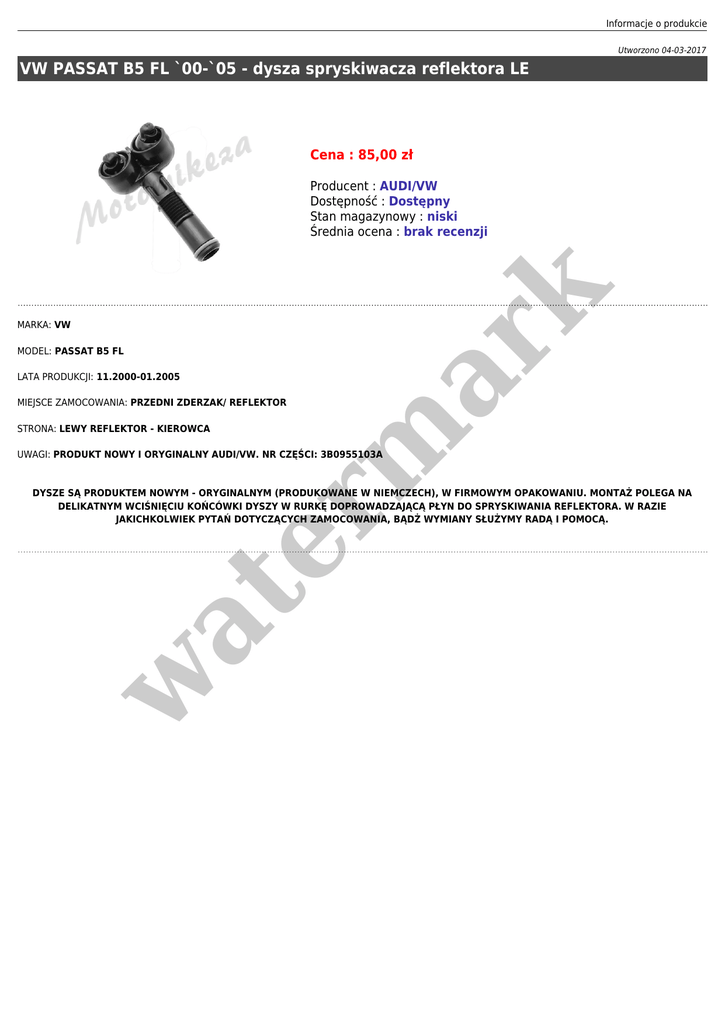 Informacje o produkcie Utworzono 04-03-2017 VW PASSAT B5 FL `00-`05 - dysza spryskiwacza reflektora LE Cena : 85,00 zł MARKA: VW MODEL: PASSAT B5 FL LATA PRODUKCJI: 11.2000-01.2005 er m ar k Producent : AUDI/VW Dostępność : Dostępny Stan magazynowy : niski Średnia ocena : brak recenzji MIEJSCE ZAMOCOWANIA: PRZEDNI ZDERZAK/ REFLEKTOR STRONA: LEWY REFLEKTOR - KIEROWCA UWAGI: PRODUKT NOWY I ORYGINALNY AUDI/VW. NR CZĘŚCI: 3B0955103A w at DYSZE SĄ PRODUKTEM NOWYM - ORYGINALNYM (PRODUKOWANE W NIEMCZECH), W FIRMOWYM OPAKOWANIU. MONTAŻ POLEGA NA DELIKATNYM WCIŚNIĘCIU KOŃCÓWKI DYSZY W RURKĘ DOPROWADZAJĄCĄ PŁYN DO SPRYSKIWANIA REFLEKTORA. W RAZIE JAKICHKOLWIEK PYTAŃ DOTYCZĄCYCH ZAMOCOWANIA, BĄDŻ WYMIANY SŁUŻYMY RADĄ I POMOCĄ.