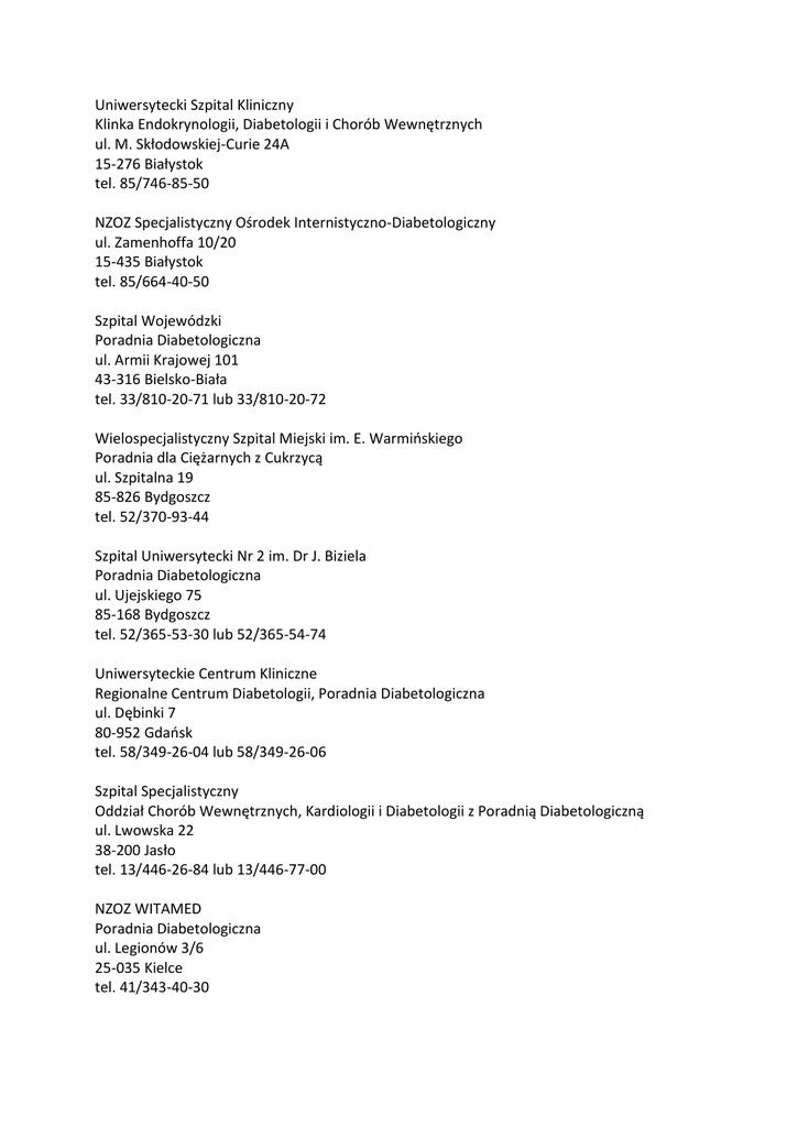 Uniwersytecki Szpital Kliniczny Klinka Endokrynologii, Diabetologii i Chorób Wewnętrznych ul. M. Skłodowskiej-Curie 24A 15-276 Białystok tel. 85/746-85-50 NZOZ Specjalistyczny Ośrodek Internistyczno-Diabetologiczny ul. Zamenhoffa 10/20 15-435 Białystok tel. 85/664-40-50 Szpital Wojewódzki Poradnia Diabetologiczna ul. Armii Krajowej 101 43-316 Bielsko-Biała tel. 33/810-20-71 lub 33/810-20-72 Wielospecjalistyczny Szpital Miejski im. E. Warmińskiego Poradnia dla Ciężarnych z Cukrzycą ul. Szpitalna 19 85-826 Bydgoszcz tel. 52/370-93-44 Szpital Uniwersytecki Nr 2 im. Dr J. Biziela Poradnia Diabetologiczna ul. Ujejskiego 75 85-168 Bydgoszcz tel. 52/365-53-30 lub 52/365-54-74 Uniwersyteckie Centrum Kliniczne Regionalne Centrum Diabetologii, Poradnia Diabetologiczna ul. Dębinki 7 80-952 Gdańsk tel. 58/349-26-04 lub 58/349-26-06 Szpital Specjalistyczny Oddział Chorób Wewnętrznych, Kardiologii i Diabetologii z Poradnią Diabetologiczną ul. Lwowska 22 38-200 Jasło tel. 13/446-26-84 lub 13/446-77-00 NZOZ WITAMED Poradnia Diabetologiczna ul. Legionów 3/6 25-035 Kielce tel. 41/343-40-30 Szpital Uniwersytecki w Krakowie Oddział Kliniczny Kliniki Chorób Metabolicznych ul. Kopernika 15 31-501 Kraków tel. 12/424-83-37 Instytut Medycyny Wsi im W. Chodźki Oddział Diabetologii ul. Jaczewskiego 2 20-090 Lublin tel. 81/718-44-77 lub 609-817-761 Samodzielny Publiczny Szpital Kliniczny Nr 4 Klinika Endokrynologii ul. Jaczewskiego 8 20-954 Lublin tel. 81/724-46-68 lub 81/724-42-74 Centrum Kliniczno-Dydaktyczne Klinika Chorób Wewnętrznych i Diabetologii Ul. Pomorska 251 92-213 Łódź tel. 42/201-43-46 lub 42/291-95-95 (tel. do Poradni Diabetologicznej Uniwersyteckiego Szpitala Klinicznego Nr 1 im N. Barlickiego) Instytut „Centrum Zdrowia Matki Polki” Poradnia Diabetologiczna ul. Rzgowska 281/289 tel. 42/271-17-93 lub 42/201-43-47 Wojewódzki Szpital Specjalistyczny Oddział Endokrynologiczny, Diabetologiczny i Chorób Wewnętrznych ul. Żołnierska 18 10-561 Olsztyn tel. 89/538-62-66 lub 89/538-64-99 Wojewódzkie Centrum Medyczne Poradnia Diabetologiczna al. W. Witosa 26 45-418 Opole tel. 77/452-01-67 Samodzielny Publiczny Szpital Kliniczny nr 1 im. T. Sokołowskiego Pomorskiego Uniwersytetu Medycznego Klinika Diabetologii i Chorób Wewnętrznych ul. Siedlecka 2 72-010 Police tel. 91/425-38-59 lub 695-117-232 Zakład Opieki Zdrowotnej Poznań Jeżyce Szpital im. F. Raszei Klinika Diabetologii ul. Mickiewicza 2 60-834 Poznań tel. 61/848-10-11 wew. 372 lub 373 Ginekologiczno-Położniczy Szpital Kliniczny Uniwersytet Medyczny im. K. Marcinkowskiego Klinika Położnictwa i Chorób Kobiecych ul. Polna 33 60-535 Poznań tel. 61/841-96-41 lub 61/841-92-56 Szpital Wojewódzki nr 2 Poradnia Cukrzycowa ul. Lwowska 60 35-301 Rzeszów tel. 17/866-44-29 lub 17/866-44-30 Samodzielny Publiczny Wojewódzki Szpital Zespolony Oddział Chorób Wewnętrznych i Diabetologii, Poradnia Diabetologiczna ul. Arkońska 4 71-455 Szczecin tel. 91/813-93-77, 91/813-93-78 lub 91/813-97-57 Wojewódzki Szpital Zespolony im. L. Rydygiera Wojewódzkie Centrum Diabetologii ul. Św. Józefa 53/59 87-100 Toruń tel. 56/610-14-19 Samodzielny Publiczny Centralny Szpital Kliniczny Poradnia Diabetologiczna dla Kobiet Ciężarnych ul. Banacha 1 02-097 Warszawa tel. 22/599-10-05 Szpital Kliniczny im. Ks. A. Mazowieckiej II Katedra i Klinika Położnictwa i Ginekologii ul. Karowa 2 00-315 Warszawa tel. 22/596-65-09 Mazowiecki Szpital Bródnowski w Warszawie Sp. z o.o. Zespół Oddziałów Chorób Wewnętrznych i Diabetologii, Poradnia Promowania Rodziny dla Kobiet z Cukrzycą ul. Kondratowicza 8 03-242 Warszawa tel. 22/326-52-44 Uniwersytecki Szpital Kliniczny Klinika Angiologii, Nadciśnienia Tętniczego i Diabetologii ul. Borowska 213 50-556Wrocław tel. 71/733-22-20 Wojewódzki Zespół Specjalistycznej Opieki Zdrowotnej Poradnia Diabetologiczna ul. Dobrzyńska 21/23 50-403 Wrocław tel. 71/774-77-95 lub 71/ 774-77-74 Samodzielny Publiczny Szpital Kliniczny Nr 1 Śląskiego Uniwersytetu Medycznego w Katowicach Oddział Chorób Wewnętrznych i Diabetologicznych Ul. 3-Maja 13-15 41-800 Zabrze tel. 32/370-44-25 Zespół Wojewódzkich Przychodni Specjalistycznych Poradnia Chorych na Cukrzycę Ul. M. Skłodowskiej-Curie 10 41-800 Zabrze tel. 32/271-37-56 Szpital Wojewódzki SP ZOZ Oddział Chorób Wewnętrznych z Pododdziałami: Diabetologii, Endokrynologii i Gastroenterologii, Poradnia Diabetologiczna ul. Zyty 26 65-046 Zielona Góra tel. 68/329-65-16 NZOZ MED-ART Poradnie Specjalistyczne Sp. z o.o. Poradnia Diabetologiczna os. Ks. Władysława 27 44-240 Żory tel. 32/435-78-58
