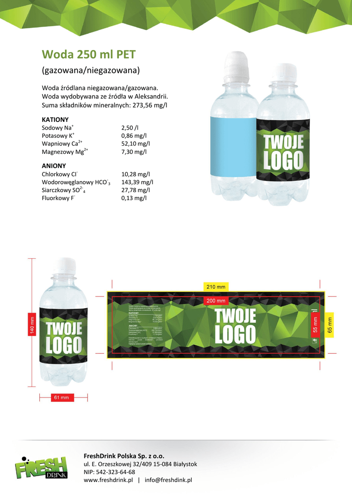 Woda 250 ml PET (gazowana/niegazowana) Woda źródlana niegazowana/gazowana. Woda wydobywana ze źródła w Aleksandrii. Suma składników mineralnych: 273,56 mg/l KATIONY Sodowy Na+ Potasowy K+ Wapniowy Ca2+ Magnezowy Mg2+ 2,50 /l 0,86 mg/l 52,10 mg/l 7,30 mg/l ANIONY Chlorkowy CIWodorowęglanowy HCO-3 Siarczkowy SO2-4 Fluorkowy F- 10,28 mg/l 143,39 mg/l 27,78 mg/l 0,13 mg/l FreshDrink Polska Sp. z o.o. ul. E. Orzeszkowej 32/409 15-084 Białystok NIP: 542-323-64-68 www.freshdrink.pl | [email protected] Pakowanie Ilość butelek w kartonie Ilość kartonów na palecie Ilość butelek na palecie 50 26 1300 Wymiary Wymiar etykiety (cm, wys. x szer.) Wymiar butelki (cm, wys. x szer.) Wymiar zgrzewki (cm, wys. x szer. x dł.) Wymiary palety (cm, wys. x szer. x dł.) 5,5 x 20 netto (6,5 x 21 brutto) 14 x 6,1 40 x 31 x 40 120 x 80 x 120 Waga Waga butelki(kg) Waga zgrzewki (kg) Waga palety (butelki + paleta ,kg) 0,27 13,5 351 + 25 = 376 FreshDrink Polska Sp. z o.o. ul. E. Orzeszkowej 32/409 15-084 Białystok NIP: 542-323-64-68 www.freshdrink.pl | [email protected] Woda 330 ml PET (gazowana/niegazowana) Woda źródlana niegazowana/gazowana. Woda wydobywana ze źródła w Aleksandrii. Suma składników mineralnych: 273,56 mg/l KATIONY Sodowy Na+ Potasowy K+ Wapniowy Ca2+ Magnezowy Mg2+ 2,50 mg/l 0,83 mg/l 52,10 mg/l 7,30 mg/l ANIONY Chlorkowy CIWodorowęglanowy HCO-3 Siarczkowy SO2-4 Fluorkowy F- 10,28 mg/l 143,39 mg/l 27,78 mg/l 0,13 mg/l FreshDrink Polska Sp. z o.o. ul. E. Orzeszkowej 32/409 15-084 Białystok NIP: 542-323-64-68 www.freshdrink.pl | [email protected] Pakowanie Ilość butelek w kartonie Ilość kartonów na palecie Ilość butelek na palecie 50 26 1300 Wymiary Wymiar etykiety (cm, wys. x szer.) Wymiar butelki (cm, wys. x szer.) Wymiar zgrzewki (cm, wys. x szer. x dł.) Wymiary palety (cm, wys. x szer. x dł.) 8,3 x 20 netto 9,3 x 21 brutto) 17,5 x 6,1 40 x 31 x 40 120 x 80 x 120 Waga Waga butelki(kg) Waga zgrzewki (kg) Waga palety (butelki + paleta ,kg) 0,36 18 468 + 25 = 493 FreshDrink Polska Sp. z o.o. ul. E. Orzeszkowej 32/409 15-084 Białystok NIP: 542-323-64-68 www.freshdrink.pl | [email protected] Woda 500 ml PET (gazowana/niegazowana) Woda źródlana niegazowana/gazowana. Woda wydobywana ze źródła w Aleksandrii. Suma składników mineralnych: 273,56 mg/l KATIONY Sodowy Na+ Potasowy K+ Wapniowy Ca2+ Magnezowy Mg2+ 2,50 /l 0,86 mg/l 52,10 mg/l 7,30 mg/l ANIONY Chlorkowy CIWodorowęglanowy HCO-3 Siarczkowy SO2-4 Fluorkowy F- 10,28 mg/l 143,39 mg/l 27,78 mg/l 0,13 mg/l FreshDrink Polska Sp. z o.o. ul. E. Orzeszkowej 32/409 15-084 Białystok NIP: 542-323-64-68 www.freshdrink.pl | [email protected] Pakowanie Ilość butelek w kartonie Ilość kartonów na palecie Ilość butelek na palecie 6 230 1380 Wymiary Wymiar etykiety (cm, wys. x szer.) Wymiar butelki (cm, wys. x szer.) Wymiar zgrzewki (cm, wys. x szer. x dł.) Wymiary palety (cm, wys. x szer. x dł.) 5,8 x 22 netto (6,8 x 23 brutto) 21 x 6,7 21 x 14 x 21 135 x 80 x 120 Waga Waga butelki(kg) Waga zgrzewki (kg) Waga palety (butelki + paleta ,kg) 0,53 3,18 731 + 25 = 756 FreshDrink Polska Sp. z o.o. ul. E. Orzeszkowej 32/409 15-084 Białystok NIP: 542-323-64-68 www.freshdrink.pl | [email protected] Woda 500 ml PET (gazowana/niegazowana) Woda źródlana. Wydobywana ze źródła KRYNKA w Krynkach. Wyprodukowana zgodnie z Rozporządzeniem M.Z. z dnia 29.04.2004 Analiza wody wykonana przez Narodowy Instytut Zdrowia Publicznego - PZH Zakład Tworzyw Uzdrowiskowych z dnia 24.04.2009 KATIONY Sodowy Na+ Potasowy K+ Wapniowy Ca2+ Magnezowy Mg2+ 3,75mg/dm3 0,83 mg/dm3 68,14mg/dm3 18,23mg/dm3 ANIONY Chlorkowy CIWodorowęglanowy HCO-3 Siarczkowy SO2-4 Fluorkowy F- 8,86mg/dm3 250,70mg/dm3 31,80mg/dm3 0,12mg/dm3 FreshDrink Polska Sp. z o.o. ul. E. Orzeszkowej 32/409 15-084 Białystok NIP: 542-323-64-68 www.freshdrink.pl | [email protected] Pakowanie Ilość butelek w kartonie Ilość kartonów na palecie Ilość butelek na palecie Ilość kartoników w poziomie na palecie Ilość warstw na palecie 12 114 1368 19 6 Wymiary Wymiar etykiety (cm, wys. x szer.) Wymiar butelki (cm, wys. x szer.) Wymiar zgrzewki (cm, wys. x szer. x dł.) Wymiary palety (cm, wys. x szer. x dł.) 6,5 x 21 netto (7 x 22 brutto) 22,5 x 6,5 22,5 x 18 x 26 135 x 80 x 120 Waga Waga butelki(kg) Waga zgrzewki (kg) Waga palety (butelki + paleta ,kg) 0,53 6,36 725 + 25 = 750 FreshDrink Polska Sp. z o.o. ul. E. Orzeszkowej 32/409 15-084 Białystok NIP: 542-323-64-68 www.freshdrink.pl | [email protected] Woda 330 ml SZKŁO (gazowana/niegazowana) Woda źródlana. Wydobywana ze źródła KRYNKA w Krynkach. Wyprodukowana zgodnie z Rozporządzeniem M.Z. z dnia 29.04.2004 Analiza wody wykonana przez Narodowy Instytut Zdrowia Publicznego - PZH Zakład Tworzyw Uzdrowiskowych z dnia 24.04.2009 KATIONY Sodowy Na+ Potasowy K+ Wapniowy Ca2+ Magnezowy Mg2+ 3,75mg/dm3 0,83 mg/dm3 68,14mg/dm3 18,23mg/dm3 ANIONY Chlorkowy CIWodorowęglanowy HCO-3 Siarczkowy SO2-4 Fluorkowy F- 8,86mg/dm3 250,70mg/dm3 31,80mg/dm3 0,12mg/dm3 FreshDrink Polska Sp. z o.o. ul. E. Orzeszkowej 32/409 15-084 Białystok NIP: 542-323-64-68 www.freshdrink.pl | [email protected] Pakowanie Ilość butelek w kartonie Ilość kartonów na palecie Ilość butelek na palecie Ilość kartoników w poziomie na palecie Ilość warstw na palecie 12 80 960 16 5 Wymiary Wymiar etykiety (cm, wys. x szer.) Wymiar butelki (cm, wys. x szer.) Wymiar zgrzewki (cm, wys. x szer. x dł.) Wymiary palety (cm, wys. x szer. x dł.) 6,5 x 21 netto (7 x 22 brutto) 19,8 x 6,3 20 x 20 x 26 100 x 80 x 120 Waga Waga butelki(kg) Waga zgrzewki (kg) Waga palety (butelki + paleta ,kg) 6 480 + 25 = 505 0,5 FreshDrink Polska Sp. z o.o. ul. E. Orzeszkowej 32/409 15-084 Białystok NIP: 542-323-64-68 www.freshdrink.pl | [email protected]