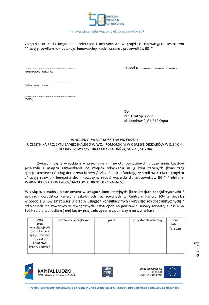 Załącznik nr 7 do Regulaminu rekrutacji i uczestnictwa w projekcie innowacyjno- testującym ”Pracuję-rozwijam kompetencje. Innowacyjny model wsparcia pracowników 50+”. Sopot dn. …………………………………. …………………..………………….…………………..……… (imię/ imiona i nazwisko) …………………..………………….…………………..……… (adres zamieszkania) …………………..………………….…………………..……… (PESEL) Do PBS DGA Sp. z o. o., ul. Junaków 2, 81-812 Sopot WNIOSEK O ZWROT KOSZTÓW PRZEJAZDU UCZESTNIKA PROJEKTU ZAMIESZKAŁEGO W WOJ. POMORSKIM W OBRĘBIE OBSZARÓW WIEJSKICH LUB MIAST Z WYŁĄCZENIEM MIAST GDAOSK, SOPOT, GDYNIA. Zwracam się z wnioskiem o przyznanie mi zwrotu poniesionych przeze mnie kosztów przejazdu z miejsca zamieszkania do miejsca odbywania usług konsultacyjnych (konsultacji specjalistycznych) / usług doradztwa kariery / szkoleo i ich refundację ze środków budżetu projektu „Pracuję–rozwijam kompetencje. Innowacyjny model wsparcia dla pracowników 50+” Projekt nr WND-POKL.08.03.00-22-008/09-00 (POKL.08.01.01-22-343/09). W związku z moim uczestnictwem w usługach konsultacyjnych (konsultacjach specjalistycznych) / usługach doradztwa kariery / szkoleniach realizowanych w Centrum Kariery 50+ z siedzibą w Sopocie ul. Świemirowska 3 oraz w usługach konsultacyjnych (konsultacjach specjalistycznych) / szkoleniach realizowanych w zewnętrznych instytucjach na podstawie umowy zawartej z PBS DGA Spółka z o.o. ponosiłam (-em) koszty przejazdu zgodnie z poniższym zestawieniem: przez przystanek koocowy cena biletu (brutto) Projekt jest współfinansowany ze środków Unii Europejskiej w ramach Europejskiego Funduszu Społecznego. 1 przystanek początkowy Strona Data usług konsultacyjnych (konsultacjach specjalistycznyc h) / usług doradztwa kariery / szkoleo RAZEM zł (brutto) Załączniki: 1. Bilety jednorazowe. 2. Oświadczenie o przejeździe własnym/użyczonym samochodem. 3. Zaświadczenie przewoźnika o cenie najtaoszego jednorazowego biletu, 4. Kserokopię prawa jazdy, 5. Kserokopię dowodu rejestracyjnego własnego/użyczonego samochodu, 6. Kserokopię OC własnego/użyczonego samochodu. 7. Umowę użyczenia samochodu w przypadku osoby nie będącej posiadaczem samochodu. (czytelny podpis Uczestnika/Uczestniczki projektu) Projekt jest współfinansowany ze środków Unii Europejskiej w ramach Europejskiego Funduszu Społecznego. Strona ………………………………………………………… 2 Proszę o wypłatę refundacji kosztów w kasie Centrum Kariery 50+: Wypełnia PBS DGA Spółka z o.o. – Realizator projektu: 1. Na podstawie list obecności potwierdzam uczestnictwo Pani/Pana: …………………………………………………… w usługach konsultacyjnych (konsultacjach specjalistycznych) i usługach doradztwa kariery w dniach: Data zajęd Odbyte usługi konsultacyjnych (konsultacji specjalistycznych) i usługi doradztwa kariery przez Uczestniczkę/ka Projektu 2. 2. Wniosek o zwrot kosztów przejazdu złożył Uczestnik Projektu zamieszkujący województwo pomorskie w obrębie obszarów wiejskich lub miast z wyłączeniem Uczestników Projektu zamieszkujących miasta: Gdaosk, Sopot, Gdynia Wniosek o zwrot kosztów przejazdu złożony w terminie wskazanym w par 8 ust. 13 Regulaminu rekrutacji i uczestnictwa w projekcie innowacyjno- testującym ”Pracuję-rozwijam kompetencje. Innowacyjny model wsparcia pracowników 50+”: ZGODNOŚD □ tak □ nie □ tak □ nie Projekt jest współfinansowany ze środków Unii Europejskiej w ramach Europejskiego Funduszu Społecznego. 3 1. KRYTERIUM Strona Lp. 3. 4. Udokumentowano poniesione koszty przejazdu (do wniosku zwrot kosztów przejazdu dołączono wszystkie wymagane załączniki) zgodnie z par 8 ust.10 Regulaminu rekrutacji i uczestnictwa w projekcie innowacyjnotestującym ”Pracuję-rozwijam kompetencje. Innowacyjny model wsparcia pracowników 50+”: Wniosek o zwrot kosztów przejazdu i załączniki prawidłowe pod względem formalnym i merytorycznym (m.in. przejazd do/z miejsca zamieszkania do/ z miejsca odbywania usług konsultacyjnych / usług doradztwa kariery / szkoleo zgodny z KUK) Sopot, dn. ……………..…………..………… □ tak □ nie □ tak □ nie ……………..……………....………….………..………………………... ( podpis pracownika Centrum Kariery 50+) Zatwierdzam / nie zatwierdzam refundację w wysokości*: ……..……………........………..……………………………………zł (słownie: …........……………………………………………………………………………………………………………………………………………………………………………………). *kwota refundacji (zwrotu) kosztów przejazdu nie może przekraczać 500 PLN na jednego Uczestnika Projektu Uzasadnienie: …………………………………………………………………………………………………………………………………………………………… …………………………………………………………………………………………………………………………………………………………… ……………………………………………………………………………………………………………………………………………………………. ……………………………………………………………………………… (podpis kierownika merytorycznego projektu) Strona 4 Sopot, dn. …........………..……… Projekt jest współfinansowany ze środków Unii Europejskiej w ramach Europejskiego Funduszu Społecznego.