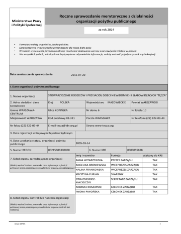 ZŽĐnjŶĞƐƉƌĂǁŽnjĚĂŶŝĞŵĞƌLJƚŽƌLJĐnjŶĞnjĚnjŝĂųĂůŶŽƑĐŝ ŽƌŐĂŶŝnjĂĐũŝƉŽǏLJƚŬƵƉƵďůŝĐnjŶĞŐŽ Ministerstwo Pracy ŝWŽůŝƚLJŬŝ^ƉŽųĞĐnjŶĞũ za rok 2014 • • • • &ŽƌŵƵůĂƌnjŶĂůĞǏLJǁLJƉĞųŶŝđǁũħnjLJŬƵƉŽůƐŬŝŵ͖ ^ƉƌĂǁŽnjĚĂǁĐĂǁLJƉĞųŶŝĂƚLJůŬŽƉƌnjĞnjŶĂĐnjŽŶĞĚůĂŶŝĞŐŽďŝĂųĞƉŽůĂ͖ tƚƌĂŬĐŝĞǁLJƉĞųŶŝĂŶŝĂĨŽƌŵƵůĂƌnjĂŝƐƚŶŝĞũĞŵŽǏůŝǁŽƑđĚŽĚĂǁĂŶŝĂǁŝĞƌƐnjLJŽƌĂnjnjĂǁŝũĂŶŝĂƚĞŬƐƚſǁǁƉŽůĂĐŚ͖ tĞǁƐnjLJƐƚŬŝĐŚƉŽůĂĐŚ͕ǁŬƚſƌLJĐŚŶŝĞďħĚČǁƉŝƐĂŶĞŽĚƉŽǁŝĞĚŶŝĞŝŶĨŽƌŵĂĐũĞ͕ŶĂůĞǏLJǁƐƚĂǁŝđƉŽũĞĚLJŶĐnjLJnjŶĂŬŵLJƑůŶŝŬĂ (--–). Data zamieszczenia sprawozdania 2015-07-20 /͘ĂŶĞŽƌŐĂŶŝnjĂĐũŝƉŽǏLJƚŬƵƉƵďůŝĐnjŶĞŐŽ 1. Nazwa organizacji ^dKtZz^E/ZK/Mt/WZz:/MB//E/t/KDz,/^BKt/z,Ηd%Η 2. Adres siedziby i dane kontaktowe Kraj Gmina WARSZAWACENTRUM hůŝĐĂ<KW/F^< Nr domu 6 Nr lokalu 10 DŝĞũƐĐŽǁŽƑđtZ^t Kod pocztowy 02-321 Poczta WARSZAWA Nr telefonu (22) 822-03-44 Nr faksu (22) 822-03-44 E-mail [email protected] Strona www tecza.org POLSKA Województwo MAZOWIECKIE Powiat WARSZAWSKI ϯ͘ĂƚĂƌĞũĞƐƚƌĂĐũŝǁ<ƌĂũŽǁLJŵZĞũĞƐƚƌnjĞ^ČĚŽǁLJŵ ϰ͘ĂƚĂƵnjLJƐŬĂŶŝĂƐƚĂƚƵƐƵŽƌŐĂŶŝnjĂĐũŝƉŽǏLJƚŬƵ publicznego 5. Numer REGON 00215886300000 ϳ͘^ŬųĂĚŽƌŐĂŶƵnjĂƌnjČĚnjĂũČĐĞŐŽŽƌŐĂŶŝnjĂĐũŝ ;EĂůĞǏLJǁƉŝƐĂđŝŵŝŽŶĂ͕ŶĂnjǁŝƐŬĂŽƌĂnjŝŶĨŽƌŵĂĐũĞŽĨƵŶŬĐũŝ ƉĞųŶŝŽŶĞũƉƌnjĞnjƉŽƐnjĐnjĞŐſůŶLJĐŚĐnjųŽŶŬſǁŽƌŐĂŶƵnjĂƌnjČĚnjĂũČĐĞŐŽͿ 2005-03-14 6. Numer KRS 0000095698 /ŵŝħŝŶĂnjǁŝƐŬŽ Funkcja Wpisany do KRS ANNA WITARZEWSKA WZ^Zh TAK ANGELIKA BRONIEWSKA t/WZ^Zh TAK HALINA FRANKOWSKA t/WZ^Zh TAK KRYSTYNA FURJAN SKARBNIK TAK EWA OSIEWICZMACIEJCZYK ^<ZdZZh TAK ANDRZEJ KRAJEWSKI BKE<Zh TAK /tKEW/tKF^< BKE<Zh TAK ϴ͘^ŬųĂĚŽƌŐĂŶƵŬŽŶƚƌŽůŝůƵďŶĂĚnjŽƌƵŽƌŐĂŶŝnjĂĐũŝ ;EĂůĞǏLJǁƉŝƐĂđŝŵŝŽŶĂ͕ŶĂnjǁŝƐŬĂŽƌĂnjŝŶĨŽƌŵĂĐũĞŽĨƵŶŬĐũŝ ƉĞųŶŝŽŶĞũƉƌnjĞnjƉŽƐnjĐnjĞŐſůŶLJĐŚĐnjųŽŶŬſǁŽƌŐĂŶƵŬŽŶƚƌŽůŝůƵď nadzoru) Druk: MPiPS 1 9. Cele statutowe organizacji ;EĂůĞǏLJŽƉŝƐĂđĐĞůĞŶĂƉŽĚƐƚĂǁŝĞƐƚĂƚƵƚƵŽƌŐĂŶŝnjĂĐũŝͿ Druk: MPiPS /ŵŝħŝŶĂnjǁŝƐŬŽ Funkcja Wpisany do KRS PIOTR SKOLUD WZtKE/z KRAJOWEJ KOMISJI REWIZYJNEJ TAK TADEUSZ CIEPLIK ǁŝĐĞƉƌnjĞǁŽĚŶŝĐnjČĐLJ Krajowej Komisji Rewizyjnej TAK ZIEMOWIT WARDECKI sekretarz Krajowej Komisji Rewizyjnej TAK ϭͿĚnjŝĂųĂůŶŽƑđŶĂƌnjĞĐnjĚŽďƌĂĚnjŝĞĐŝŝŽƐſďŶŝĞǁŝĚŽŵLJĐŚŝƐųĂďŽǁŝĚnjČĐLJĐŚ͕ ǁƐnjĐnjĞŐſůŶŽƑĐŝŶŝĞǁŝĚŽŵLJĐŚŝƐųĂďŽǁŝĚnjČĐLJĐŚnjĞƐƉƌnjħǏŽŶLJŵŝ ŶŝĞƉĞųŶŽƐƉƌĂǁŶŽƑĐŝĂŵŝ͕ϮͿŶŝĞƐŝĞŶŝĞǁƐnjĞůŬŝĞũ͕ŬŽŵƉůĞŬƐŽǁĞũ͕ specjalistycznej i profesjonalnej pomocy dzieciom i osobom niewidomym i ƐųĂďŽǁŝĚnjČĐLJŵ͕ǁƐnjĐnjĞŐſůŶŽƑĐŝĚnjŝĞĐŝŽŵŝŽƐŽďŽŵŶŝĞǁŝĚŽŵLJŵŝ ƐųĂďŽǁŝĚnjČĐLJŵnjĞƐƉƌnjħǏŽŶLJŵŝŶŝĞƉĞųŶŽƐƉƌĂǁŶŽƑĐŝĂŵŝ͕ϯͿŶŝĞƐŝĞŶŝĞ ǁƐnjĞĐŚƐƚƌŽŶŶĞũƉŽŵŽĐLJ͕njĂƉĞǁŶŝĂŶŝĞŽƉŝĞŬŝŝƉŽŵŽĐƐƉŽųĞĐnjŶĂƌŽĚnjŝŶŽŵ ǁLJĐŚŽǁƵũČĐLJŵĚnjŝĞĐŝŝŽƐŽďLJŶŝĞǁŝĚŽŵĞŝƐųĂďŽǁŝĚnjČĐĞŽƌĂnj ǁLJƌſǁŶLJǁĂŶŝĞǏLJĐŝŽǁLJĐŚƐnjĂŶƐƚLJĐŚƌŽĚnjŝŶ͕ǁƚLJŵƉŽŵŽĐŝǁƐƉŝĞƌĂŶŝĞǁ ŽƐŝČŐĂŶŝƵǁŝħŬƐnjĞũƐĂŵŽĚnjŝĞůŶŽƑĐŝ͕ŶŝĞnjĂůĞǏŶŽƑĐŝǁǏLJĐŝƵŝůĞƉƐnjĞũũĂŬŽƑĐŝ ŝĐŚǏLJĐŝĂ͕ϰͿĚnjŝĂųĂůŶŽƑđĐŚĂƌLJƚĂƚLJǁŶĂŶĂƌnjĞĐnjĚnjŝĞĐŝŝŽƐſďŶŝĞǁŝĚŽŵLJĐŚŝ ƐųĂďŽǁŝĚnjČĐLJĐŚ͕ǁƐnjĐnjĞŐſůŶŽƑĐŝnjĞƐƉƌnjħǏŽŶLJŵŝŶŝĞƉĞųŶŽƐƉƌĂǁŶŽƑĐŝĂŵŝ oraz ich rodzin,5) ochrona zdrowia, leczenie i rehabilitacja dzieci i osób, w ƐnjĐnjĞŐſůŶŽƑĐŝŶŝĞǁŝĚŽŵLJĐŚŝƐųĂďŽǁŝĚnjČĐLJĐŚnjĞƐƉƌnjħǏŽŶLJŵŝ ŶŝĞƉĞųŶŽƐƉƌĂǁŶŽƑĐŝĂŵŝŽƌĂnjĚnjŝĞĐŝnjĂŐƌŽǏŽŶLJĐŚƵƚƌĂƚČǁŝĚnjĞŶŝĂůƵď zaburzeniami widzenia,6) promowanie zdrowia, edukacja zdrowotna, ŬƐnjƚĂųƚŽǁĂŶŝĞƉŽƐƚĂǁŝnjĂĐŚŽǁĂŷƉƌŽnjĚƌŽǁŽƚŶLJĐŚ͕njǁųĂƐnjĐnjĂǁ ĚnjŝĞĚnjŝŶĂĐŚnjǁŝČnjĂŶLJĐŚnjǁŝĚnjĞŶŝĞŵ͕njĂďƵƌnjĞŶŝĂŵŝǁŝĚnjĞŶŝĂ͕ƉŽƉƌĂǁČ ǁŝĚnjĞŶŝĂ͕ƉŽƉƌĂǁČũĂŬŽƑĐŝǏLJĐŝĂŽƐſďŶŝĞǁŝĚŽŵLJĐŚŝƐųĂďŽǁŝĚnjČĐLJĐŚ͕ϳͿ ŶĂƵŬĂŝĞĚƵŬĂĐũĂ͕ĚnjŝĂųĂůŶŽƑđŽƑǁŝĂƚŽǁĂ͕ǁLJĐŚŽǁĂŶŝĞĚnjŝĞĐŝŝŽƐſď͕ ƉƌnjĞĚĞǁƐnjLJƐƚŬŝŵŶŝĞǁŝĚŽŵLJĐŚŝƐųĂďŽǁŝĚnjČĐLJĐŚnjĞƐƉƌnjħǏŽŶLJŵŝ ŶŝĞƉĞųŶŽƐƉƌĂǁŶŽƑĐŝĂŵŝ͕ϴͿƵƉŽǁƐnjĞĐŚŶŝĂŶŝĞǁŝĞĚnjLJŶĂƚĞŵĂƚ diagnostyki, leczenia, terapii, edukacji, rehabilitacji, ochrony zdrowia oraz kompleksowej pomocy dzieciom i osobom z njĂďƵƌnjĞŶŝĂŵŝǁŝĚnjĞŶŝĂ͕ǁƚLJŵƉƌŽǁĂĚnjĞŶŝĞĚnjŝĂųĂůŶŽƑĐŝĞĚƵŬĂĐLJũŶĞũŝ szkoleniowej, w stosunku do rodziców i osób zawodowo njĂũŵƵũČĐLJĐŚƐŝħƉƌĂĐČnjŶŝĞƉĞųŶŽƐƉƌĂǁŶLJŵŝ͕ϵͿ ƉƌnjLJŐŽƚŽǁLJǁĂŶŝĞŝŬƐnjƚĂųĐĞŶŝĞŬŽŵƉĞƚĞŶƚŶLJĐŚŬĂĚƌƉƌĂĐƵũČĐLJĐŚǁ ŽďƐnjĂƌnjĞŽĐŚƌŽŶLJnjĚƌŽǁŝĂ͕ĞĚƵŬĂĐũŝ͕ƉŽŵŽĐLJƐƉŽųĞĐnjŶĞũŝ ƉŽŵŽĐLJŶŝĞƉĞųŶŽƐƉƌĂǁŶLJŵ͕ǁƚLJŵƌſǁŶŝĞǏƉŽŵĂŐĂũČĐLJĐŚ ĚnjŝĞĐŝŽŵŝŽƐŽďŽŵŶŝĞǁŝĚŽŵLJŵŝƐųĂďŽǁŝĚnjČĐLJŵ͕ǁƐnjĐnjĞŐſůŶŽƑĐŝ ŽƐŽďŽŵnjĞƐ