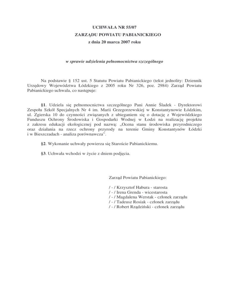 UCHWAŁA NR 55/07 ZARZ DU POWIATU PABIANICKIEGO z dnia 20 marca 2007 roku w sprawie udzielenia pełnomocnictwa szczególnego Na podstawie § 152 ust. 5 Statutu Powiatu Pabianickiego (tekst jednolity: Dziennik Urz dowy Województwa Łódzkiego z 2005 roku Nr 326, poz. 2984) Zarz d Powiatu Pabianickiego uchwala, co nast puje: §1. Udziela si pełnomocnictwa szczególnego Pani Annie ladek - Dyrektorowi Zespołu Szkół Specjalnych Nr 4 im. Marii Grzegorzewskiej w Konstantynowie Łódzkim, ul. Zgierska 10 do czynno ci zwi zanych z ubieganiem si o dotacj z Wojewódzkiego Funduszu Ochrony rodowiska i Gospodarki Wodnej w Łodzi na realizacj projektu z zakresu edukacji ekologicznej pod nazw : „Ocena stanu rodowiska przyrodniczego oraz działania na rzecz ochrony przyrody na terenie Gminy Konstantynów Łódzki i w Bieszczadach - analiza porównawcza”. §2. Wykonanie uchwały powierza si Staro cie Pabianickiemu. §3. Uchwała wchodzi w ycie z dniem podj cia. Zarz d Powiatu Pabianickiego: / - / Krzysztof Habura - starosta / - / Irena Grenda - wicestarosta / - / Magdalena Werstak - członek zarz du / - / Tadeusz Rosiak - członek zarz du / - / Robert Rz dzi ski - członek zarz du