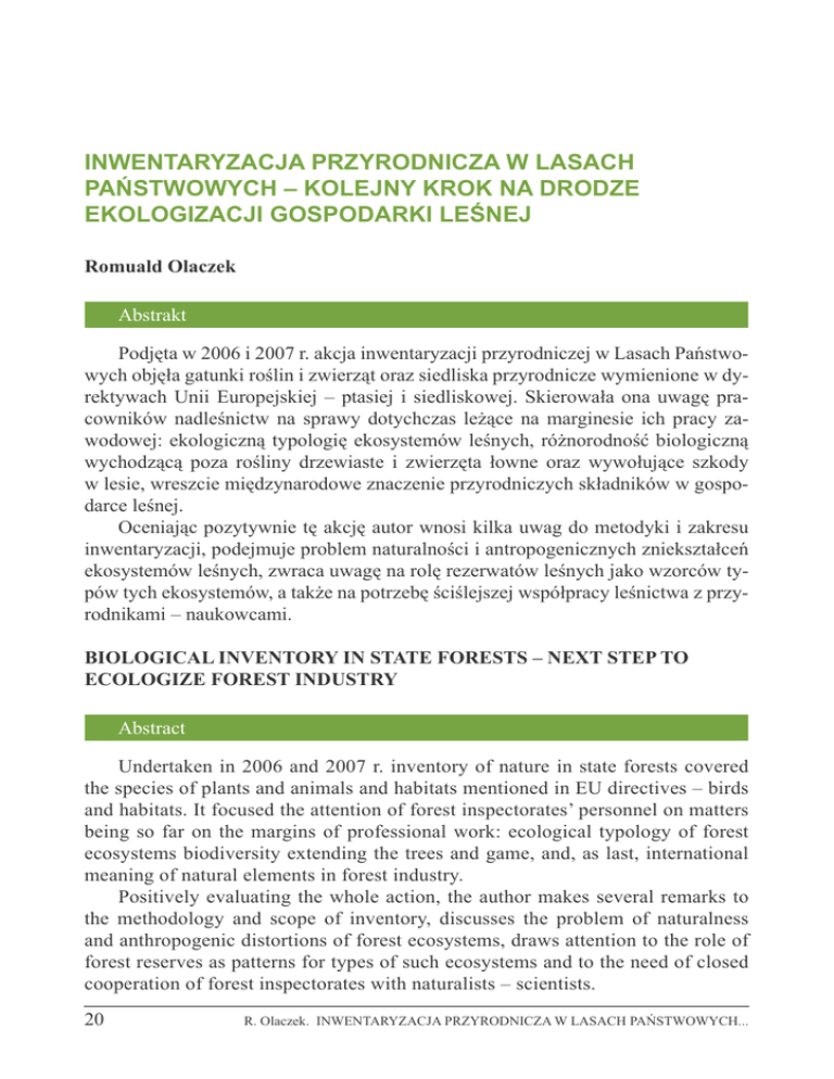 INWENTARYZACJA PRZYRODNICZA W LASACH PAŃSTWOWYCH – KOLEJNY KROK NA DRODZE EKOLOGIZACJI GOSPODARKI LEŚNEJ Romuald Olaczek Abstrakt Podjęta w 2006 i 2007 r. akcja inwentaryzacji przyrodniczej w Lasach Państwowych objęła gatunki roślin i zwierząt oraz siedliska przyrodnicze wymienione w dyrektywach Unii Europejskiej – ptasiej i siedliskowej. Skierowała ona uwagę pracowników nadleśnictw na sprawy dotychczas leżące na marginesie ich pracy zawodowej: ekologiczną typologię ekosystemów leśnych, różnorodność biologiczną wychodzącą poza rośliny drzewiaste i zwierzęta łowne oraz wywołujące szkody w lesie, wreszcie międzynarodowe znaczenie przyrodniczych składników w gospodarce leśnej. Oceniając pozytywnie tę akcję autor wnosi kilka uwag do metodyki i zakresu inwentaryzacji, podejmuje problem naturalności i antropogenicznych zniekształceń ekosystemów leśnych, zwraca uwagę na rolę rezerwatów leśnych jako wzorców typów tych ekosystemów, a także na potrzebę ściślejszej współpracy leśnictwa z przyrodnikami – naukowcami. BIOLOGICAL INVENTORY IN STATE FORESTS – NEXT STEP TO ECOLOGIZE FOREST INDUSTRY Abstract Undertaken in 2006 and 2007 r. inventory of nature in state forests covered the species of plants and animals and habitats mentioned in EU directives – birds and habitats. It focused the attention of forest inspectorates’ personnel on matters being so far on the margins of professional work: ecological typology of forest ecosystems biodiversity extending the trees and game, and, as last, international meaning of natural elements in forest industry. Positively evaluating the whole action, the author makes several remarks to the methodology and scope of inventory, discusses the problem of naturalness and anthropogenic distortions of forest ecosystems, draws attention to the role of forest reserves as patterns for types of such ecosystems and to the need of closed cooperation of forest inspectorates with naturalists – scientists. 20 R. Olaczek. INWENTARYZACJA PRZYRODNICZA W LASACH PAŃSTWOWYCH... Powszechna inwentaryzacja przyrodnicza – niespełnione marzenie przyrodników Powszechna inwentaryzacja przyrodnicza jest niespełnionym marzeniem osób i instytucji działających na rzecz ochrony przyrody. Sądzi się bowiem, że nasza wiedza o wartościach przyrodniczych i krajobrazowych Polski jest wciąż niepełna lub niedość aktualna, albowiem powstawała w różnym czasie i w sposób do pewnego stopnia przypadkowy. W miarę pełne i systematycznie aktualizowane oraz publikowane dane obejmują tylko część parków narodowych i krajobrazowych, a w skali kraju wybrane grupy organizmów, np. niektóre ptaki, nietoperze, niewielką liczbę gatunków roślin objętych monitoringiem przyrodniczym. Wśród licznych monografii regionalnych bardzo cenne są te, które wnoszą nowe, oryginalne dane i ujmują w całość wartości przyrody, krajobrazu i środowiska, (np. Nowak red. 1977, Jasnowska red. 2002, Borówka i in. 2002, Fabiszewski red. 2005); powstają one tam, gdzie działa prężne, ambitne środowisko naukowe i oświecona administracja. Istnieją wprawdzie – krajowe lub regionalne – katalogi i zbiory informacji o cennych obszarach i obiektach przyrodniczych, zwykle ograniczone do już chronionych lub przewidywanych do objęcia prawną ochroną. Do takich wydawnictw należą Krajobrazy Polski Stefana Jarosza (I wydanie 1954, II 1956, III 1976) oraz katalogi obszarów chronionych (Czubiński i in. 1977, Radziejowski red. 1996, Rąkowski red. 2002, Żurek 2006). W 1971 r., kierowane przez Stanisława Drewniaka Wydawnictwo Ligi Ochrony Przyrody podjęło ambitne zadanie publikacji krajowego, ale rozpisanego na województwa, popularno-naukowego przewodnika po wartościach przyrody i środowiska. Była to seria Nasza przyroda – przewodnik po województwie…, której poszczególne tomy (wyszło ich 16, ostatni w roku 1990) były opracowane według jednolitych zasad. Wszystkie te i podobne im wydawnictwa raczej sumowały stan wiedzy, o której mamy prawo sądzić, iż mogła być niekompletna, niż odkrywały nowe wartości. Także publikacje powstałe po 1990 r., czasami z inicjatywy i za pieniądze NFOŚiGW, IUCN, WWF itp. (np. Gromadzki i in. 1994, Liro red. 1995, Dyduch-Falniowska i in. 1999, Andrzejewski i Weigle red. 2003) z założenia opierały się na już istniejących bazach informacji pierwotnej, wykluczając poszukiwanie w terenie nowych obiektów. Dziwnym trafem, syntezy wiedzy sponsorowano dość chętnie, widocznie doceniano uzyskany wcześniej stopień poznania przyrody Polski; żaden zaś sponsor krajowy ani zagraniczny nie był skłonny do wspierania działań podstawowych – poszukiwań w terenie i tworzenia nowej informacji źródłowej. Taką postawę zajęło też leśnictwo przy sporządzaniu programów ochrony przyrody. Programy te wnoszą niewiele oryginalnych treści, raczej sumują tylko istniejące wiadomości o obiektach chronionych na obszarze nadleśnictwa. Inwentaryzacja naszych zasobów dziedzictwa przyrodniczego pozostaje daleko w tyle za inwentaryzacją dziedzictwa kulturowego. Nie dorobiliśmy się wyspecjalizowanej służby dokumentacji przyrody, ani odpowiednika Katalogu zabytków sztuki. Jest to tym bardziej przykre, że przyroda nie jest układem statycznym, jej Studia i Materiały Centrum Edukacji Przyrodniczo-Leśnej R. 9. Zeszyt 2/3 (16) / 2007 21 składniki zmieniają się, przemieszczają, niektóre zamierają, pojawiają się nowe wartości realne lub nominalne (wskutek zmiany kryteriów oceny), część z nich może zginąć poza świadomością ich istnienia i bez możliwości ochrony. Tymczasem w szybkim tempie zwiększa się zapotrzebowanie na wiedzę o wartościach przyrodniczych w związku z prawnym obowiązkiem sporządzania ocen oddziaływania na środowisko, nowymi inwestycjami, zwłaszcza drogowymi, zmianami własności gruntów i ciągłymi zmianami prawa w zakresie gospo