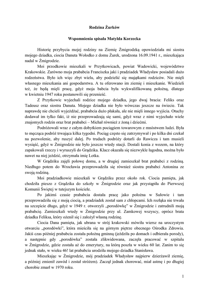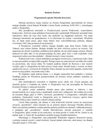 Rodzina Żurków Wspomnienia spisała Matylda Korzecka Historię przybycia mojej rodziny na Ziemię Żmigrodzką opowiedziała mi siostra mojego dziadka, ciocia Danuta Wołodko z domu Żurek, urodzona 16.09.1941 r., mieszkająca nadal w Żmigrodzie. Moi przodkowie mieszkali w Przytkowicach, powiat Wadowicki, województwo Krakowskie. Zarówno moja prababcia Franciszka jaki i pradziadek Władysław posiadali dużo rodzeństwa. Było ich więc zbyt wielu, aby podzielić się majątkami rodziców. Nie mięli własnego mieszkania ani gospodarstwa. A tu oferowano im ziemię i mieszkanie. Wiedzieli też, że będą mięli pracę, gdyż moja babcia była wykwalifikowaną położną, dlatego w kwietniu 1947 roku postanowili się przenieść. Z Przytkowic wyjechali rodzice mojego dziadka, jego dwaj bracia: Feliks oraz Tadeusz oraz siostra Danuta. Mojego dziadka nie było wówczas jeszcze na świecie. Tak naprawdę nie chcieli wyjeżdżać, prababcia dużo płakała, ale nie mięli innego wyjścia. Otuchy dodawał im tylko fakt, iż nie przeprowadzają się sami, gdyż wraz z nimi wyjechało wiele znajomych rodzin oraz brat prababci – Michał również z żoną i dziećmi. Podróżowali wraz z całym dobytkiem pociągiem towarowym z mnóstwem ludzi. Była to męcząca podróż trwająca kilka tygodni. Pociąg często się zatrzymywał i po kilka dni czekał na pozwolenie, aby ruszyć dalej. Po trudach podróży dotarli do Rawicza i tam musieli wysiąść, gdyż w Żmigrodzie nie było jeszcze wtedy stacji. Dostali konia z wozem, na który zapakowali rzeczy i wyruszyli do Grądzika. Klacz okazała się niezwykle łagodna, można było nawet na niej jeździć, otrzymała imię Lotka. W Grądziku zajęli połowę domu, a w drugiej zamieszkał brat prababci z rodziną. Niedługo potem do Wrocławia przeprowadziła się również siostra prababci Antonina ze swoją rodziną. Moi pradziadkowie mieszkali w Grądziku przez około rok. Ciocia pamięta, jak chodziła pieszo z Grądzika do szkoły w Żmigrodzie oraz jak przystąpiła do Pierwszej Komunii Świętej w tutejszym kościele. Po jakimś czasie prababcia dostała pracę jako położna w Sułowie i tam przeprowadziła się z moją ciocią, a pradziadek został sam z chłopcami. Ich rozłąka nie trwała na szczęście długo, gdyż w 1949 r. otworzyli „porodówkę” w Żmigrodzie i zatrudnili moją prababcię. Zamieszkali wtedy w Żmigrodzie przy ul. Zamkowej wszyscy, oprócz brata dziadka Feliksa, który ożenił się i założył własną rodzinę. Ciocia Dana pamięta, jak ubrana w strój krakowski mówiła wiersz na uroczystym otwarciu „porodówki”, która mieściła się na górnym piętrze obecnego Ośrodka Zdrowia. Jakiś czas później prababcia została położną gminną (jeździła po domach i odbierała porody), a następnie gdy „porodówka” została zlikwidowana, zaczęła pracować w szpitalu w Żmigrodzie, gdzie została aż do emerytury, na którą poszła w wieku 60 lat. Zanim to się jednak stało, w wieku 46! lat prababcia urodziła mojego dziadka Stanisława. Mieszkając w Żmigrodzie, mój pradziadek Władysław najpierw dzierżawił ziemię, a później zmienił zawód i został stróżem). Zaczął jednak chorować, miał astmę i po długiej chorobie zmarł w 1970 roku. 1 Prababcia żyła znacznie dłużej. Zmarła w 2000 roku w wieku 93 lat. Prababcia Frania była ukochaną babcią mojej mamy Agnieszki. Chociaż miała 70 lat, gdy urodziła się moja mama, to była jeszcze na tyle silna i sprawna, że zajmowała się nią w okresie niemowlęcym oraz przez wiele następnych lat. Mama pamięta, jak babcia śpiewała piosenki oraz czytała bajki jej i młodszemu rodzeństwu. Po prababci pozostało nam kilka pamiątek. Najcenniejszą jest dyplom położnej, który prababcia uzyskała w 1938 roku. Dobrze jest znać losy swojej rodziny… Na zdjęciu prababcia Franciszka Żurek, pierwsza z lewej strony Na zdjęciu prababcia Franciszka Żurek, pradziadek Władysław Żurek oraz ich synowie Feliks i Tadeusz Na zdjęciu prababcia Franciszka Żurek, pradziadek Władysław Żurek oraz ich córka Danuta 2