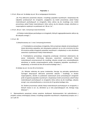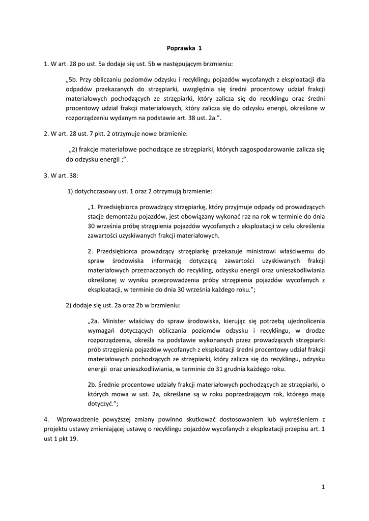 Poprawka 1 1. W art. 28 po ust. 5a dodaje się ust. 5b w następującym brzmieniu: „5b. Przy obliczaniu poziomów odzysku i recyklingu pojazdów wycofanych z eksploatacji dla odpadów przekazanych do strzępiarki, uwzględnia się średni procentowy udział frakcji materiałowych pochodzących ze strzępiarki, który zalicza się do recyklingu oraz średni procentowy udział frakcji materiałowych, który zalicza się do odzysku energii, określone w rozporządzeniu wydanym na podstawie art. 38 ust. 2a.”. 2. W art. 28 ust. 7 pkt. 2 otrzymuje nowe brzmienie: „2) frakcje materiałowe pochodzące ze strzępiarki, których zagospodarowanie zalicza się do odzysku energii ;”. 3. W art. 38: 1) dotychczasowy ust. 1 oraz 2 otrzymują brzmienie: „1. Przedsiębiorca prowadzący strzępiarkę, który przyjmuje odpady od prowadzących stacje demontażu pojazdów, jest obowiązany wykonać raz na rok w terminie do dnia 30 września próbę strzępienia pojazdów wycofanych z eksploatacji w celu określenia zawartości uzyskiwanych frakcji materiałowych. 2. Przedsiębiorca prowadzący strzępiarkę przekazuje ministrowi właściwemu do spraw środowiska informację dotyczącą zawartości uzyskiwanych frakcji materiałowych przeznaczonych do recykling, odzysku energii oraz unieszkodliwiania określonej w wyniku przeprowadzenia próby strzępienia pojazdów wycofanych z eksploatacji, w terminie do dnia 30 września każdego roku.”; 2) dodaje się ust. 2a oraz 2b w brzmieniu: „2a. Minister właściwy do spraw środowiska, kierując się potrzebą ujednolicenia wymagań dotyczących obliczania poziomów odzysku i recyklingu, w drodze rozporządzenia, określa na podstawie wykonanych przez prowadzących strzępiarki prób strzępienia pojazdów wycofanych z eksploatacji średni procentowy udział frakcji materiałowych pochodzących ze strzępiarki, który zalicza się do recyklingu, odzysku energii oraz unieszkodliwiania, w terminie do 31 grudnia każdego roku. 2b. Średnie procentowe udziały frakcji materiałowych pochodzących ze strzępiarki, o których mowa w ust. 2a, określane są w roku poprzedzającym rok, którego mają dotyczyć.”; 4. Wprowadzenie powyższej zmiany powinno skutkować dostosowaniem lub wykreśleniem z projektu ustawy zmieniającej ustawę o recyklingu pojazdów wycofanych z eksploatacji przepisu art. 1 ust 1 pkt 19. 1 Uzasadnienie Poprawka ma na celu uporządkowanie i ujednolicenie w skali kraju metody obliczania poziomów odzysku i recyklingu dla pozostałości po demontażu kierowanych do strzępiarek. Poprawka spowoduje zredukowanie obowiązków biurokratycznych po stronie prowadzących strzępiarki i wyeliminuje problemy związane z wyliczaniem osiągniętych poziomów odzysku i recyklingu przez prowadzących stacje demontażu. Jednocześnie zmiana umożliwi Ministrowi Środowiska uzyskanie z mocy prawa danych nt. przeprowadzonych na terenie kraju prób strzępienia pojazdów wycofanych z eksploatacji i udziałów poszczególnych frakcji materiałowych powstających w procesie strzępienia, niezbędnych do wypełnienia okresowych sprawozdań dla Komisji Europejskiej w sprawie realizacji postanowień dyrektywy 2000/53/WE w sprawie pojazdów wycofanych z eksploatacji. Obecnie obowiązujące przepisy zobowiązują prowadzącego strzępiarkę do wykonywania okresowych prób strzępienia, a następnie przekazywania każdemu prowadzącemu stację demontażu pojazdów informacji o wynikach tych prób. Oznacza to konieczność przekazywania setek informacji przez każdą ze strzępiarek i jednocześnie otrzymywania przez prowadzących stacje demontażu informacji od wielu strzępiarek. Informacja z mocy przepisów nie jest jednak przekazywana Ministrowi Środowiska, co oznacza, że Minister Środowiska nie posiada informacji, które powinien uwzględnić w sprawozdaniu do Komisji Europejskiej. Prowadzący stacje demontażu pojazdów, jeżeli przekazują pozostałości po demontażu pojazdów za pośrednictwem zakładów przerobu złom lub do kilku strzępiarek zostają zobligowani do prowadzenia dodatkowej ewidencji w oparciu o dane, które często są niemożliwe do uzyskania. Ponadto prowadzący strzepiarkę, który wykonał ostatnią próbę strzępienia w 2014 roku przekazał informację o wynikach próby strzępienia w terminie 30 dni tylko tym prowadzącym stacje demontażu, którzy bezpośrednio dostarczali odpady. Następną informację przekaże za 5 lat. Przedsiębiorca prowadzący strzępiarkę nie ma też obowiązku przekazywać informacji prowadzącym stacje demontażu, którzy nie dostarczali odpadów do strzępienia bezpośrednio. Nie otrzymają wyników próby strzępienia również ci przedsiębiorcy, którzy rozpoczęli przekazywanie odpadów w roku 2015 lub w późniejszym okresie - nie otrzymają oni wyników np. za 2015r Ponadto przedsiębiorca prowadzący strzepiarkę nie ma obowiązku przekazywania informacji o przeznaczeniu poszczególnych frakcji, tak więc część prowadzących stację demontażu nie będzie w stanie obliczyć osiąganych poziomów odzysku/recyklingu już za 2015 rok. Z tych względów proponowane zmiany są konieczne. Proponowana zmiana spowoduje, że prowadzący strzępiarki będą przekazywać informacje o frakcjach uzyskanych w wyniku wykonanych prób strzępienia do Ministra Środowiska. Dane posłużą Ministrowi Środowiska do wyliczenia średniego udziału frakcji przeznaczanych do recyklingu, średniego udziału frakcji przeznaczonych do odzysku energii oraz frakcji przeznaczonych do unieszkodliwiania. Średnie wartości dla recyklingu i odzysku energii oraz unieszkodliwiania zostaną wskazane w rozporządzeniu Ministra Środowiska i będą stanowić jednolitą wartość dla wszystkich podmiotów prowadzących stacje demontażu pojazdów do wyliczenia poziomu odzysku i recyklingu. To rozwiązanie spowoduje, że prowadzący stacje demontażu pojazdów będą mieli informacje niezbędne do wyliczenia osiągniętych