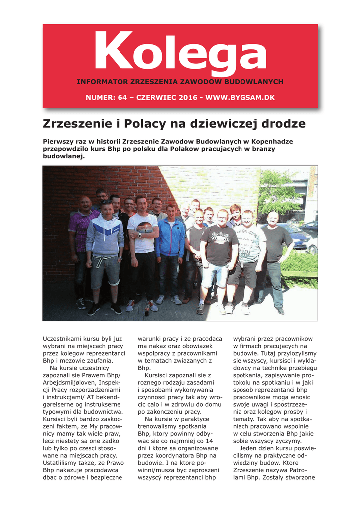 Kolega INFORMATOR ZRZESZENIA ZAWODOW BUDOWLANYCH NUMER: 64 – CZERWIEC 2016 - WWW.BYGSAM.DK Zrzeszenie i Polacy na dziewiczej drodze Pierwszy raz w historii Zrzeszenie Zawodow Budowlanych w Kopenhadze przepowdzilo kurs Bhp po polsku dla Polakow pracujacych w branzy budowlanej. Uczestnikami kursu byli juz wybrani na miejscach pracy przez kolegow reprezentanci Bhp i mezowie zaufania. Na kursie uczestnicy zapoznali sie Prawem Bhp/ Arbejdsmiljøloven, Inspekcji Pracy rozporzadzeniami i instrukcjami/ AT bekendgørelserne og instrukserne typowymi dla budownictwa. Kursisci byli bardzo zaskoczeni faktem, ze My pracownicy mamy tak wiele praw, lecz niestety sa one zadko lub tylko po czesci stosowane na miejscach pracy. Ustatlilismy takze, ze Prawo Bhp nakazuje pracodawca dbac o zdrowe i bezpieczne warunki pracy i ze pracodaca ma nakaz oraz obowiazek wspolpracy z pracownikami w tematach zwiazanych z Bhp. Kursisci zapoznali sie z roznego rodzaju zasadami i sposobami wykonywania czynnosci pracy tak aby wrocic calo i w zdrowiu do domu po zakonczeniu pracy. Na kursie w paraktyce trenowalismy spotkania Bhp, ktory powinny odbywac sie co najmniej co 14 dni i ktore sa organizowane przez koordynatora Bhp na budowie. I na ktore powinni/musza byc zaproszeni wszyscý reprezentanci bhp wybrani przez pracownikow w firmach pracujacych na budowie. Tutaj przylozylismy sie wszyscy, kursisci i wykladowcy na technike przebiegu spotkania, zapisywanie protokolu na spotkaniu i w jaki sposob reprezentanci bhp pracownikow moga wnosic swoje uwagi i spostrzezenia oraz kolegow prosby i tematy. Tak aby na spotkaniach pracowano wspolnie w celu stworzenia Bhp jakie sobie wszyscy zyczymy. Jeden dzien kursu poswiecilismy na praktyczne odwiedziny budow. Ktore Zrzeszenie nazywa Patrolami Bhp. Zostaly stworzone grupy skaldajace sie z dunskich i polskich kolegow. Raporty zlozone z odwiedzin, mialy wiele cech wspolnych gdzie odwiedzono zagraniczna sile robocza. Na wielu odwiedzonych budowach spotkalismy naszych rodakow pracujacych w dunskich i polskich firmach. I ogolnie na tych budowach warunki Bhp byly tragiczne oraz czesto zagrazajace zdrowiu i zyciu. Na dwoch budowach po zauzwazeniu przez kierownictw budow, ze patrole wchodza na budowe bylo slychac okrzyk: - zielone helmy na budowie, wstrzymac prace wszyscy na pauze. W ten sposob chce sie uciec od bezposredniego kontaktu z zwiazkami czy Inspekcja Pracy, ktora takze uzywa zielonych helmow. Spotkalismy sie takze z przykladami ze, nasi rodacy nie rozmawiali z nami Polakami bo otrzymali instrukcje od pracodawcow aby nie rozmawiac ze zwiazkowcami czy przedstawicielami wladz. Jets to bardzo tragiczny fakt bo nie moze tak byc, aby nasi rodacy byli traktowani jak niewolnicy ktorzy pracuja czesto za niskie stawki pracy i warunkach pracy ktore sa szkodliwe i niebezpieczne. Czesto w takich ze po np. 10 latach pracy w zlych warunkach pracy na budowie pracujacy i ich zdrowie sa juz zniszczeni ze stalymi kontuzjami ciala, zdrowia i aparatu ruchowego. Po odwiedzinach budow nasi rodacy zdali raporty z budow, na podstawie wypisanych raportow i zrobionych notatek. Zrzeszenie juz podjelo decyzje ze wiele z budow zostanie ponownie odwiedzonych w celu dokonania czynnosci we wspolpracy z pracodawcami aby warunki Bhp byly takie jakie maja byc. Jesli ta wspolpraca nie pomoze to bedziemy zmuszeni aby poprosic Inspekcje Pracy o pomoc. W ostatni dzien podsumowalismy zebrana wiedze i zaplanowalismy wraz z uczestnikami bliska wspolprace poszczegolnych oddzialow zwiazkow ktore naleza do Zrzeszenia z uczestnikami kursu. Ponadto zaplanowalismy ponowne Patrole Bhp, ktore beda skladaly sie kolegow dunskich i polskich. Nasi dunscy koledzy wyrazili ogromne zadowolenie ze wspolnej wspolpracy i wspolnych patroli. Wszyscy byli zgodni w tym, ze kiedy my Wasi koledzy zwiazkowcy mowimy w waszym jezyku to jest latwiej komunikowac sie i zbudowac latwiejsza platforme komunikacji oraz zrozumienia. Ze strony Polskiego Klubu Zwiazkowego przy Zrzeszeniu Zawodow Budowlanych zwracamy sie do Was abyscie dbali o przepisy Bhp w waszym wlasnym i firmy interesie. Abyscie wybierali swoich reprezentantow Bhp. Ktorych trzeba wybrac wedlug Prawa Bhp. Wystarczy ze jest Was 5 na budowie i juz macie prawo do tego. Prosimy Was abyscie nie bali sie rozmawiac z przedstawicielami zwiazkow i wladz. My jestesmy tylko po to aby wspierac Was, ludzii ktorzy pracuja ciezko na rynku pracy. Do zobaczenia. Pamietajcie ze mozecie sami anonimowo skontaktowac sie z Inspekcja Pracy pod telefonem: 00 45 70 12 12 88 lub mail: [email protected] Inspekcja nigdy nie “zdradzi” danych osoby meldujacej. Mozecie skontaktowac sie bezposrednio ze zwiazkowcem Robertem Olejnikiem mowiacym po polsku: tel/sms: 00 45 22 79 89 60 lub mail: robert.olejnik@3f. dk Szukajcie informacji po polsku o Bhp na: www.at.dk i na www.bar-bat.dk Budowlaniec i pracodawca wspolnie przeciwko walce z social dumping’ Zrzeszenie Zawodow Budowlanych wraz z Dansk Håndværk( organizacja pracodawcow budownictwa) spotkala sie z Komisja Zatrudnienia przy Parlamencie. Na spotkaniu obie organizacje wspolnie przedlozyly swoja propozycje wprowadzenia prawa pomocy zagranicznym budowlancom w przypadku kiedy oni zostana oszukani przez swojego pracodawce. Organizacje chca wprowadzenie tkzw. Odpowiedzialnosci lancuchowej gdzie to glowny wykonawca bedzie odpowiedzialny za pokrycie ewentualnych brakow pensji i innych dodatkow. Przyszlosc pokaze jakie rezultaty przyniesie wspolna wspolpraca i dialog z politykami. Szukaj wiecej o polskim klubie zwiazkowym na facebook POLSKI KLUB ZWIAZKOWY Napisz i zadzwoń do mówiacych po polsku związkowców: E-mail: [email protected] (+45 22 79 89 60) i Agnieszka Kluczyk 23 45 75 34 ([email protected]). Przeczytaj więcej po polsku i szukaj klubu na: www.bygsam.dk