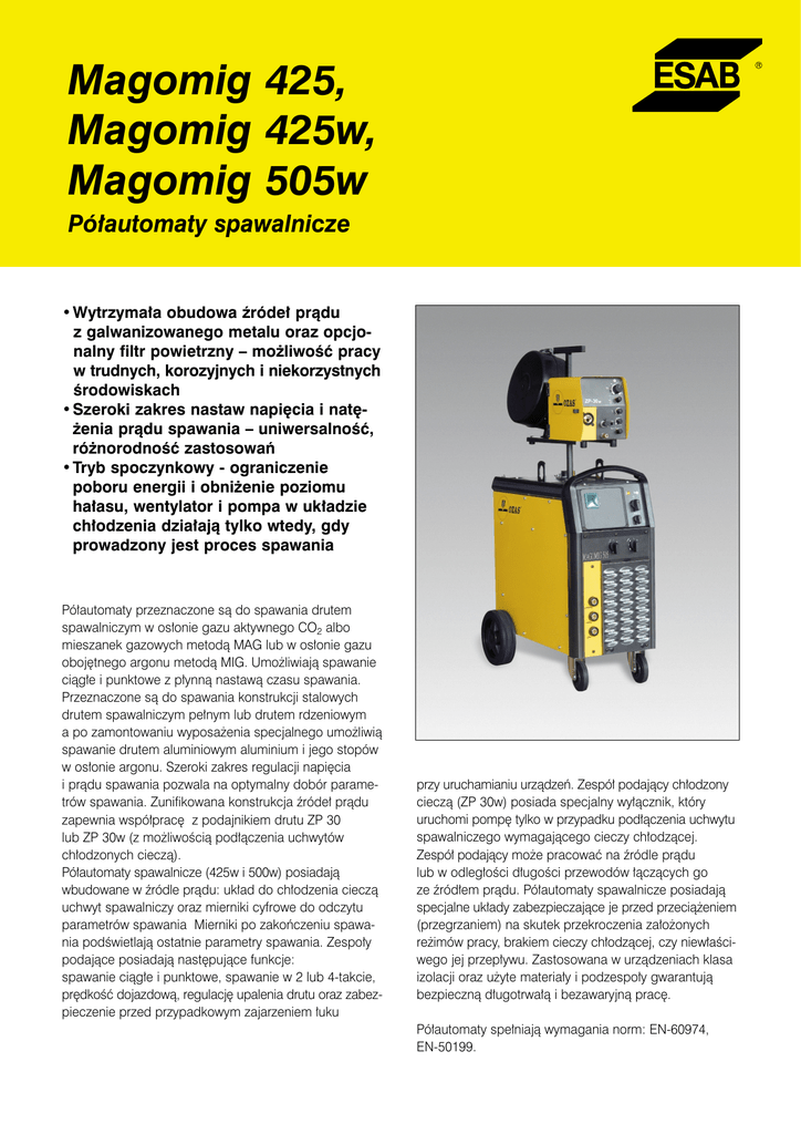 Magomig 425, Magomig 425w, Magomig 505w Pó∏automaty spawalnicze •Wytrzyma∏a obudowa êróde∏ pràdu z galwanizowanego metalu oraz opcjonalny filtr powietrzny – mo˝liwoÊç pracy w trudnych, korozyjnych i niekorzystnych Êrodowiskach •Szeroki zakres nastaw napi´cia i nat´˝enia pràdu spawania – uniwersalnoÊç, ró˝norodnoÊç zastosowaƒ •Tryb spoczynkowy - ograniczenie poboru energii i obni˝enie poziomu ha∏asu, wentylator i pompa w uk∏adzie ch∏odzenia dzia∏ajà tylko wtedy, gdy prowadzony jest proces spawania Pó∏automaty przeznaczone sà do spawania drutem spawalniczym w os∏onie gazu aktywnego CO2 albo mieszanek gazowych metodà MAG lub w os∏onie gazu oboj´tnego argonu metodà MIG. Umo˝liwiajà spawanie ciàg∏e i punktowe z p∏ynnà nastawà czasu spawania. Przeznaczone sà do spawania konstrukcji stalowych drutem spawalniczym pe∏nym lub drutem rdzeniowym a po zamontowaniu wyposa˝enia specjalnego umo˝liwià spawanie drutem aluminiowym aluminium i jego stopów w os∏onie argonu. Szeroki zakres regulacji napi´cia i pràdu spawania pozwala na optymalny dobór parametrów spawania. Zunifikowana konstrukcja êróde∏ pràdu zapewnia wspó∏prac´ z podajnikiem drutu ZP 30 lub ZP 30w (z mo˝liwoÊcià pod∏àczenia uchwytów ch∏odzonych cieczà). Pó∏automaty spawalnicze (425w i 500w) posiadajà wbudowane w êródle pràdu: uk∏ad do ch∏odzenia cieczà uchwyt spawalniczy oraz mierniki cyfrowe do odczytu parametrów spawania Mierniki po zakoƒczeniu spawania podÊwietlajà ostatnie parametry spawania. Zespo∏y podajàce posiadajà nast´pujàce funkcje: spawanie ciàg∏e i punktowe, spawanie w 2 lub 4-takcie, pr´dkoÊç dojazdowà, regulacj´ upalenia drutu oraz zabezpieczenie przed przypadkowym zajarzeniem ∏uku przy uruchamianiu urzàdzeƒ. Zespó∏ podajàcy ch∏odzony cieczà (ZP 30w) posiada specjalny wy∏àcznik, który uruchomi pomp´ tylko w przypadku pod∏àczenia uchwytu spawalniczego wymagajàcego cieczy ch∏odzàcej. Zespó∏ podajàcy mo˝e pracowaç na êródle pràdu lub w odleg∏oÊci d∏ugoÊci przewodów ∏àczàcych go ze êród∏em pràdu. Pó∏automaty spawalnicze posiadajà specjalne uk∏ady zabezpieczajàce je przed przecià˝eniem (przegrzaniem) na skutek przekroczenia za∏o˝onych re˝imów pracy, brakiem cieczy ch∏odzàcej, czy niew∏aÊciwego jej przep∏ywu. Zastosowana w urzàdzeniach klasa izolacji oraz u˝yte materia∏y i podzespo∏y gwarantujà bezpiecznà d∏ugotrwa∏à i bezawaryjnà prac´. Pó∏automaty spe∏niajà wymagania norm: EN-60974, EN-50199. Dane techniczne: Magomig 425, Magomig 425w, Magomig 505w Napi´cie zasilania Znamionowy pobór mocy Zakres pràdu spawania Napi´cie biegu ja∏owego Znamionowy pràd spawania – w cyklu (P) 30% – w cyklu (P) 60% – w cyklu (P) 100% IloÊç stopni regulacji napi´cia Ârednica spoiwa – stalowe – aluminiowe (na ˝yczenie klienta) – rdzeniowe (na ˝yczenie klienta) Pr´dkoÊç podawania spoiwa Czas spawania punktowego IloÊç rolek podajàcych Stopieƒ ochrony Szpula z drutem spawalniczym – max waga – max Êrednica PojemnoÊç zbiornika cieczy ch∏odzàcej Max. przep∏yw cieczy ch∏odzàcej Masa – êród∏a pràdu – zespo∏u podajàcego ZP-30/ZP-30w* Wymiary (d∏/szer/wys) – êród∏a pràdu – zespo∏u podajàcego Zalecane gazy os∏onowe Magomig 425, 425w 3 x 400 V/50 Hz 18,8 KVA 50 A/16 V – 420A/35 V 14–47 V Magomig 505w 3 x 400 V/50 Hz 26 KVA 50 A/16,5 V – 500 A/39 V 17–50 V 420 A 400 A 315 A 35 (5x7) – 500 A 390 A 40 (5x8) 0,8; 1,0; 1,2; 1,6 mm 1,0; 1,2; 1,6 mm 1,0; 1,2; 1,6 mm 1,4 – 25,0 m/min 0,5 – 3,0 s 4 IP23 0,8; 1,0; 1,2; 1,6 mm 1,0; 1,2; 1,6 mm 1,0; 1,2; 1,6 mm 1,4 – 25,0 m/min 0,5 – 3,0 s 4 IP23 20 kg 300 mm 5,5 l 2 l/min 20 kg 300 mm 5,5 l 2 l/min 199 kg/213 kg* 14 kg/14,7 kg 228 kg 14,7 kg 812x552x925 mm 700x255x420 mm CO2, Ar, Ar20 CO2, Ar18CO2, Ar23CO2, Ar2CO2, Ar2O2 * dla wersji z ch∏odzeniem cieczà OPIS Magomig 425 Magomig 425w Magomig 505w Akcesoria Uchwyt spawalniczy MB501 L=3 m Uchwyt spawalniczy MB401D L=3 m Uchwyt spawalniczy MB36KD L=4 m Zestaw kó∏ jezdnych do ZP-30, ZP-30w Filtr powietrzny Wieszak na uchwyt spawalniczy Stabilizator (pólka z zwi´kszonym rozstawem kó∏) Numer katalogowy 0349 304 275 0349 304 276 0349 304 278 034.0383 033.0195 014.0143S 0349 493 903 0349 302 423 0349 303 362 0349 303 474 Na ˝yczenie klienta dostarczamy uchwyty spawalnicze o d∏ugoÊci 4 m lub 5 m. Dostawa obejmuje èród∏o pràdu spawania z przewodem zasilajàcym 5 m, zespó∏ podajàcy, zestaw przewodów ∏àczàcych êród∏o z podajnikiem 5 m i przewód z zaciskiem masowym 5 m. Mo˝liwa jest kompletacja pó∏automatów z d∏u˝szymi zestawami przewodów (nawet do 35 m ∏àczàcymi êród∏o z podajnikiem drutu). Biura Handlowe ESAB: ul. Chorzowska 108 40–101 Katowice tel. +48 32 351 11 00 fax +48 32 351 11 20 [email protected] www.esab.pl Firma ESAB Sp. z o.o. Regon: 271 977 650 NIP: 634-00-23-457 Adres: ul. ˚elazna 9 40-952 Katowice Polska