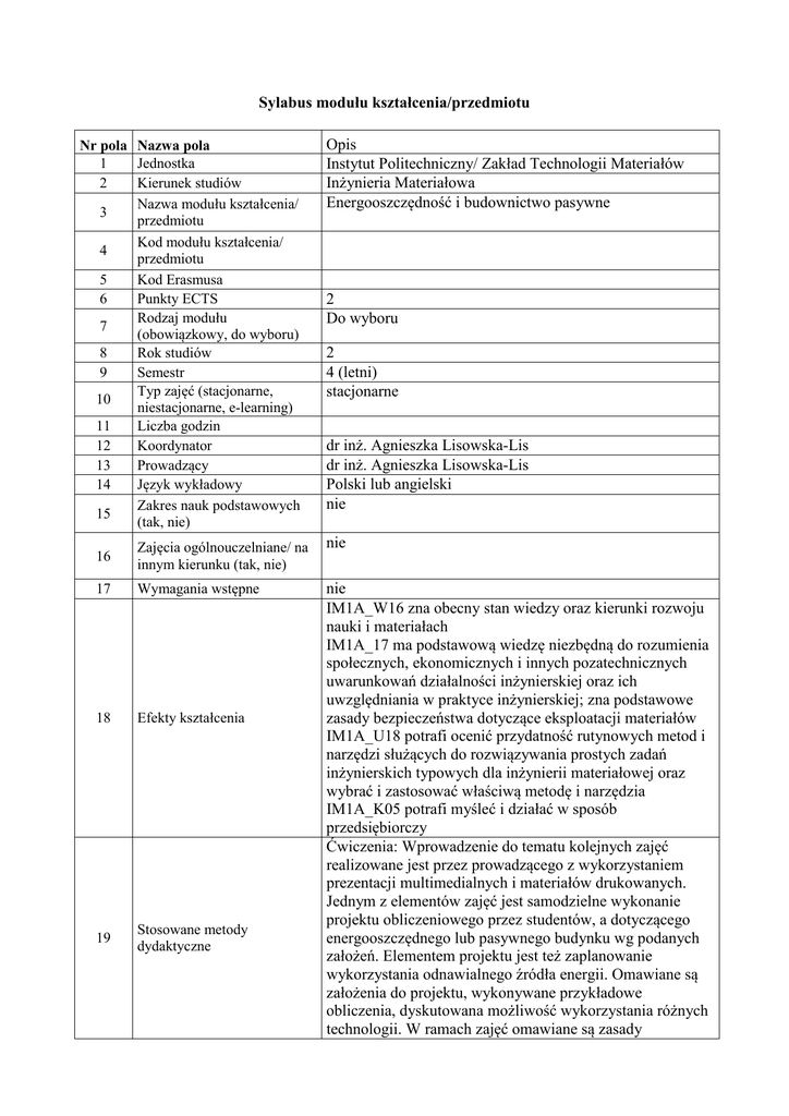 Sylabus modułu kształcenia/przedmiotu Nr pola Nazwa pola 1 Jednostka 2 Kierunek studiów Nazwa modułu kształcenia/ 3 przedmiotu Kod modułu kształcenia/ 4 przedmiotu 5 Kod Erasmusa 6 Punkty ECTS Rodzaj modułu 7 (obowiązkowy, do wyboru) 8 Rok studiów 9 Semestr Typ zajęć (stacjonarne, 10 niestacjonarne, e-learning) 11 Liczba godzin 12 Koordynator 13 Prowadzący 14 Język wykładowy Zakres nauk podstawowych 15 (tak, nie) Opis Instytut Politechniczny/ Zakład Technologii Materiałów Inżynieria Materiałowa Energooszczędność i budownictwo pasywne 2 Do wyboru 2 4 (letni) stacjonarne dr inż. Agnieszka Lisowska-Lis dr inż. Agnieszka Lisowska-Lis Polski lub angielski nie 16 Zajęcia ogólnouczelniane/ na innym kierunku (tak, nie) nie 17 Wymagania wstępne 18 Efekty kształcenia 19 Stosowane metody dydaktyczne nie IM1A_W16 zna obecny stan wiedzy oraz kierunki rozwoju nauki i materiałach IM1A_17 ma podstawową wiedzę niezbędną do rozumienia społecznych, ekonomicznych i innych pozatechnicznych uwarunkowań działalności inżynierskiej oraz ich uwzględniania w praktyce inżynierskiej; zna podstawowe zasady bezpieczeństwa dotyczące eksploatacji materiałów IM1A_U18 potrafi ocenić przydatność rutynowych metod i narzędzi służących do rozwiązywania prostych zadań inżynierskich typowych dla inżynierii materiałowej oraz wybrać i zastosować właściwą metodę i narzędzia IM1A_K05 potrafi myśleć i działać w sposób przedsiębiorczy Ćwiczenia: Wprowadzenie do tematu kolejnych zajęć realizowane jest przez prowadzącego z wykorzystaniem prezentacji multimedialnych i materiałów drukowanych. Jednym z elementów zajęć jest samodzielne wykonanie projektu obliczeniowego przez studentów, a dotyczącego energooszczędnego lub pasywnego budynku wg podanych założeń. Elementem projektu jest też zaplanowanie wykorzystania odnawialnego źródła energii. Omawiane są założenia do projektu, wykonywane przykładowe obliczenia, dyskutowana możliwość wykorzystania różnych technologii. W ramach zajęć omawiane są zasady 20 21 22 23 projektowania, stosowane materiały, technologie, kryteria doboru. W tym celu wykorzystywane są modele laboratoryjne, materiały multimedialne, elektroniczne bazy danych dostępne poprzez Internet. Wycieczki tematyczne i zajęcia terenowe. Na ocenę końcową składają się oceny z a) referatu (temat problemowy realizowany w grupie lub indywidualnie), b) Metody sprawdzania i kryteria projektu dotyczącego energooszczędności i budownictwa oceny efektów kształcenia pasywnego; c) sprawdzianów, odpowiedzi ustnych lub też sprawozdań z ćwiczeń i zajęć terenowych. Forma i warunki zaliczenia Prace pisemne i odpowiedzi ustne Zapotrzebowanie energetyczne budynków. Zasady projektowania i realizacji budynków energooszczędnych i pasywnych. Termoodernizacja. Zastosowanie źródeł energii odnawialnych w budownictwie pasywnym. Innowacyjne materiały i technologie. Treści kształcenia (skrócony opis) EN: The energy demand of buildings. Principles of design and construction of energy efficient buildings and passive buildings. Buildings modernization. Renewable energy sources in passive buildings. Innovative materials and technologies. Zapotrzebowane energetyczne budynków (ciepło, energia elektryczna, inne rodzaje energii). Materiały, o zmiennych parametrach fizycznych, regulowanych parametrami środowiska zewnętrznego i/lub systemem zarządzania energią w budynku, w tym materiały o zmiennych właściwościach cieplnych, spektralnych, wilgotnościowych i inne, oraz technologie ich wytwarzania. Materiały i technologie chroniące budynki przed przegrzewaniem i/lub ograniczające straty ciepła. Materiały i technologie słonecznych systemów pasywnych zintegrowanych z obudową budynku. Materiały i technologie fotowoltaiczne zintegrowane z obudową budynku. Technologie wielofunkcyjne energetycznie (ogrzewanie, chłodzenie, wentylacja, Treści kształcenia (pełny opis) klimatyzacja, produkcja energii elektrycznej) obudów budynku. Projekt domku jednorodzinnego pasywnego. Założenia projektowe. Dobór materiałów i ich ocena. Bilans cieplny budynku. Komponenty budowlane i elementy budynku. Materiały stosowane w budownictwie pasywnym – wizyta w laboratorium energooszczędności, testowanie materiałów. Termomodernizacja budynków. Źródła energii odnawialnej – praktyczne zastosowanie. Obliczenia dotyczące zapotrzebowania na energię cieplną domku jednorodzinnego. Określenie źródła energii odpadowej i / lub odnawialnej bilansie energetycznym budynku. Wycieczka do centrum energooszczędności i budownictwa pasywnego i lub instalacji tego typu. Sprawdzian zaliczeniowy. 24 Literatura podstawowa i uzupełniająca 25 Przyporządkowanie modułu kształcenia/przedmiotu do obszaru/ obszarów kształcenia 26 27 28 WNUK Ryszard Instalacje w domu pasywnym i energooszczędnym. Przewodnik Budowlany, 2007 NACIĄŻEK Bianka, PIOTROWSKI Ryszard. Jak zbudować dom energooszczędny i skorzystać z dopłaty Warszawa. Przewodnik Budowlany, 2013. Komponenty budowlane i elementy budynku. Opór cieplny i współczynnik przenikania ciepła. Metoda obliczeniowa. Polski Komitet Normalizacyjny. PN-EN ISO 6946; lub inne wytyczne PIOTROWSKI Ryszard, DOMINIAK Paweł. Budowa domu pasywnego krok po kroku. Warszawa, Przewodnik Budowlany. 2008. STRZESZEWSKI M., WERESZCZYŃSKI P. Norma PNEN 12831; Nowa metoda obliczania projektowego obciążenia cieplnego. Purmo, Warszawa, 2009.\ LEWANDOWSKI. Proekologiczne źródła energii odnawialnej. WNT, Warszawa, (różne wydania). Sposób określenia liczby punktów ECTS Liczba punktów ECTS – zajęcia wymagające bezpośredniego udziału nauczyciela akademickiego Liczba punktów ECTS – zajęcia o charakterze praktycznym Uwaga: dla ułatwienia późniejszego przenoszenia treści do systemu bazowego katalogu przedmiotów proszę nie używać automatycznych form numerowania i punktowania oraz podziałów wyr