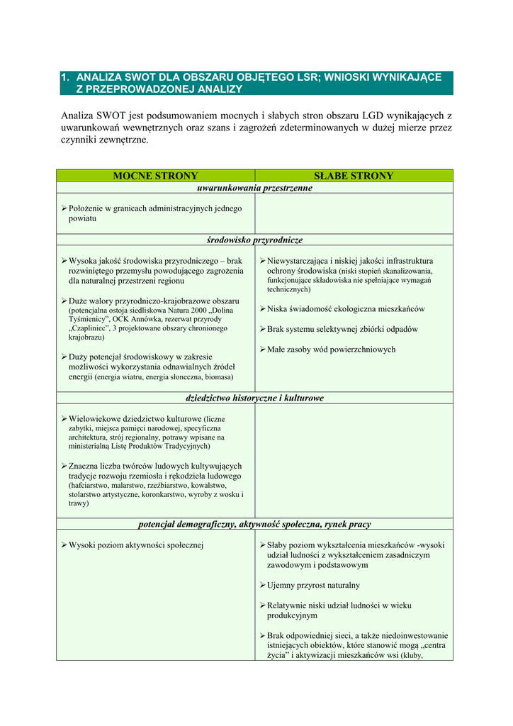 1. ANALIZA SWOT DLA OBSZARU OBJĘTEGO LSR; WNIOSKI WYNIKAJĄCE Z PRZEPROWADZONEJ ANALIZY Analiza SWOT jest podsumowaniem mocnych i słabych stron obszaru LGD wynikających z uwarunkowań wewnętrznych oraz szans i zagrożeń zdeterminowanych w dużej mierze przez czynniki zewnętrzne. MOCNE STRONY SŁABE STRONY uwarunkowania przestrzenne Położenie w granicach administracyjnych jednego powiatu środowisko przyrodnicze Wysoka jakość środowiska przyrodniczego – brak rozwiniętego przemysłu powodującego zagrożenia dla naturalnej przestrzeni regionu Duże walory przyrodniczo-krajobrazowe obszaru (potencjalna ostoja siedliskowa Natura 2000 „Dolina Tyśmienicy”, OCK Annówka, rezerwat przyrody „Czapliniec”, 3 projektowane obszary chronionego krajobrazu) Duży potencjał środowiskowy w zakresie możliwości wykorzystania odnawialnych źródeł energii (energia wiatru, energia słoneczna, biomasa) Niewystarczająca i niskiej jakości infrastruktura ochrony środowiska (niski stopień skanalizowania, funkcjonujące składowiska nie spełniające wymagań technicznych) Niska świadomość ekologiczna mieszkańców Brak systemu selektywnej zbiórki odpadów Małe zasoby wód powierzchniowych dziedzictwo historyczne i kulturowe Wielowiekowe dziedzictwo kulturowe (liczne zabytki, miejsca pamięci narodowej, specyficzna architektura, strój regionalny, potrawy wpisane na ministerialną Listę Produktów Tradycyjnych) Znaczna liczba twórców ludowych kultywujących tradycje rozwoju rzemiosła i rękodzieła ludowego (hafciarstwo, malarstwo, rzeźbiarstwo, kowalstwo, stolarstwo artystyczne, koronkarstwo, wyroby z wosku i trawy) potencjał demograficzny, aktywność społeczna, rynek pracy Wysoki poziom aktywności społecznej Słaby poziom wykształcenia mieszkańców -wysoki udział ludności z wykształceniem zasadniczym zawodowym i podstawowym Ujemny przyrost naturalny Relatywnie niski udział ludności w wieku produkcyjnym Brak odpowiedniej sieci, a także niedoinwestowanie istniejących obiektów, które stanowić mogą „centra życia” i aktywizacji mieszkańców wsi (kluby, świetlice, obiekty sportowe, domy kultury, biblioteki, place zabaw) Zła sytuacja na rynku pracy (wysokie bezrobocie – w tym ukryte, brak alternatywnych miejsc pracy poza rolnictwem) potencjał gospodarczy, rolnictwo Bogata oferta terenów inwestycyjnych Niski wskaźnik rozwoju przedsiębiorczości pozarolniczej Znaczna liczba gospodarstw ekologicznych wykorzystujących wysoki potencjał środowiskowy do rozwoju rolnictwa ekologicznego i produkcji wysokiej jakości żywności Słabo rozwinięta oferta wspierania rozwoju małej i średniej przedsiębiorczości Duży udział w strukturze gruntów gleb średnich i słabych klas bonitacyjnych Zrzeszenia producenckie reprezentujące podstawowe gałęzie produkcji rolnej obszaru Mało efektywne i rozdrobnione gospodarstwa rolne turystyka Duży potencjał (czyste, mało przekształcone środowisko, liczne zabytki i miejsca wydarzeń historycznych) sprzyjający rozwojowi turystyki Przywiązanie mieszkańców do tradycji lokalnych, stanowiące wartość dla rozwijania agroturystyki Szlaki dziedzictwa kulturowego o znaczeniu regionalnym Słabo rozwinięty i niewypromowany produkt turystyczny Słabo rozbudowana sieć lokalnych szlaków turystycznych Brak sieci i punktów informacji turystycznej Znaczące braki w infrastrukturze turystycznej (baza noclegowa i gastronomiczna, mała infrastruktura turystyczna: oznakowanie, przewodniki, ławki, parkingi itp.) Mała ilość gospodarstw agroturystycznych Zaniedbane przestrzenie publiczne w miejscowościach wiejskich, wpływające negatywnie na odczucia turystów infrastruktura techniczna, usługi Dobra zewnętrzna dostępność komunikacyjna Ważne szlaki komunikacyjne o znaczeniu krajowym i regionalnym (DK 63 – bezpośrednie powiązanie z drogowym przejściem granicznym w Sławatyczach, DK 19 – jeden z ważniejszych szlaków drogowych, łączący główne ośrodki miejskie wschodnich regionów Polski) Wysoki współczynnik gęstości sieci dróg krajowych oraz dróg powiatowych twardych Zapewniony dostęp do usług ochrony zdrowia i edukacji Słaba jakość techniczna dróg (krajowych, regionalnych, lokalnych) Niski współczynnik gęstości dróg gminnych twardych Znikoma rola połączeń kolejowych w dostępności komunikacyjnej obszaru Brak miejsc obsługi podróżnych, w których skoncentrowane byłyby podstawowe, niezbędne usługi (parkingi, baza gastronomiczna, miejsca noclegowe) Niski stopień skanalizowania obszaru Niski stopień gazyfikacji Mała ilość i zły stan techniczny prawidłowo zorganizowanych składowisk odpadów komunalnych SZANSE ZAGROŻENIA Wykorzystanie korzystnych warunków do rozwoju odnawialnych źródeł energii Utrzymywanie się niekorzystnych trendów demograficznych Rozwój inwestycyjny terenów leżących w Migracja młodych wykształconych ludzi z terenów wiejskich do dużych ośrodków miejskich sąsiedztwie ważnych szlaków komunikacyjnych (DK 19, DK 63) Przywrócenie ruchu na linii kolejowej nr 30 Rozwój rolnictwa ekologicznego związany z wzrastającym popytem na zdrową żywność Rozbudowa systemu dystrybucji i zbytu dla surowców ekologicznych Wzrost patologii i osłabienie tożsamości kulturowej wywołany liberalizacją obyczajów, brakiem możliwości zagospodarowania czasu wolnego młodzieży (brak odpowiedniej infrastruktury) Zła sytuacja gospodarcza kraju i regionu; marginalizacja województwa lubelskiego Brak skoordynowanej, długofalowej polityki rolnej Rozwój turystyki, w tym turystyki „blisko natury” Brak przemian strukturalnych na wsi Rozwój agroturystyki związany z wzrastającym zainteresowaniem dziedzictwem kulturowym wsi, rękodzielnictwem oraz szeroko pojmowana kulturą wiejską Wykorzystanie możliwości związanych z rozwojem technologii informacyjno-komunikacyjncych (np. elearning, e-handel) Wykorzystanie zewnętrznych źródeł finansowania Wy