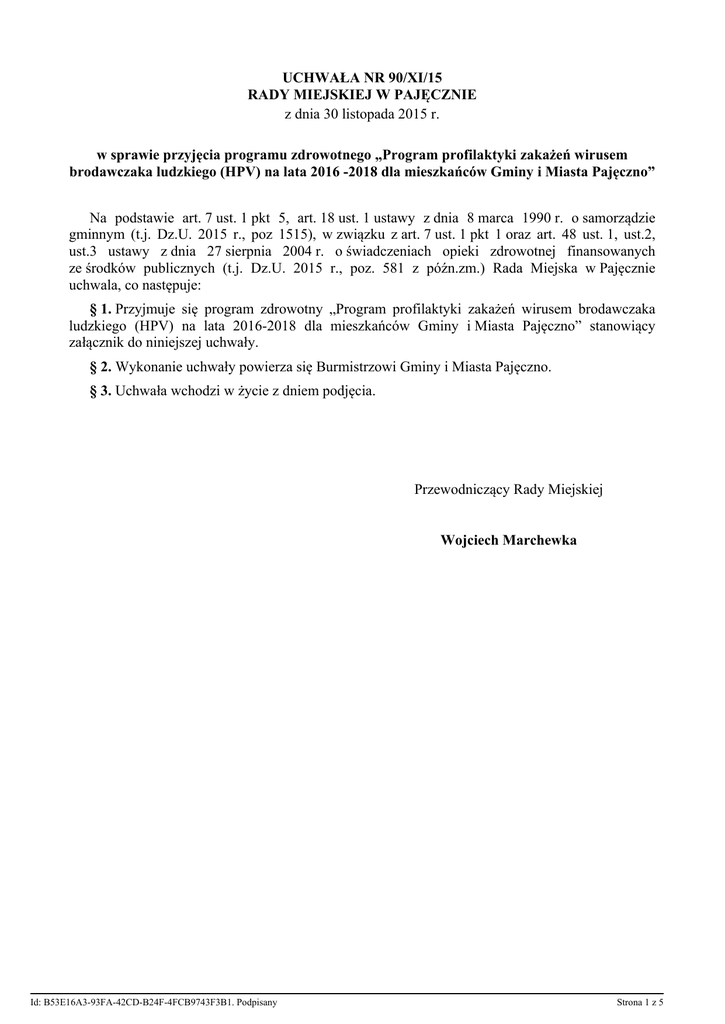 UCHWAŁA NR 90/XI/15 RADY MIEJSKIEJ W PAJĘCZNIE z dnia 30 listopada 2015 r. w sprawie przyjęcia programu zdrowotnego „Program profilaktyki zakażeń wirusem brodawczaka ludzkiego (HPV) na lata 2016 -2018 dla mieszkańców Gminy i Miasta Pajęczno” Na podstawie art. 7 ust. 1 pkt 5, art. 18 ust. 1 ustawy z dnia 8 marca 1990 r. o samorządzie gminnym (t.j. Dz.U. 2015 r., poz 1515), w związku z art. 7 ust. 1 pkt 1 oraz art. 48 ust. 1, ust.2, ust.3 ustawy z dnia 27 sierpnia 2004 r. o świadczeniach opieki zdrowotnej finansowanych ze środków publicznych (t.j. Dz.U. 2015 r., poz. 581 z późn.zm.) Rada Miejska w Pajęcznie uchwala, co następuje: § 1. Przyjmuje się program zdrowotny „Program profilaktyki zakażeń wirusem brodawczaka ludzkiego (HPV) na lata 2016-2018 dla mieszkańców Gminy i Miasta Pajęczno” stanowiący załącznik do niniejszej uchwały. § 2. Wykonanie uchwały powierza się Burmistrzowi Gminy i Miasta Pajęczno. § 3. Uchwała wchodzi w życie z dniem podjęcia. Przewodniczący Rady Miejskiej Wojciech Marchewka Id: B53E16A3-93FA-42CD-B24F-4FCB9743F3B1. Podpisany Strona 1 z 5 Załącznik do Uchwały Nr 90/XI/15 Rady Miejskiej w Pajęcznie z dnia 30 listopada 2015 r. „Program profilaktyki zakażeń wirusem brodawczaka ludzkiego (HPV) na lata 2016 -2018 dla mieszkańców Gminy i Miasta Pajęczno” Wstęp Zaspokajanie zbiorowych potrzeb mieszkańców w zakresie ochrony zdrowia jest zadaniem państwa, samorządów wojewódzkich, powiatowych i gminnych. Wszystkie szczeble administracji poprzez zadania, jakie realizują na swoim terenie wpisują się w politykę zdrowotną państwa. Do zadań własnych gminy w zakresie zapewnienia równego dostępu do świadczeń opieki zdrowotnej należy w szczególności opracowanie i realizacja oraz ocena efektów programów zdrowotnych, wynikających z rozpoznanych potrzeb zdrowotnych i stanu zdrowia mieszkańców - art. 7 ust 1 pkt. 1 i art. 48 ust 1 ustawy z dnia 27 sierpnia 2004r. o świadczeniach opieki zdrowotnej finansowanych ze środków publicznych (t.j. Dz.U. 2015 poz. 581 z późn. zm.) Tworzenie i realizacja odpowiedniej polityki zdrowotnej przez promocję zdrowego trybu życia, aktywności ruchowej, stosowanie odpowiedniej profilaktyki, a także podejmowanie wszelkich działań i środków zmierzających do wykrycia chorób we wczesnych stadiach, dających szansę na szybkie wyleczenie jest warunkiem poprawy i utrzymania zdrowia społeczeństwa. Odpowiednia profilaktyka zapobiegania chorobom pozwala ograniczyć zachorowalność, uniknąć znacznie droższego procesu leczenia zaawansowanych stadiów choroby. Dlatego tak ważne wydaje się być tworzenie programów zdrowotnych, zwłaszcza przez ich edukacyjny charakter i przekaz nawet, jeśli ze względów finansowych wydają się być niewystarczające. Świadomość społeczna, przekonanie o sensie wykonywania badań profilaktycznych, a także podejmowanie działań w postaci szczepień zapobiegających zakażeniu są nie do przecenienia. Szczepienia przeciwko HPV są elementem profilaktyki pozwalającym zapobiec samemu zakażeniu wirusem wywołującym raka szyjki macicy, a przez to ograniczyć jedną z wielu chorób cywilizacyjnych. Uzasadnienie Celowości Wdrożenia Programu I. Opis problemu zdrowotnego Rak szyjki macicy jeden z około 200 różnych typów raka rozwija się w obrębie szyjki macicy, tej części, która łączy górną część macicy z pochwą. Rozwija się, kiedy uszkodzone komórki nabłonka zakażone wirusem HPV zaczynają się dzielić. Komórki te mogą gromadzić się tworząc guz. Guzy łagodne nie naciekają i z reguły są nieszkodliwe. 1Guz złośliwy, jak rak stanowi poważny problem zdrowotny i społeczny. Rak szyjki macicy jest drugim, co do częstości rakiem, który dotyka kobiety i drugą, co do częstości przyczyną ich zgonu z powodu chorób nowotworowych. Szacuje się, że na świecie liczba chorych kobiet sięga 1, 4 miliona a w ciągu roku rozpoznaje się około 500 000 nowych zachorowań, z czego 300 000 umiera. 2P rawie 80% przypadków jest diagnozowanych w państwach rozwijających się, gdzie w porównaniu z innymi nowotworami narządów płciowych, zajmuje on nawet pierwsze miejsce, jako przyczyna zgonów wśród kobiet. Id: B53E16A3-93FA-42CD-B24F-4FCB9743F3B1. Podpisany Strona 2 z 5 W Polsce, co roku na raka szyjki macicy zapada 3600 kobiet, z czego około 2000 umiera. Raka szyjki macicy wywołują przenoszone drogą płciową wirusy brodawczaka ludzkiego HPV. Wirusem tym zaraża się niemal połowa osób aktywnych seksualnie, najbardziej narażone są młode kobiety. Ryzyko zakażenia zwiększa wczesne rozpoczęcie życia płciowego, jak również częsta zmiana partnerów. 3HPV atakuje zwykle w ciągu pierwszych 5 lat od rozpoczęcia życia seksualnego. Jednak u około 80% organizm sam zwalcza infekcję. W Polsce szczyt zachorowań kobiet przypada w wieku 45 – 59 lat, gdy pełnią ważne role rodzinne i są aktywne zawodowo. Zakażenie wirusem HPV może wywierać także bardziej bezpośredni wpływ na przebieg ciąży. Liczne badania kliniczne i doświadczalne wskazują, że zakażenie genitalnymi typami HPV, w tym typami HPV 6/11 (odpowiedzialnymi za kłykciny), może prowadzić do spontanicznych poronień we wczesnej fazie ciąży. 4 Choroba nowotworowa to również problem psychospołeczny. Powoduje ból oraz lęk przed utratą życia, dodatkowo podsycany negatywnymi wyobrażeniami i społecznymi reakcjami może prowadzić do depresji. Źródłem wtórnych cierpień jest także leczenie (chirurgia, radioterapia, chemia), a także stresujące pobyty w szpitalach i obawy o los najbliższych, szczególnie dzieci pozbawionych opieki. Indywidualna reakcja na chorobę może się różnić i wynika z wielu czynników, ale zawsze jest przyczyną cierpień fizycznych i negatywnych emocji. Choroba wpływa na różne sfery aktywności rodzinnej, związane z pracą zawodową, nauką czy udziałem w życiu społecznym pr