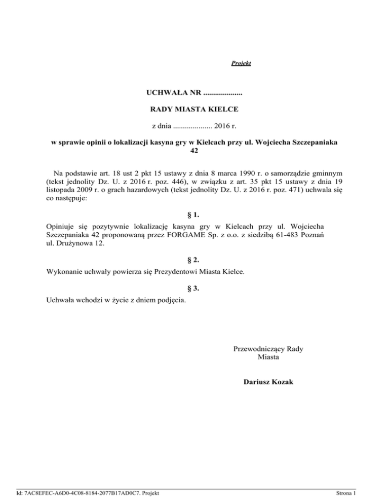 Projekt UCHWAŁA NR .................... RADY MIASTA KIELCE z dnia .................... 2016 r. w sprawie opinii o lokalizacji kasyna gry w Kielcach przy ul. Wojciecha Szczepaniaka 42 Na podstawie art. 18 ust 2 pkt 15 ustawy z dnia 8 marca 1990 r. o samorządzie gminnym (tekst jednolity Dz. U. z 2016 r. poz. 446), w związku z art. 35 pkt 15 ustawy z dnia 19 listopada 2009 r. o grach hazardowych (tekst jednolity Dz. U. z 2016 r. poz. 471) uchwala się co następuje: § 1. Opiniuje się pozytywnie lokalizację kasyna gry w Kielcach przy ul. Wojciecha Szczepaniaka 42 proponowaną przez FORGAME Sp. z o.o. z siedzibą 61-483 Poznań ul. Drużynowa 12. § 2. Wykonanie uchwały powierza się Prezydentowi Miasta Kielce. § 3. Uchwała wchodzi w życie z dniem podjęcia. Przewodniczący Rady Miasta Dariusz Kozak Id: 7AC8EFEC-A6D0-4C08-8184-2077B17AD0C7. Projekt Strona 1 UZASADNIENIE FORGAME Sp. z o.o. z siedzibą w Poznaniu złożyła wniosek o wydanie pozytywnej opinii o lokalizacji kasyna gry w Kielcach przy ul. Wojciecha Szczepaniaka 42 (Hotel Binkowski), gdyż zamierza ubiegać się o uzyskanie koncesji na prowadzenie kasyna w Hotelu pod ww. adresem. Koncesji na prowadzenie kasyna gry udziela minister właściwy do spraw finansów publicznych. W myśl art. 35 pkt 15 ustawy z dnia 19 listopada 2009 roku o grach hazardowych wniosek o udzielenie koncesji na prowadzenie kasyna gry powinien zawierać pozytywną opinię rady gminy o lokalizacji kasyna gry. Negatywna opinia rady gminy wyłącza możliwość wydania koncesji na prowadzenie kasyna gry. Natomiast pozytywna opinia nie wiąże organu właściwego do wydania ww. zezwolenia. Zgodnie z ww. ustawą, kasyna gry mogą być lokalizowane w miejscowościach liczących do 250 tysięcy mieszkańców w ilości - jedno kasyno. Miasto Kielce liczy mniej niż 200 tysięcy mieszkańców i obecnie na terenie Kielc działa jedno kasyno gry przy ul. Sienkiewicza 78. Okoliczność ta nie może jednak mieć wpływu na wydanie negatywnej opinii, bowiem w doktrynie i orzecznictwie ugruntowany jest pogląd, że uchwała rady gminy w sprawie wyrażenia opinii o lokalizacji kasyna powinna odnosić się w y ł ą c z n i e do konkretnej lokalizacji. Wyrażając opinię, rada gminy powinna się kierować oceną lokalizacji z punktu widzenia ustaleń miejscowego planu zagospodarowania przestrzennego dla danego obszaru, ponieważ akt ten może np. zawierać regulacje niedopuszczające prowadzenie tego rodzaju działalności na danym terenie, a w przypadku braku takiego planu istotne znaczenie dla wyrażenia opinii może mieć rzeczywiste zagospodarowanie terenów sąsiednich, np. usytuowanie w najbliższej okolicy szkół, placówek oświatowo-wychowawczych, placówek opiekuńczych, cmentarzy czy ośrodków kultu religijnego. Nie ma znaczenia dla wyrażenia opinii kwestia liczby działających ma terenie gminy kasyn gry, ocena potrzeby i celowości ich funkcjonowania, korzyści finansowe z ich funkcjonowania, sytuacja, że rada gminy miałaby wielokrotnie zajmować się wnioskami tego samego podmiotu dotyczącymi tej samej lokalizacji itp. Mając powyższe na uwadze, po zapoznaniu się z propozycją lokalizacji kasyna w budynku Hotelu Binkowski w Kielcach przy ul. Wojciecha Szczepaniaka 42, rada gminy postanawia pozytywnie ją zaopiniować. Id: 7AC8EFEC-A6D0-4C08-8184-2077B17AD0C7. Projekt Strona 1