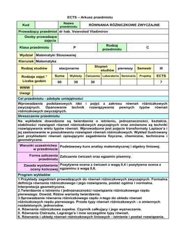 ECTS – Arkusz przedmiotu Nazwa przedmiotu Kod RÓWNANIA RÓŻNICZKOWE ZWYCZAJNE Prowadzący przedmiot dr hab. Vsievolod Vladimirov Osoby prowadzące zajęcia Klasa przedmiotu Rodzaj przedmiotu P C Wydział Matematyki Stosowanej Kierunek Matematyka Rodzaj studiów Rodzaje zajęć * Liczba godzin stacjonarne Suma Wykłady 60 30 Stopień studiów pierwszy Ćwiczenia Laboratoria Seminaria Semestr Projekty III ECTS 30 7 WWW Uwagi Cel przedmiotu - zdobyte umiejętności Wprowadzenie podstawowych idei i pojęć z zakresu równań różniczkowych zwyczajnych. Opanowanie technik rozwiązywania pewnych typów równań różniczkowych zwyczajnych. Streszczenie przedmiotu Na wykładzie dowodzone są twierdzenia o istnieniu, jednoznaczności, kształcie, stabilności rozwiązań równań różniczkowych zwyczajnych oraz omówione są techniki rozwiązywania wielu typów równań. Wprowadzone jest pojęcie transformaty Laplace’a i jej zastosowanie w poszukiwaniu rozwiązań równań różniczkowych. Wykład ilustrowany jest przykładami równań opisującymi zagadnienia fizyczne, chemiczne, techniczne i geometryczne. Warunki uczestnictwa Podstawowy kurs analizy matematycznej i algebry liniowej. w przedmiocie Forma zaliczenia Zaliczenie ćwiczeń oraz egzamin pisemny. przedmiotu Zasada wystawiania Pozytywna ocena z ćwiczeń z wagą 0,4 i pozytywna ocena z oceny końcowej egzaminu z wagą 0,6. Program wykładów 1.Przykłady zagadnień prowadzących do równań różniczkowych zwyczajnych. Formalna definicja równania różniczkowego i jego rozwiązania, postać ogólna i normalna. Interpretacja geometryczna. 2.Twierdzenie o istnieniu i jednoznaczności rozwiązania różniczkowego rzędu pierwszego. Dowód. Różne warianty twierdzenia. 3.Sprowadzanie równania różniczkowego rzędu n-tego do układu równań różniczkowych rzędu pierwszego. Proste typy równań różniczkowych - o zmiennych rozdzielonych, jednorodne. 4. Równanie różniczkowe zupełne. Czynnik całkujący i jego wyznaczanie. 5. Równania Clairauta, Lagrange'a i inne szczególne typy równań. 6. Równania i układy równań różniczkowych liniowych - istnienie i postać rozwiązania. Skalarne równanie różniczkowe rzędu pierwszego. Równanie Bernoulliego. Równanie Riccatiego. 7. Skalarne równanie różniczkowe n-tego rzędu. Wrońskian. Fundamentalny układ rozwiązań. Metoda uzmienniania stałych. Obniżanie rzędu równania różniczkowego. Zasada superpozycji. Równania różniczkowe n-tego rzędu o współczynnikach stałych. Metoda przewidywań. 8. Układ skalarnych równań różniczkowych rzędu pierwszego. Układ fundamentalny rozwiązań. Metoda uzmienniania stałych. Układy równań różniczkowych liniowych o stałych współczynnikach. Metoda wektorów i wartości własnych. Sprowadzanie macierzy do postaci Jordana. Rowiązywanie układu x'=Ax przez sprowadzenie macierzy układu do postaci Jordana. 9. Poszukiwanie rozwiązań równań różniczkowych w postaci szeregów potęgowych twierdzenie Cauchy-Kowalewskiej. Dowód dla przypadku skalarnego. Osobliwe punkty regularne równań rzędu drugiego. Równanie indeksowe. Szeregi Frobeniusa. 10. Twierdzenie o ciągłej zależności rozwiązania od warunków początkowych. Stabilność, lokalna asymptotyczna stabilność i globalna asymptotyczna stabilność rozwiązania równania różniczkowego - definicje. Twierdzenie Lapunowa. Zastosowanie do układu x'=Ax i do równania skalarnego x'=f(x). Problem Routha-Hurwitza. 11. Punkty osobliwe równań różniczkowych i ich klasyfikacja. Portrety fazowe. Zbiory graniczne i ich własności, cykl graniczny. 12. Zagadnienia brzegowe dla równań drugiego rzędu, operator Sturma--Liouville'a. 13. Transformata Laplace'a. Niektóre własności transformaty. Wyznaczanie transformaty na podstawie równania różniczkowego. Wyznaczanie funkcji na podstawie jej transformaty. Twierdzenia o rozkładzie, przesunięciu rzeczywistym, przesunięciu zespolonym, splocie. 14. Zastosowania transformaty Laplace’a do rozwiązywania równań różniczkowych. Informacja o klasycznych równaniach cząstkowych fizyki matematycznej. Program pozostałych zajęć (ćwiczenia, laboratoria, projekty, seminaria) Opanowanie techniki układania równań opisujących konkretne problemy fizyczne, chemiczne, techniczne i geometryczne. Rozwiązywanie wielu zadań rachunkowych ściśle powiązanych z wykładem. Bibliografia 1. B.P. Conrad, Differential Equations, A Systems Approach, Pearson Education, Inc., Upper Saddle River, New Jersey, 2003. 2. A.F. Filippow, Zbiór zada« z równa« ró»niczkowych, Izd. Nauka, Moskwa 1973. 3. A. Palczewski, Równania ró»niczkowe zwyczajne (teoria i metody numeryczne z wykorzystaniem komputerowego systemu oblicze« symbolicznych), WNT, Warszawa 1999. 4. D.L.Powers, Boundary Value Problems and Partial Differential Equations, sixth edition, Academic Press is an imprint of Elsevier, 2010. 5. D.G. Zill, Differential Equations with Boundary-Value Problems, PWS-KENT Publishing Company, Boston 1986. * Rodzaje zajęć: ćwiczenia – ćwiczenia audytoryjne, lektoraty, zajęcia wf, laboratoria – ćwiczenia laboratoryjne, zajęcia praktyczne, zajęcia terenowe, seminaria – seminaria, konwersatoria, projekty – ćwiczenia projektowe, prace kontrolne i przejściowe