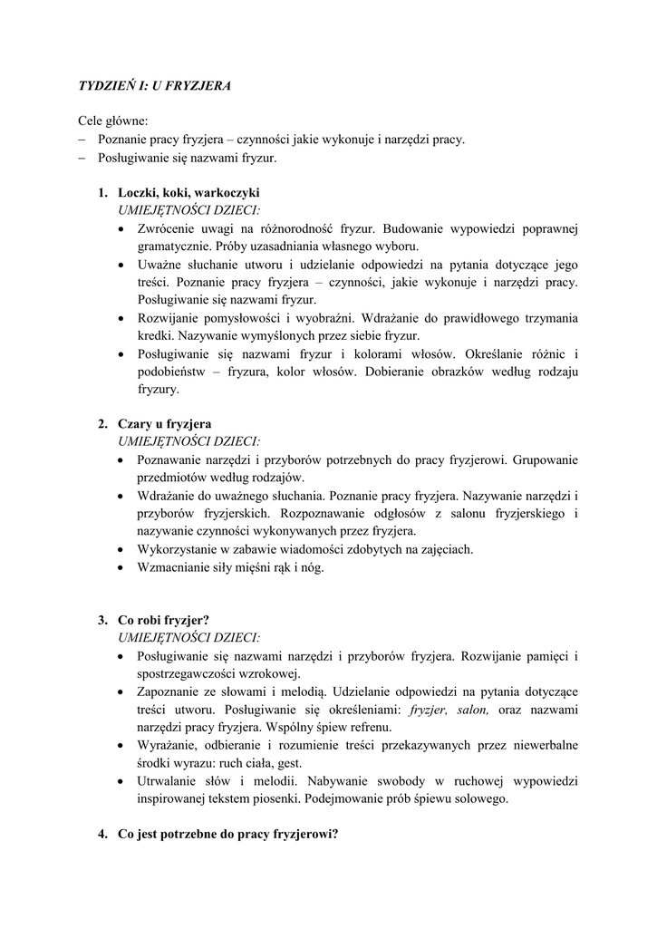 TYDZIEŃ I: U FRYZJERA Cele główne: Poznanie pracy fryzjera – czynności jakie wykonuje i narzędzi pracy. Posługiwanie się nazwami fryzur. 1. Loczki, koki, warkoczyki UMIEJĘTNOŚCI DZIECI: Zwrócenie uwagi na różnorodność fryzur. Budowanie wypowiedzi poprawnej gramatycznie. Próby uzasadniania własnego wyboru. Uważne słuchanie utworu i udzielanie odpowiedzi na pytania dotyczące jego treści. Poznanie pracy fryzjera – czynności, jakie wykonuje i narzędzi pracy. Posługiwanie się nazwami fryzur. Rozwijanie pomysłowości i wyobraźni. Wdrażanie do prawidłowego trzymania kredki. Nazywanie wymyślonych przez siebie fryzur. Posługiwanie się nazwami fryzur i kolorami włosów. Określanie różnic i podobieństw – fryzura, kolor włosów. Dobieranie obrazków według rodzaju fryzury. 2. Czary u fryzjera UMIEJĘTNOŚCI DZIECI: Poznawanie narzędzi i przyborów potrzebnych do pracy fryzjerowi. Grupowanie przedmiotów według rodzajów. Wdrażanie do uważnego słuchania. Poznanie pracy fryzjera. Nazywanie narzędzi i przyborów fryzjerskich. Rozpoznawanie odgłosów z salonu fryzjerskiego i nazywanie czynności wykonywanych przez fryzjera. Wykorzystanie w zabawie wiadomości zdobytych na zajęciach. Wzmacnianie siły mięśni rąk i nóg. 3. Co robi fryzjer? UMIEJĘTNOŚCI DZIECI: Posługiwanie się nazwami narzędzi i przyborów fryzjera. Rozwijanie pamięci i spostrzegawczości wzrokowej. Zapoznanie ze słowami i melodią. Udzielanie odpowiedzi na pytania dotyczące treści utworu. Posługiwanie się określeniami: fryzjer, salon, oraz nazwami narzędzi pracy fryzjera. Wspólny śpiew refrenu. Wyrażanie, odbieranie i rozumienie treści przekazywanych przez niewerbalne środki wyrazu: ruch ciała, gest. Utrwalanie słów i melodii. Nabywanie swobody w ruchowej wypowiedzi inspirowanej tekstem piosenki. Podejmowanie prób śpiewu solowego. 4. Co jest potrzebne do pracy fryzjerowi? UMIEJĘTNOŚCI DZIECI: Rozwijanie orientacji w schemacie własnego ciała. Posługiwanie się nazwami liczebników porządkowych 1–5 i nazwami palców. Rozwijanie logicznego myślenia. Przyporządkowywanie do obrazka fryzjera narzędzi i przyborów fryzjerskich. Dostrzeganie różnic w zastosowaniu przedmiotów o tej samej nazwie: szczotki. Ćwiczenie mięśni narządów mowy na zgłoskach: ciach, szsz, wrr, szu. Uczenie się utrzymywania prawidłowej pozycji podczas podskoku. 5. Grzebień i szczotka UMIEJĘTNOŚCI DZIECI: Posługiwanie się nazwami narzędzi i przyborów fryzjerskich. Dobieranie w pary obrazków przedstawiających różne przedmioty, mających to samo przeznaczenie. Rozumienie potrzeby dbania o włosy. Budowanie wypowiedzi poprawnej gramatycznie. Wyraziste wypowiadanie wyrazów: jeży, szczerzy, szczotka. Rozwijanie poczucia rytmu. Zapełnianie kolorową wydzieranką konturów obrazka. Rozwijanie sprawności manualnej. Rysowanie krótkich i długich linii prostych. Wdrażanie do uważnego słuchania. Rozwijanie orientacji w schemacie własnego ciała. TYDZIEŃ II: MAMY SWÓJ BAL Cele główne: Wywołanie radosnej atmosfery oczekiwania na bal karnawałowy w przedszkolu. Udział dzieci w dekorowaniu sali ozdobami karnawałowymi. Udział w balu karnawałowym zorganizowanym dla wszystkich dzieci w przedszkolu. 6. Balowe stroje UMIEJĘTNOŚCI DZIECI: Opowiadanie treści obrazka. Budowanie wypowiedzi poprawnej gramatycznie. Uważne słuchanie utworu i udzielanie odpowiedzi na pytania dotyczące jego treści. Rozumienie pojęć: karnawał, wodzirej. Wywołanie radosnej atmosfery oczekiwania na bal karnawałowy w przedszkolu. Ćwiczenie spostrzegawczości wzrokowej. Rozwijanie sprawności manualnej. Budowanie wypowiedzi poprawnej gramatycznie. Odzwierciedlanie w formie plastycznej wyglądu własnego kostiumu. Zwracanie uwagi na rozplanowanie rysunku na całej powierzchni kartonu. 7. Przygotowujemy się do balu UMIEJĘTNOŚCI DZIECI: Posługiwanie się nazwami kolorów. Rozumienie i stosowanie pojęć: mały – mniejszy; duży – większy; długa – krótsza; krótka – dłuższa. Wypowiadanie się na określony temat. Budowanie zdań poprawnych gramatycznie. Doskonalenie umiejętności cięcia papieru. Podejmowanie prób wycinania dowolnych kształtów. Rozwijanie fantazji przy ozdabianiu balonu. Wydłużanie fazy wydechowej. Wdrażanie do zachowania prawidłowego toru oddechowego. Ćwiczenie mięśni narządów mowy na zgłoskach: psyt, cyt, sss, zzz. Spokojne oczekiwanie na swoją kolej podczas pokonywania toru przeszkód. 8. Balony i baloniki UMIEJĘTNOŚCI DZIECI: Posługiwanie się nazwami kolorów i określeniami: okrągłe, podłużne, małe, duże. Grupowanie obrazków przedstawiających balony według: koloru, kształtu, wielkości. Uważne słuchanie utworu i udzielanie odpowiedzi na pytania dotyczące jego treści. Wdrażanie do zgodnego, kolejnego bawienia się zabawkami. Rozumienie określeń: okrągły, podłużny, taki sam, na górze, na dole. Rozwijanie spostrzegawczości wzrokowej i sprawności manualnej. Doskonalenie pamięci i spostrzegawczości wzrokowej. Wdrażanie do przestrzegania reguł zabawy. Rozwijanie pojemności płuc. Zachowywanie prawidłowego toru oddechowego. 9. W karnawałowym nastroju UMIEJĘTNOŚCI DZIECI: Zapoznanie ze słowami i melodią. Rozwijanie poczucia rytmu. Wykonanie prostego układu tanecznego. Zapamiętywanie i wykonywanie poleceń złożonych. Kreślenie linii falistych z góry na dół. Rozróżnianie kolorów: zielony, żółty, czerwony, niebieski. Wdrażanie do wykorzystania całej powierzchni kartonu. Nabywanie swobody w ruchowej wypowiedzi inspirowanej tekstem piosenki. Rozwijanie umiejętności poruszania się krokiem dostawnym po obwodzie koła. Rozwijanie ogólnej sprawności i zwinności. 10. Wesołe zabawy UMIEJĘTNOŚCI DZIECI: Uważne słuchanie treści wiersza. Rozwijanie orientacji w schemacie ciała. Doskonalenie spostrzegawczości wzrokowej. Dobieranie w pary takich samych elementów różniących się wielkośc