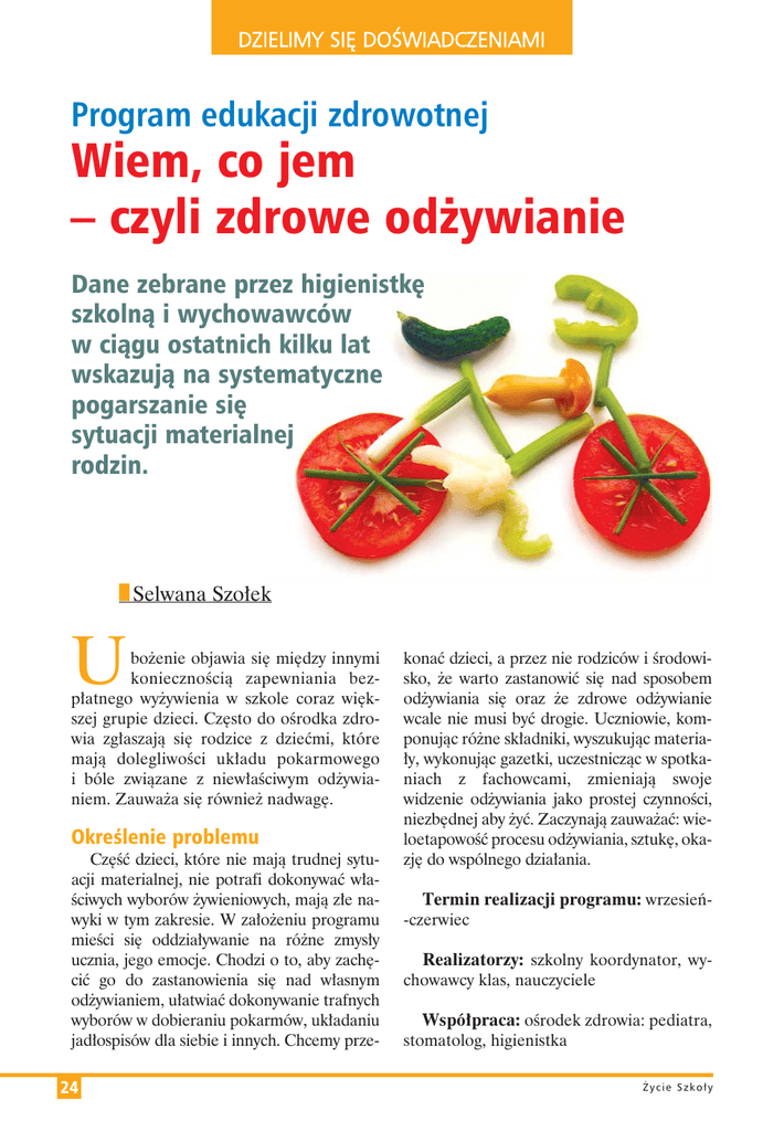 DZIELIMY SIĘ DOŚWIADCZENIAMI Program edukacji zdrowotnej Wiem, co jem – czyli zdrowe odżywianie Dane zebrane przez higienistkę szkolną i wychowawców w ciągu ostatnich kilku lat wskazują na systematyczne pogarszanie się sytuacji materialnej rodzin. n Selwana Szołek U bożenie objawia się między innymi koniecznością zapewniania bezpłatnego wyżywienia w szkole coraz większej grupie dzieci. Często do ośrodka zdrowia zgłaszają się rodzice z dziećmi, które mają dolegliwości układu pokarmowego i bóle związane z niewłaściwym odżywianiem. Zauważa się również nadwagę. Określenie problemu Część dzieci, które nie mają trudnej sytuacji materialnej, nie potrafi dokonywać właściwych wyborów żywieniowych, mają złe nawyki w tym zakresie. W założeniu programu mieści się oddziaływanie na różne zmysły ucznia, jego emocje. Chodzi o to, aby zachęcić go do zastanowienia się nad własnym odżywianiem, ułatwiać dokonywanie trafnych wyborów w dobieraniu pokarmów, układaniu jadłospisów dla siebie i innych. Chcemy prze- 24 konać dzieci, a przez nie rodziców i środowisko, że warto zastanowić się nad sposobem odżywiania się oraz że zdrowe odżywianie wcale nie musi być drogie. Uczniowie, komponując różne składniki, wyszukując materiały, wykonując gazetki, uczestnicząc w spotkaniach z fachowcami, zmieniają swoje widzenie odżywiania jako prostej czynności, niezbędnej aby żyć. Zaczynają zauważać: wieloetapowość procesu odżywiania, sztukę, okazję do wspólnego działania. Termin realizacji programu: wrzesień-czerwiec Realizatorzy: szkolny koordynator, wychowawcy klas, nauczyciele Współpraca: ośrodek zdrowia: pediatra, stomatolog, higienistka Życie Szkoły Cele programu: n przekonać o konieczności dostosowania n n n n n n n swojej diety do etapu rozwoju, płci, pory roku; wyrabiać przekonanie o potrzebie racjonalnego odżywiania; zapoznać ze sposobami przeliczania energii zawartej w posiłkach; zapoznać z tabelami; wyrobić nawyk rozsądnego przeliczania kalorii w zawartych pokarmach; wyrobić nawyk właściwego przygotowania do posiłków; wyrobić nawyki prozdrowotne związane ze zdrowym odżywianiem i aktywnością ruchową; kształtować zainteresowania przekazywaniem zdobytych wiadomości i umiejętności innym ludziom. Wynikające z celów zadania i harmonogram ich realizacji Zadania Metody/ prowadzący Termin Uwagi Składniki mojego Pogadanka, wykład, posiłku wymiana pytań i odpowiedzi/ higienistka Wrzesień/październik Zebranie rodziców, spotkania w klasach, przekazanie ulotek o zdrowym odżywianiu. Zdrowe odżywianie + aktywność ruchowa Gazetka na tablicy na korytarzu szkolnym/ szkolny koordynator Wrzesień/październik Opracowanie i zebranie materiałów – wzór na BMI, podstawowe dane, zachęcenie do spożywania zdrowego pożywienia i aktywności ruchowej. Spożywanie posiłków Zajęcia praktyczne /nauczyciele, wychowawcy klas Codziennie Wspólne spożywanie drugiego śniadania, przypominanie o spożywaniu owoców; serwetki, przyjemna atmosfera, dyżurni klasowi. Lubimy surówki Zajęcia praktyczne / i sałatki owocowe nauczyciele, wychowawcy klas Wg uznania wychowawców/ co najmniej raz w miesiącu Degustacja w klasach. Wiem, co jem Stała gazetka w salach zajęć / poszczególne klasy Listopad Gazetka ma zawierać informacje na temat zdrowego odżywiania. Wiem, co jem Konkurs na najładniejszą gazetkę / szkolny koordynator Grudzień Nagrody dla klas, utrwalenie nabywanych wiadomości o zdrowym odżywianiu. 7/2011 25 Zadania Metody/ prowadzący Termin Uwagi Co nas kusi, co nam szkodzi? Pogadanka/higienistka, Grudzień /styczeń nauczyciel przyrody, wychowawcy Dobór czasu i jednostek lekcyjnych wg uznania prowadzącego. Myję zęby Pogadanka/stomatolog Luty Fluoryzacja. Wiem, co jem; ruch to zdrowie Konkurs na plakat /szkolny koordynator Marzec/ kwiecień Konkurs dla chętnych dzieci, wystawa na korytarzu szkolnym. Światowy Dzień Zdrowia – zachęcanie do zdrowego stylu życia Warsztaty dla młodKwiecień szych dzieci/wychowawcy przedstawienie dla społeczności szkolnej/ koordynator Opracowanie scenariuszy warsztatów i przedstawienia, przygotowanie pomocy itd. Zdrowy styl życia Pogadanka/lekarz pediatra Kwiecień Utrwalenie wiadomości. Wiosenne kanapki Zajęcia praktyczne/ wychowawcy klas Maj/ czerwiec Degustacja w klasach. Czy wiem, co jemy? Czy prowadzimy zdrowy styl życia? Przygotowanie materia- Czerwiec łów z realizacji programu w formie przedstawienia/wychowawcy klas, szkolny koordynator Przewidywane efekty działań Uczniowie po realizacji programu będą potrafili: n Przygotować dla siebie prawidłowo zestawiony posiłek. n Prawidłowo obliczą wartość energetyczną posiłku. n Nakryć stół i zakomponować ułożenie na wspólnym poczęstunku. n Będą przekonywali inne dzieci do wybierania podczas zakupów pokarmów służących zdrowiu. n Nabędą nawyku prawidłowego oczyszczania zębów po posiłkach. n Praca dzieci zostanie nagrodzona. n Rodzice zwrócą baczniejszą uwagę na profilaktykę w związku z szeroko rozumianym odżywianiem. n Może uda się także wyeliminować ze sklepiku żywność, która nie służy zdrowiu dzieci, na ich życzenie. 26 Przedstawienie wyników podczas zajęć związanych z Dniem Sportu. n Zostanie wprowadzona „moda” na su- rówki i sałatki z warzyw i owoców. n Zwiększy się aktywność ruchowa dzieci. n Wszyscy nabędą nawyków prozdrowot- nych. Planowane formy oceny przewidywanych efektów programu: n Obserwacja poczynań uczniów przez nauczycieli i wychowawców. n Ankiety ewaluacyjne z warsztatów. n Prace dzieci w konkursach plastycznych. Zdjęcia Fotolia mgr SELWANA SZOŁEK Szkolny koordynator ds. promocji zdrowia Zespół Szkół w Studzianie Życie Szkoły
