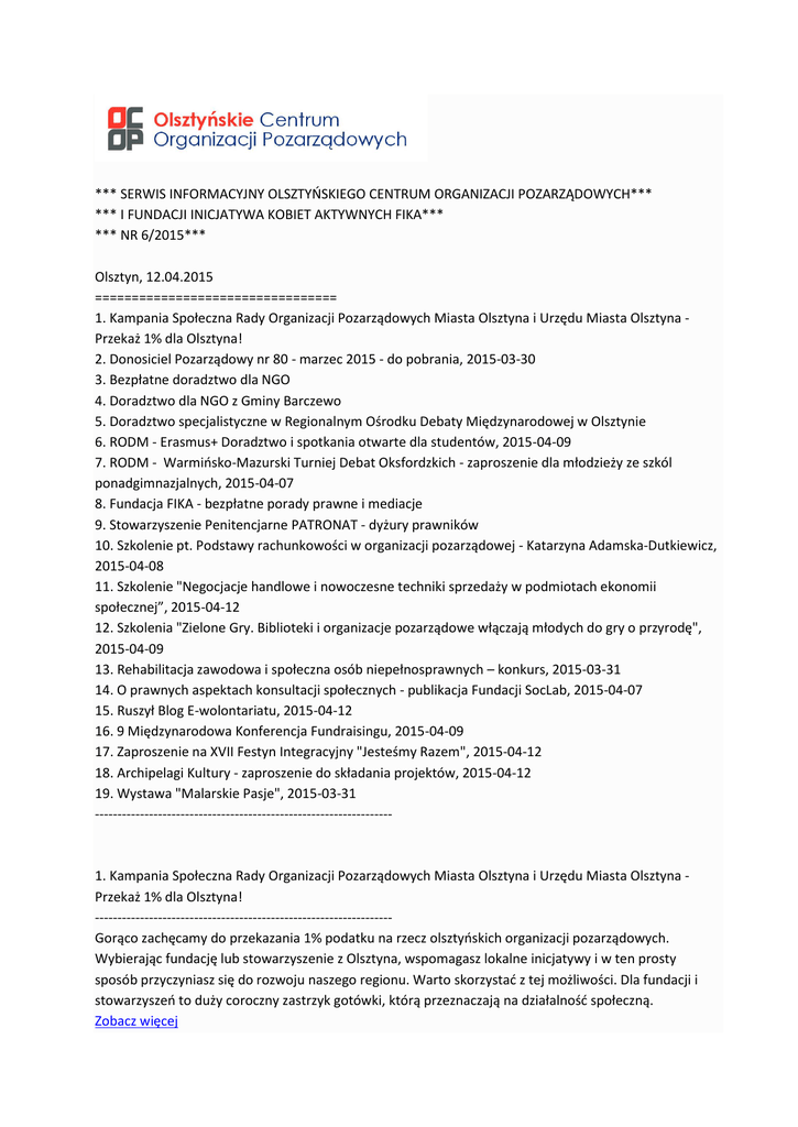 *** SERWIS INFORMACYJNY OLSZTYŃSKIEGO CENTRUM ORGANIZACJI POZARZĄDOWYCH*** *** I FUNDACJI INICJATYWA KOBIET AKTYWNYCH FIKA*** *** NR 6/2015*** Olsztyn, 12.04.2015 ================================= 1. Kampania Społeczna Rady Organizacji Pozarządowych Miasta Olsztyna i Urzędu Miasta Olsztyna Przekaż 1% dla Olsztyna! 2. Donosiciel Pozarządowy nr 80 - marzec 2015 - do pobrania, 2015-03-30 3. Bezpłatne doradztwo dla NGO 4. Doradztwo dla NGO z Gminy Barczewo 5. Doradztwo specjalistyczne w Regionalnym Ośrodku Debaty Międzynarodowej w Olsztynie 6. RODM - Erasmus+ Doradztwo i spotkania otwarte dla studentów, 2015-04-09 7. RODM - Warmińsko-Mazurski Turniej Debat Oksfordzkich - zaproszenie dla młodzieży ze szkól ponadgimnazjalnych, 2015-04-07 8. Fundacja FIKA - bezpłatne porady prawne i mediacje 9. Stowarzyszenie Penitencjarne PATRONAT - dyżury prawników 10. Szkolenie pt. Podstawy rachunkowości w organizacji pozarządowej - Katarzyna Adamska-Dutkiewicz, 2015-04-08 11. Szkolenie "Negocjacje handlowe i nowoczesne techniki sprzedaży w podmiotach ekonomii społecznej”, 2015-04-12 12. Szkolenia "Zielone Gry. Biblioteki i organizacje pozarządowe włączają młodych do gry o przyrodę", 2015-04-09 13. Rehabilitacja zawodowa i społeczna osób niepełnosprawnych – konkurs, 2015-03-31 14. O prawnych aspektach konsultacji społecznych - publikacja Fundacji SocLab, 2015-04-07 15. Ruszył Blog E-wolontariatu, 2015-04-12 16. 9 Międzynarodowa Konferencja Fundraisingu, 2015-04-09 17. Zaproszenie na XVII Festyn Integracyjny "Jesteśmy Razem", 2015-04-12 18. Archipelagi Kultury - zaproszenie do składania projektów, 2015-04-12 19. Wystawa "Malarskie Pasje", 2015-03-31 ------------------------------------------------------------------ 1. Kampania Społeczna Rady Organizacji Pozarządowych Miasta Olsztyna i Urzędu Miasta Olsztyna Przekaż 1% dla Olsztyna! -----------------------------------------------------------------Gorąco zachęcamy do przekazania 1% podatku na rzecz olsztyńskich organizacji pozarządowych. Wybierając fundację lub stowarzyszenie z Olsztyna, wspomagasz lokalne inicjatywy i w ten prosty sposób przyczyniasz się do rozwoju naszego regionu. Warto skorzystać z tej możliwości. Dla fundacji i stowarzyszeń to duży coroczny zastrzyk gotówki, którą przeznaczają na działalność społeczną. Zobacz więcej 2. Donosiciel Pozarządowy nr 80 - marzec 2015 - do pobrania, 2015-03-30 -----------------------------------------------------------------Zapraszamy do pobrania wersji pdf marcowego wydania Donosiciela Pozarządowego donosiciel_pozarzadowy_nr_80.pdf Donosiciel Pozarządowy jest biuletynem wydawanym w ramach projektu Olsztyńskie Centrum Organizacji Pozarządowych realizowanego przy współudziale finansowym Gminy Olsztyn. Jego wydawcą jest Związek Stowarzyszeń "Razem w Olsztynie". Zobacz więcej 3. Bezpłatne doradztwo dla NGO --------------------------------------------------------------------Olsztyńskie Centrum Organizacji Pozarządowych oferuje bezpłatną pomoc przy przygotowaniu ofert konkursowych. Organizacje zainteresowane ofertą OCOP proszone są o kontakt: [email protected] Tel. 503 680 500 Bezpłatne doradztwo uzyskać można również w zakresie m.in.: rozliczania ofert z realizacji zadań publicznych oraz pisania i rozliczania projektów. Osoby zajmujące się w organizacji sprawami księgowymi i finansowymi zapraszamy do skorzystania z bezpłatnego doradztwa w Olsztyńskim Centrum Organizacji Pozarządowych we wtorki g.17.00-18.00. Uwaga: Informujemy, że w kwietniu nie będzie odbywało się doradztwo z księgowości. Przepraszamy za utrudnienia. Miejsce: Olsztyńskie Centrum Organizacji Pozarządowych, ul. Tarasa Szewczenki 1, 10-274 Olsztyn mapa >> Doradztwo jest organizowane przez Związek Stowarzyszeń „Razem w Olsztynie” w ramach projektu „Olsztyńskie Centrum Organizacji Pozarządowych” realizowanego przy współudziale finansowym Gminy Olsztyn. 4. Doradztwo dla NGO z Gminy Barczewo -----------------------------------------------------------------Informujemy, że od marca do grudnia 2015 roku odbywa się stałe doradztwo indywidualne dla organizacji pozarządowych z gminy Barczewo adekwatne do zdiagnozowanych problemów w ramach projektu „W kierunku profesjonalizacji NGO” współfinansowanego ze środków otrzymanych z Gminy Barczewo. Zobacz więcej 5. Doradztwo specjalistyczne w Regionalnym Ośrodku Debaty Międzynarodowej w Olsztynie --------------------------------------------------------------------- Regionalny Ośrodek Debaty Międzynarodowej oferuje doradztwo specjalistyczne dla przedsiębiorców oraz przedstawicieli NGO. Więcej na stronie: http://rodm-olsztyn.pl/nasze-dzialania/doradztwo-stale/ 6. RODM - Erasmus+ Doradztwo i spotkania otwarte dla studentów, 2015-04-09 -----------------------------------------------------------------Zapraszamy na doradztwo Regionalnego Ośrodka Debaty Międzynarodowej w Olsztynie dotyczące aplikacji w programie ERASMUS+ Doradztwo poprowadzi Pani Magdalena Zielińska, Koordynatorka ds. Programu Erasmus+, Wydział Prawa i Administracji Uniwersytetu Warmińsko-Mazurskiego. Erasmus+ Szkolnictwo wyższe to sektor realizujący akcje 1 i 2 programu Erasmus+ w odniesieniu do szkolnictwa wyższego. Kontynuuje tradycje programu Erasmus, działającego w latach 2007-2013 w ramach programu „Uczenie się przez całe życie”. Erasmus+ Szkolnictwo wyższe promuje również udział w działaniach scentralizowanych programu Erasmus+ (akcja 3), zarządzanych przez Agencję ds. Kultury i Sektora Audiowizualnego (EACEA) w Brukseli. Zobacz więcej 7. RODM - Warmińsko-Mazurski Turniej Debat Oksfordzkich - zaproszenie dla młodzieży ze szkól ponadgimnazjalnych, 2015-04-07 -----------------------------------------------------------------Związek Stowarzyszeń "Razem w Olsztynie" prowadzący Regionalny Ośrodek Debaty Międzynarodowej zaprasza młodzież ze szkół ponadgimnazjalnych do udziału w I W