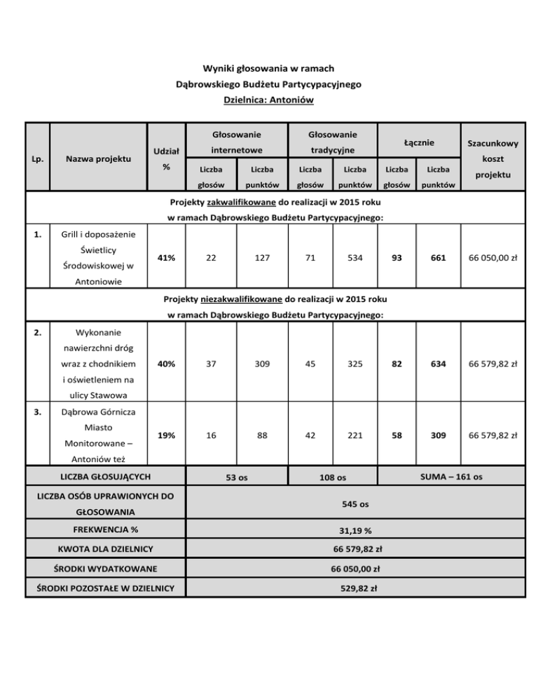 Wyniki głosowania w ramach Dąbrowskiego Budżetu Partycypacyjnego Dzielnica: Antoniów Lp. Nazwa projektu Udział % Głosowanie Głosowanie internetowe tradycyjne Łącznie Szacunkowy koszt Liczba Liczba Liczba Liczba Liczba Liczba głosów punktów głosów punktów głosów punktów 93 661 66 050,00 zł projektu Projekty zakwalifikowane do realizacji w 2015 roku w ramach Dąbrowskiego Budżetu Partycypacyjnego: 1. Grill i doposażenie Świetlicy Środowiskowej w 41% 22 127 71 534 Antoniowie Projekty niezakwalifikowane do realizacji w 2015 roku w ramach Dąbrowskiego Budżetu Partycypacyjnego: 2. Wykonanie nawierzchni dróg wraz z chodnikiem 40% 37 309 45 325 82 634 66 579,82 zł 19% 16 88 42 221 58 309 66 579,82 zł i oświetleniem na ulicy Stawowa 3. Dąbrowa Górnicza Miasto Monitorowane – Antoniów też LICZBA GŁOSUJĄCYCH LICZBA OSÓB UPRAWIONYCH DO GŁOSOWANIA 53 os 108 os 545 os FREKWENCJA % 31,19 % KWOTA DLA DZIELNICY 66 579,82 zł ŚRODKI WYDATKOWANE 66 050,00 zł ŚRODKI POZOSTAŁE W DZIELNICY 529,82 zł SUMA – 161 os