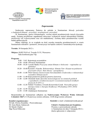 Instytut Geografii i Przestrzennego Zagospodarowania PAN Zaproszenie Serdecznie zapraszamy Państwa do udziału w Seminarium Metody pośrednie w badaniach klimatu - przeszłość, teraźniejszość, przyszłość. W Seminarium, oprócz klimatologów, wezmą udział przedstawiciele innych dyscyplin nauki. Zostaną przybliżone zagadnienia dotyczące wybranych metod rekonstrukcji klimatu, możliwości ich wykorzystania oraz ich mankamenty. Zostaną także przedstawione wyniki badań aplikacyjnych. Mamy nadzieję, że ze względu na dość szeroką tematykę przedstawianych w czasie Seminarium referatów i posterów, towarzyszyć im będzie ciekawa i konstruktywna dyskusja. Termin: 30 listopada 2012 r. Miejsce: IGiPZ PAN ul. Twarda 51/55, Warszawa Sala konferencyjna VIp Program: 9.00 - 9.45 Rejestracja uczestników 9.50 - 10.00 Otwarcie Seminarium 10.00 - 10.20 Leszek Marks Przyczyny zmian klimatu w holocenie – regionalne czy globalne? 10.20 - 10.40 Ryszard J. Kaczka Rekonstrukcja klimatu Tatr i Karpat na podstawie przyrostów drzew. Stan obecny i perspektywy 10.40 - 11.00 Piotr Gieszcz Zastosowanie biowskaźników środowiska w rekonstrukcji warunków klimatycznych 11.00 - 11.40 Sesja posterowa podczas przerwy kawowej 11.40 - 12.00 Dominik Szulc Zjawiska meteorologiczne na ziemiach polskich i sąsiednich w średniowiecznych i wczesnonowożytnych źródłach pisanych (X-XVI w.) 12.00 - 12.20 Robert Twardosz, Urszula Kossowska-Cezak Niezwykle gorące miesiące letnie w Europie Środkowej i Wschodniej (1951-2010) 12.20 - 12.50 Dyskusja 12.50 - 13.00 Zamknięcie Seminarium Bezpośrednio po Seminarium odbędzie się Nadzwyczajne Wyborcze Walne Zebranie Członków SKP (13.30 pierwszy termin zebrania, 14.00 drugi termin zebrania) Komitet organizacyjny: Dr hab. Elwira Żmudzka - Przewodnicząca Dr Anna Beata Adamczyk Dr Marek Chabor Mgr Paweł Milewski Kontakt: e-mail: [email protected] Udział w Seminarium jest bezpłatny. Prosimy o potwierdzenie udziału w Seminarium do dnia 5 listopada 2012 r. (karta zgłoszenia w załączeniu)
