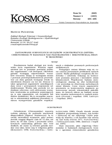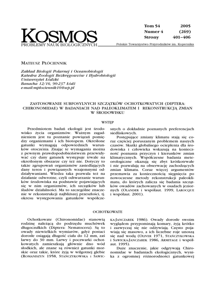 Tom 54 Numer 4 Strony 2005 (269) 401–406 Mateusz Płóciennik Zakład Biologii Polarnej i Oceanobiologii Katedra Zoologii Bezkręgowców i Hydrobiologii Uniwersytet Łódzki Banacha 12/16, 90-237 Łódź e-mail:[email protected] ZASTOSOWANIE SUBFOSYLNYCH SZCZĄTKÓW OCHOTKOWATYCH (DIPTERA: CHIRONOMIDAE) W BADANIACH NAD PALEOKLIMATEM I REKONSTRUKCJĄ ZMIAN W ŚRODOWISKU WSTĘP Przedmiotem badań ekologii jest środowisko życia organizmów. Ważnym zagadnieniem jest tu poznanie powiązań pomiędzy organizmami i ich biotopem. Określone gatunki wymagają odpowiednich warunków otoczenia. Znając te wymagania można z pewnym prawdopodobieństwem przewidywać czy dany gatunek występuje trwale na określonym obszarze czy też nie. Dotyczy to także zgrupowań organizmów zasiedlających dany teren i powiązanych wzajemnymi oddziaływaniami. Wiedza taka pozwala też na działanie odwrotne, czyli odtwarzanie warunków środowiska na podstawie pojawiających się w nim organizmów, ich szczątków lub śladów działalności. Ma to szczególne znaczenie w rekonstrukcji najbliższej przeszłości, tj. okresu występowania gatunków współcze- snych o dokładnie poznanych preferencjach siedliskowych. Postępujące zmiany klimatu stają się coraz częściej poruszanym problemem naszych czasów. Skutki globalnego ocieplenia dla środowiska i człowieka wskazują na konieczność poznania przyczyn i kierunków zmian klimatycznych. Współczesne badania meteorologiczne okazują się zbyt krótkotrwałe i nie pozwalają na obserwację zachodzących zmian klimatu. Coraz więcej argumentów przemawia za koniecznością sięgnięcia po nowoczesne metody rekonstrukcji paleoklimatu, do których zalicza się badania szczątków owadów zachowanych w osadach jeziornych (Olander i współaut. 1999, Larocque i współaut. 2001). OCHOTKOWATE Ochotkowate (Chironomidae) stanowią rodzinę należącą do podrzędu muchówek długoczułkich (Diptera: Nematocera). Są to owady niewielkich wymiarów, gdyż postaci dorosłe osiągają długość ciała do 12 mm, zaś larwy do 30 mm. Larwy i poczwarki ochotkowatych zamieszkują głównie dno wód słodkich, ale znane są również gatunki morskie oraz takie, które żyją w wilgotnej glebie (Romaniszyn 1958, Stańczykowska i Sawic- ka-janczarek 1986). Owady dorosłe swoim wyglądem przypominają komary, żyją krótko i zazwyczaj się nie odżywiają. Często pojawiają się masowo, a ich liczebne roje unoszą się nad wodą (Oliver 1971, Stańczykowska i Sawicka-janczarek 1986, Armitage i współaut. 1995). Duże znaczenie, jakie odgrywają Chironomidae w badaniach ekologicznych, wynika z ogromnej różnorodności gatunkowej 402 Mateusz Płóciennik tej rodziny i jej liczebnego występowania. W Europie znanych jest ok. 1200 gatunków i podgatunków (www.faunaeur.org) notowanych w rozmaitych siedliskach — od zimnych potoków lodowcowych i górskich (głównie ochotkowate z podrodziny Diamesinae, m.in. gatunki z rodzaju Diamesa czy Pseudodiamesa arctica), przez chłodne, czyste i dobrze natlenione strumienie wyżynne (podrodzina Orthocladinae oraz plemię Tanytarsini z pod- rodziny Chironominae), po wody cieplejsze i dna jezior, gdzie często problemem jest brak tlenu (plemię Chironomini z podrodziny Chironominae). Do ochotkowatych występujących masowo w wodach zanieczyszczonych należy np. Chironomus plumosus (Stańczykowska i Sawicka-janczarek 1986, Armitage i współaut. 1995, Lods-crozet i współaut. 2001). WYSTĘPOWANIE CHIRONOMIDAE A CZYNNIKI KLIMATYCZNE Badania paleolimnologiczne polegają przede wszystkim na analizie osadu jeziornego, zaś cennym materiałem badawczym są zachowane w nim puszki głowowe larw Chironomidae. Datowanie kolejnych warstw osadu metodą radiowęglową i analiza jego składu pozwalają na śledzenie historii badanego zbiornika i jego zlewiska. Zarówno w osadach jezior Kanady, jak i północnej Europy, na przestrzeni czasu od ostatniego zlodowacenia (10 000 lat temu), następowały istotne zmiany w składzie i liczebności szczątków poszczególnych taksonów Chironomidae.1 Ochotkowate reagują na różne czynniki środowiska wodnego i lądowego. Są to czynniki zarówno chemiczne, fizyczne, jak i morfometryczne. Odnajdowane szczątki tych drobnych muchówek mogą nam wiele powiedzieć o historii jeziora, w którym występowały. Dotychczas ochotkowate uznawano głównie za wskaźnik trofii zbiornika. Trzeba jednak uwzględnić także wpływ temperatury powietrza. Po ustaniu zlodowaceń ocieplenie klimatu zapewne zepchnęło gatunki wód zimnych (oligostenotermiczne) i ubogich (oligotroficzne) do głębszych partii jezior i chłodnych źródeł. Do takich należą m.in. gatunki z rodzaju Heterotrissocladius. Mniej więcej w tym samym okresie (12 000 a 8 000 BP2), w części jezior Kanady i Niemiec, Heterotrissocladius drastycznie zmniejszał swoją liczebność i w końcu stał się bardzo rzadki. W miarę upływu czasu wzrastała też trofia jezior. Ten czynnik wydaje się być jednak wtórny wobec zmian klimatycznych. Rozwój roślin wodnych i lądowych nastąpił ze względu na wydłużenie się termicznego lata i wzrost temperatur (Walker i Mathewes 1987). W celu określenia wpływu poszczególnych czynników środowiskowych na zbiorowiska ochotkowatych na przełomie Plejstocenu i Holocenu warto zwrócić uwagę na to, jak Chironomidae reagują na warunki arktyczne. Dominującą rolę zdaje się tu odgrywać klimat, a zwłaszcza stopniowy spadek temperatury wraz z wzrostem szerokości geograficznej i wysokości n.p.m. (Walker i Mathewes 1989). W płytkich jeziorach wody zbiornika mają ciągły kontakt z masami powietrza. Zarówno więc temperatura powietrza jak i wody ma dla larw i poczwarek istotne znaczenie (Larocque i współaut. 2001). Warto zaznaczyć, że dla owada dorosłego, zdolnego do dyspersji i kolonizacji nowych zbiorników, ważniejsza jest temperatura powietrza niż wody (Olander i współaut.1999). Temper