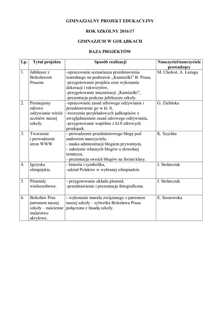 GIMNAZJALNY PROJEKT EDUKACYJNY ROK SZKOLNY 2016/17 GIMNAZJUM W GOŁĄBKACH BAZA PROJEKTÓW Lp. 1. 2. 3. 4. Tytuł projektu Sposób realizacji Jubileusz z Bolesławem Prusem. -opracowanie scenariusza przedstawienia teatralnego na podstawie „Kamizelki” B. Prusa, -przygotowanie projektu oraz wykonanie dekoracji i rekwizytów, -przygotowanie inscenizacji „Kamizelki”, -prezentacja podczas jubileuszu szkoły. Promujemy -opracowanie zasad zdrowego odżywiania i zdrowe przedstawienie go w kl. 0, odżywianie wśród -tworzenie przykładowych jadłospisów z uczniów naszej uwzględnieniem zasad zdrowego odżywiania, szkoły. -przygotowanie wspólnie z kl.0 zdrowych przekąsek. Tworzenie - prowadzenie przedmiotowego bloga pod i prowadzenie nadzorem nauczyciela, stron WWW - nauka administracji blogiem prywatnym, - założenie własnych blogów o dowolnej tematyce, - prezentacja swoich blogów na forum klasy. Igrzyska - historia i symbolika, olimpijskie. -udział Polaków w wybranej olimpiadzie. 5. Piramidy wieloosobowe. - przygotowanie układu piramid, -przedstawienie i prezentacja fotograficzna. 6. Bolesław Prus - wykonanie muralu związanego z patronem patronem naszej naszej szkoły – sylwetka Bolesława Prusa szkoły – naścienne połączona z fasadą szkoły. malarstwo akrylowe. Nauczyciel/nauczyciele prowadzący M. Chołost, A. Łazuga G. Zielińska K. Szychta J. Stolarczuk J. Stolarczuk E. Sosnowska