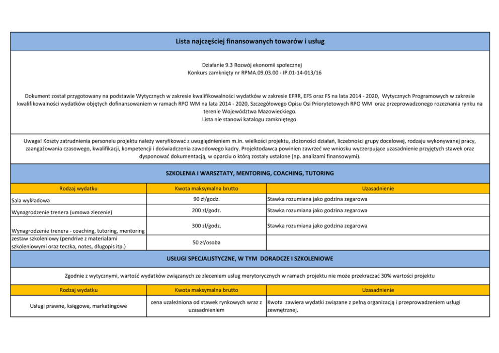 Lista najczęściej finansowanych towarów i usług Działanie 9.3 Rozwój ekonomii społecznej Konkurs zamknięty nr RPMA.09.03.00 - IP.01-14-013/16 Dokument został przygotowany na podstawie Wytycznych w zakresie kwalifikowalności wydatków w zakresie EFRR, EFS oraz FS na lata 2014 - 2020, Wytycznych Programowych w zakresie kwalifikowalności wydatków objętych dofinansowaniem w ramach RPO WM na lata 2014 - 2020, Szczegółowego Opisu Osi Priorytetowych RPO WM oraz przeprowadzonego rozeznania rynku na terenie Województwa Mazowieckiego. Lista nie stanowi katalogu zamkniętego. Uwaga! Koszty zatrudnienia personelu projektu należy weryfikować z uwzględnieniem m.in. wielkości projektu, złożoności działań, liczebności grupy docelowej, rodzaju wykonywanej pracy, zaangażowania czasowego, kwalifikacji, kompetencji i doświadczenia zawodowego kadry. Projektodawca powinien zawrzeć we wniosku wyczerpujące uzasadnienie przyjętych stawek oraz dysponować dokumentacją, w oparciu o którą zostały ustalone (np. analizami finansowymi). SZKOLENIA I WARSZTATY, MENTORING, COACHING, TUTORING Rodzaj wydatku Kwota maksymalna brutto Uzasadnienie Sala wykładowa 90 zł/godz. Stawka rozumiana jako godzina zegarowa Wynagrodzenie trenera (umowa zlecenie) 200 zł/godz. Stawka rozumiana jako godzina zegarowa 300 zł/godz. Stawka rozumiana jako godzina zegarowa Wynagrodzenie trenera - coaching, tutoring, mentoring zestaw szkoleniowy (pendrive z materiałami szkoleniowymi oraz teczka, notes, długopis itp.) 50 zł/osoba USŁUGI SPECJALISTYCZNE, W TYM DORADCZE I SZKOLENIOWE Zgodnie z wytycznymi, wartość wydatków związanych ze zleceniem usług merytorycznych w ramach projektu nie może przekraczać 30% wartości projektu Rodzaj wydatku Usługi prawne, księgowe, marketingowe Kwota maksymalna brutto Uzasadnienie cena uzależniona od stawek rynkowych wraz z Kwota zawiera wydatki związane z pełną organizacją i przeprowadzeniem usługi uzasadnieniem zewnętrznej. Wózki widłowe (jezdniowe) 850,00 zł Kurs obsługi betoniarki 770,00 zł Operator koparko - ładowarki 1 400,00 zł Spawanie metodą TIG 1 950,00 zł Kurs prawo jazdy kat.B 1 200,00 zł Kurs prawo jazdy kat.C 2 100,00 zł Kurs prawo jazdy kat C + E 2 000,00 zł Kurs prawo jazdy kat D 3 500,00 zł Język angielski/ niemiecki 1 800,00 zł Projektowanie komputerowe z wykorzystaniem AUTOCAD 1 200,00 zł Grafika komputerowa PHOTOSHOP 1 000,00 zł Grafika komputerowa Corel 800,00 zł Tworzenie stron www 1 200,00 zł Kadry i płace 1 450,00 zł Kasjer - sprzedawca 950,00 zł Florystyka 1 700,00 zł Instruktor fitness 1 000,00 zł Dietetyczka 700,00 zł Pracownik ochrony mienia 1 400,00 zł Kosmetyczka 1 400,00 zł Rachunkowość/księgowość 2 800,00 zł Wizażysta 1 800,00 zł Usługa zawiera wydatki związane z pełną organizacją i przeprowadzeniem szkolenia, m.in. wynagrodzenie wykładowcy; wynajęcie/eksploatacja sal (w tym sali dostosowanej do potrzeb osób z niepełnosprawnościami); materiały szkoleniowe; podręczniki, sprzęt techniczny np. laptop, dojazdy wykonawcy do miejsca świadczenia usługi, noclegi, wyżywienie wykonawcy w miejscu realizacji usługi. Nie należy wykazywać odrębnie tych kosztów w budżecie. Fryzjer 1 500,00 zł Kelner/Barman 600,00 zł masażysta 800,00 zł Autoprezentacja 450,00 zł Zarządzanie czasem 1 000,00 zł USŁUGI DORADCZE Rodzaj wydatku Kwota maksymalna brutto Uzasadnienie doradca prawny 150 zł/godz. Stawka rozumiana jako godzina zegarowa doradca biznesowy 150 zł/godz. Stawka rozumiana jako godzina zegarowa doradca finansowy 150 zł/godz. Stawka rozumiana jako godzina zegarowa doradca z obszaru branżowego działalności 100 zł/godz. Stawka rozumiana jako godzina zegarowa WIZYTY STUDYJNE Projektodawca powinien zawrzeć we wniosku o dofinansowanie wyczerpujące uzasadnienia przyjętych stawek oraz dysponować dokumentacją, w oparciu o którą zostały ustalone. Planując koszty przedsięwzięcia należy kierować się następującymi zasadami: • niezbędności wydatków w kontekście osiągnięcia celu projektu, • efektywności, • racjonalności wydatku PERSONEL SPECJALISTYCZNY Personel projektu niezbędnego do realizacji zadań merytorycznych, z wyłączeniem personelu który zgodnie z Wytycznymi w zakresie kwalifikowalności wydatków w ramach Europejskiego Funduszu Rozwoju Regionalnego, Europejskiego Funduszu Społecznego oraz Funduszu Spójności na lata 2014-2020 ujęty jest w kosztach pośrednich Rodzaj wydatku Animator OWES (umowa zlecenie) Kwota maksymalna brutto 150 zł/godz. Uzasadnienie Stawka rozumiana jako godzina zegarowa Psycholog (umowa zlecenie) 100 zł/godz. Stawka rozumiana jako godzina zegarowa Doradca zawodowy (umowa zlecenie) 100 zł/godz. Stawka rozumiana jako godzina zegarowa Specjalista ds. budowania partnerstw (umowa zlecenie) 200 zł/godz. Stawka rozumiana jako godzina zegarowa WYDATKI TOWARZYSZĄCE Rodzaj wydatku Kwota maksymalna brutto Uzasadnienie Wydatek kwalifikowalny jedynie w przypadku uczestniczenia we wsparciu oferowanym poza miejscem zamieszkania oraz w związku z uzasadnionymi potrzebami grupy docelowej (np. koszty dojazdów dla osób niepełnosprawnych, bezrobotnych). Zaleca się, aby podróż odbywała się publicznymi/zbiorowymi środkami transportu, z wyjątkiem gdy na danym terenie są uzasadnione powody dla innej formy podróży. Wydatek kwalifikowalny do wysokości opłat za środki transportu publicznego szynowego lub kołowego (w przypadku podróży międzynarodowych także transportu lotniczego) zgodnie z cennikiem biletów II klasy obowiązującym na danym obszarze, także w przypadku korzystania ze środków transportu prywatnego (w szczególności samochodem lub taksówką) jako refundacja wydatku faktycznie poniesionego do ww. wysokości. zwrot kosztów dojazdu Cena uzależniona od cenników operatorów komunikacji publicznej nocleg w kraju Wydatek kwalifikowalny, o ile jest to uzasadnione specyfiką i celami realizowanego projektu.
