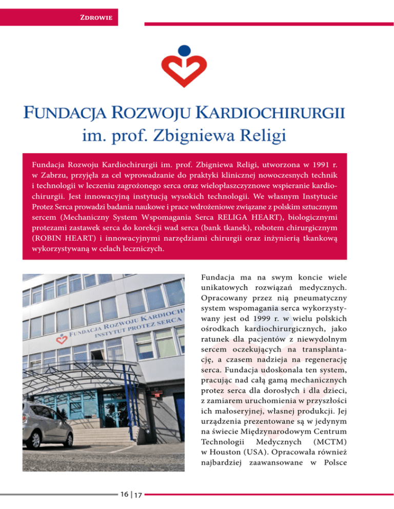 Zdrowie Fundacja Rozwoju Kardiochirurgii im. prof. Zbigniewa Religi, utworzona w 1991 r. w Zabrzu, przyjęła za cel wprowadzanie do praktyki klinicznej nowoczesnych technik i technologii w leczeniu zagrożonego serca oraz wielopłaszczyznowe wspieranie kardiochirurgii. Jest innowacyjną instytucją wysokich technologii. We własnym Instytucie Protez Serca prowadzi badania naukowe i prace wdrożeniowe związane z polskim sztucznym sercem (Mechaniczny System Wspomagania Serca RELIGA HEART), biologicznymi protezami zastawek serca do korekcji wad serca (bank tkanek), robotem chirurgicznym (ROBIN HEART) i innowacyjnymi narzędziami chirurgii oraz inżynierią tkankową wykorzystywaną w celach leczniczych. Fundacja ma na swym koncie wiele unikatowych rozwiązań medycznych. Opracowany przez nią pneumatyczny system wspomagania serca wykorzystywany jest od 1999 r. w wielu polskich ośrodkach kardiochirurgicznych, jako ratunek dla pacjentów z niewydolnym sercem oczekujących na transplantację, a czasem nadzieja na regenerację serca. Fundacja udoskonala ten system, pracując nad całą gamą mechanicznych protez serca dla dorosłych i dla dzieci, z zamiarem uruchomienia w przyszłości ich małoseryjnej, własnej produkcji. Jej urządzenia prezentowane są w jedynym na świecie Międzynarodowym Centrum Technologii Medycznych (MCTM) w Houston (USA). Opracowała również najbardziej zaawansowane w Polsce 16 | 17 Fundacja Rozwoju Kardiochirurgii metody doradcze chirurgii oparte o symulacje komputerowe i modelowanie fizyczne oraz pionierskie metody planowania operacji wykorzystujące technologie wirtualnej przestrzeni. Zainicjowała i kontynuuje prace nad opracowaniem rodziny robotów chirurgicznych Robin Heart i manualno-zrobotyzowanych narzędzi chirurgicznych. Planuje opracowanie i badania systemu sterowania na odległość robotem, tzw. teleoperacji oraz zastosowanie opracowanych narzędzi i nowych technik operacji do implantacji i serwisowania sztucznych narządów, w tym sztucznego serca. Prowadzi również prace nad wykorzystaniem nowoczesnych biomateriałów w kardiochirurgii, nad wykorzystaniem komórek macierzystych w nowej, biologicznej zastawki serca oraz w rekonstrukcji i plastyce mięśnia sercowego. Fundacja współfinansuje publikacje naukowe i dydaktyczne. Organizuje specjalistyczne warsztaty, konferencje i sympozja. Promuje aktywny, zdrowy styl życia jako najlepszą profilaktykę chorób serca. Prowadzi także program szkoleniowo-stypendialny dla kadr medycznych z Polski i zagranicy. Jest nowoczesnym, zasłużonym dla polskiej kardiochirurgii ośrodkiem naukowo-badawczym oraz centrum wymiany myśli i doświadczeń. Jej osiągnięcia w zakresie nowych technologii medycznych od lat zdobywają uznanie w kraju i na świecie, o czym świadczą liczne nagrody i wyróżnienia. Działalność Fundacji możliwa jest dzięki środkom pochodzącym z darowizn, subwencji, dotacji oraz funduszy unijnych. Najhojniejsi sprzymierzeńcy Fundacji, co roku nagradzani są podczas koncertów „Serce za serce”, organizowanych z udziałem znakomitych gwiazd i wspaniałych gości. Fundację wspierać można również przekazując jej 1% podatku dochodowego od osób fizycznych. ■