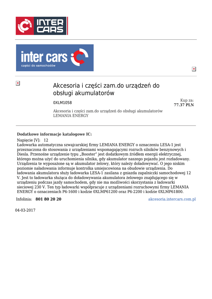 Akcesoria i części zam.do urządzeń do obsługi akumulatorów Kup za: 77.37 PLN 0XLM1058 Akcesoria i części zam.do urządzeń do obsługi akumulatorów LEMANIA ENERGY Dodatkowe informacje katalogowe IC: Napięcie [V]: 12 Ładowarka automatyczna szwajcarskiej firmy LEMIANA ENERGY o oznaczeniu LESA-1 jest przeznaczona do stosowania z urządzeniami wspomagającymi rozruch silników benzynowych i Diesla. Przenośne urządzenie typu „Booster” jest dodatkowym źródłem energii elektrycznej, którego można użyć do uruchomienia silnika, gdy akumulator naszego pojazdu jest rozładowany. Urządzenia te wyposażone są w akumulator żelowy, który należy doładowywać. O jego niskim poziomie naładowania informuje kontrolka umiejscowiona na obudowie urządzenia. Do ładowania akumulatora służy ładowarka LESA-1 zasilana z gniazda zapalniczki samochodowej 12 V. Jest to ładowarka służąca do doładowywania akumulatora żelowego znajdującego się w urządzeniu podczas jazdy samochodem, gdy nie ma możliwości skorzystania z ładowarki sieciowej 230 V. Ten typ ładowarki współpracuje z urządzeniami rozruchowymi firmy LEMANIA ENERGY o oznaczeniach P6-1600 i kodzie 0XLMP61200 oraz P6-2200 i kodzie 0XLMP61800. Infolinia: 801 80 20 20 04-03-2017 akcesoria.intercars.com.pl