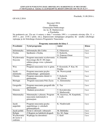 GIMNAZJUM PUBLICZNE IM.KS. BRONISŁAWA MARKIEWICZA W PRUCHNIKU 37-560 Pruchnik ul. Szkolna 12, tel.(016)6289716; REGON 650951284 NIP:792-19-76-277 Pruchnik, 31.08.2016 r. GP.418.2.2016 Decyzja1/2016 Dyrektora Gimnazjum Publicznego im. ks. B. Markiewicza w Pruchniku Na podstawie art. 22a ust. 6 ustawy z dnia 7 września 1991 r. o systemie oświaty (Dz. U. z 2015 r., poz. 2156 z późn. zm.), dopuszczam następujące programy do użytku szkolnego wpisując je do Szkolnego Zestawu Programów Nauczania: Przedmiot Programy nauczania do klasy I Tytuł programu Autor Klasa Informatyka Fizyka Informatyka dla Ciebie Spotkanie z fizyką I a-e I a-e Wychowanie fizyczne Program nauczania wychowania fizycznego dla II i III etapu edukacyjnego wraz z planami pracy…. Program nauczania wos w gimn. E. Filinowicz T. Kulawik, G. Francuz-Ornat S. Żołyński P. Krzesicki, P. Kur, M. Poręba M. Wawrzyniak I a-e T. Kulawik. M. Litwin A. Zdziennicka I a-e E. Tuz I a-e T. Kowalewska T. Maćkowski M. Jucewicz, M. Karpiński, J. Lech I a-e K. Niedźwiedź I a-e M. Bobińska Ks. M. Zając T. Król I a-e I a-e I a-e Wos Język niemiecki Chemia Biologia Geografia Historia Program nauczania języka niemieckiego - gimnazjum Program nauczania chemii w gimnazjum Program nauczania Puls Życia Program nauczania geografii dla gimnazjum Śladami przeszłości Matematyka Matematyka z plusem. Program nauczania matematyki w gimnazjum Język angielski Program nauczania języka angielskiego w szkołach gimnazjalnych. Świat w słowach i obrazach Z Bogiem na ludzkich drogach Wędrując ku dorosłości Język polski Religia Wychowanie do życia w rodzinie I a-e I a-e I a-e I a-e GIMNAZJUM PUBLICZNE IM.KS. BRONISŁAWA MARKIEWICZA W PRUCHNIKU 37-560 Pruchnik ul. Szkolna 12, tel.(016)6289716; REGON 650951284 NIP:792-19-76-277 Przedmiot Programy nauczania do klasy II Tytuł programu Autor Informatyka Informatyka – program nauczania dla gim. Fizyka Spotkanie z fizyką Wychowanie fizyczne Program nauczania wychowania fizycznego dla II i III etapu edukacyjnego wraz z planami pracy…. Dziś i jutro Program nauczania języka niemieckiego - gimnazjum Program nauczania chemii w gimnazjum Program nauczania Puls Życia Wos Język niemiecki Chemia Biologia Geografia Historia Matematyka Język angielski Język polski Religia Wychowanie do życia w rodzinie Zajęcia techniczne Zajęcia artystyczne Program nauczania geografii dla gimnazjum Śladami przeszłości Matematyka z plusem. Program nauczania matematyki w gimnazjum Program nauczania języka angielskiego w szkołach gimnazjalnych. Świat w słowach i obrazach Z Bogiem na ludzkich drogach Wędrując ku dorosłości Technika w praktyce- zajęcia mechaniczno-motoryzacyjne i zajęcia elektroniczne. Zajęcia krawieckie. Kraina sztuki Klasa E. Gurbiel, E. Kołczyk, H. Krupicka M. Sysło, G. Hardt-Olejniczak T. Kulawik, G. Francuz-Ornat S. Żołyński II a-e T. Kowalewska M. Wawrzyniak II a-e II a-e T. Kulawik. M. Litwin A. Zdziennicka II a-e E. Tuz II a-e T. Kowalewska T. Maćkowski M. Jucewicz, M. Karpiński, J. Lech II a-e K. Niedźwiedź II a-e M. Bobińska Ks. M. Zając T. Król II a-e II a-e II a-e W. Czyżewski II a-e B. Marcinkowska, L. Fryduńska-Świątczak II a-e Przedmiot Programy nauczania do klasy III Tytuł programu Autor Zajęcia techniczne Technika w praktyce- zajęcia W. Czyżewski mechaniczno-motoryzacyjne II a-e II a-e II a-e II a-e Klasa III a-d GIMNAZJUM PUBLICZNE IM.KS. BRONISŁAWA MARKIEWICZA W PRUCHNIKU 37-560 Pruchnik ul. Szkolna 12, tel.(016)6289716; REGON 650951284 NIP:792-19-76-277 Język polski Historia Język angielski Matematyka Fizyka Chemia Biologia Geografia Informatyka Wychowanie fizyczne Religia Język niemiecki Zajęcia artystyczne Wychowanie do życia w rodzinie i zajęcia elektroniczne. Zajęcia krawieckie. Świat w słowach i obrazach Śladami przeszłości M. Bobińska T. Kowalewska T. Maćkowski III a-d III a-d K. Niedźwiedź III a-d J. Janowicz G. Francuz – Ornat T. Kulawik T. Kulawik M. Litwin A. Zdziennicka III a-d III a-d E. Tuz III a-d E. Gurbiel, E. Kołczyk H. Krupicka M. Sysło G. Hardt – Olejniczak P. Wróblewski III a-d Ks. M. Zając III a-d M. Wawrzyniak II a-d III a-d Wędrując ku dorosłości B. Marcinkowska, L. Fryduńska-Świątczak T. Król Muzyczny świat T. Wójcik III a-d Program nauczania edukacji dla bezpieczeństwa J. Słoma III a-d Kraina sztuki. Plastyka E. Jezierska III a-d Program nauczania języka angielskiego w szkołach gimnazjalnych. Policzmy to razem Spotkanie z fizyką Program nauczania chemii w gimnazjum Program nauczania Puls życia Program nauczania geografii dla gimnazjum Informatyka – program nauczania dla gimnazjum Program nauczania wychowania fizycznego dla II i III etapu edukacyjnego wraz z planami pracy…. Z Bogiem na ludzkich drogach Program nauczania języka niemieckiego - gimnazjum Kraina sztuki III a-d III a-d III a-d III a-d Muzyka Edukacja dla bezpieczeństwa Plastyka