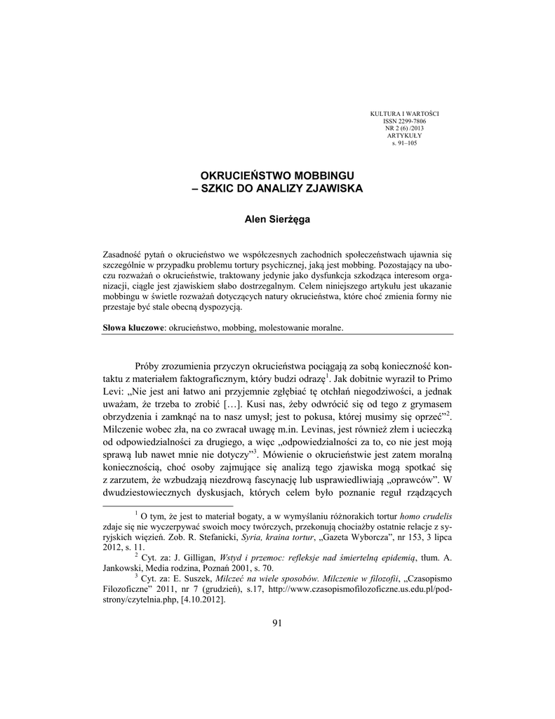 KULTURA I WARTOŚCI ISSN 2299-7806 NR 2 (6) /2013 ARTYKUŁY s. 91–105 OKRUCIEŃSTWO MOBBINGU – SZKIC DO ANALIZY ZJAWISKA Alen Sierżęga Zasadność pytań o okrucieństwo we współczesnych zachodnich społeczeństwach ujawnia się szczególnie w przypadku problemu tortury psychicznej, jaką jest mobbing. Pozostający na uboczu rozważań o okrucieństwie, traktowany jedynie jako dysfunkcja szkodząca interesom organizacji, ciągle jest zjawiskiem słabo dostrzegalnym. Celem niniejszego artykułu jest ukazanie mobbingu w świetle rozważań dotyczących natury okrucieństwa, które choć zmienia formy nie przestaje być stale obecną dyspozycją. Słowa kluczowe: okrucieństwo, mobbing, molestowanie moralne. Próby zrozumienia przyczyn okrucieństwa pociągają za sobą konieczność kontaktu z materiałem faktograficznym, który budzi odrazę1. Jak dobitnie wyraził to Primo Levi: „Nie jest ani łatwo ani przyjemnie zgłębiać tę otchłań niegodziwości, a jednak uważam, że trzeba to zrobić […]. Kusi nas, żeby odwrócić się od tego z grymasem obrzydzenia i zamknąć na to nasz umysł; jest to pokusa, której musimy się oprzeć” 2. Milczenie wobec zła, na co zwracał uwagę m.in. Levinas, jest również złem i ucieczką od odpowiedzialności za drugiego, a więc „odpowiedzialności za to, co nie jest moją sprawą lub nawet mnie nie dotyczy”3. Mówienie o okrucieństwie jest zatem moralną koniecznością, choć osoby zajmujące się analizą tego zjawiska mogą spotkać się z zarzutem, że wzbudzają niezdrową fascynację lub usprawiedliwiają „oprawców”. W dwudziestowiecznych dyskusjach, których celem było poznanie reguł rządzących 1 O tym, że jest to materiał bogaty, a w wymyślaniu różnorakich tortur homo crudelis zdaje się nie wyczerpywać swoich mocy twórczych, przekonują chociażby ostatnie relacje z syryjskich więzień. Zob. R. Stefanicki, Syria, kraina tortur, „Gazeta Wyborcza”, nr 153, 3 lipca 2012, s. 11. 2 Cyt. za: J. Gilligan, Wstyd i przemoc: refleksje nad śmiertelną epidemią, tłum. A. Jankowski, Media rodzina, Poznań 2001, s. 70. 3 Cyt. za: E. Suszek, Milczeć na wiele sposobów. Milczenie w filozofii, „Czasopismo Filozoficzne” 2011, nr 7 (grudzień), s.17, http://www.czasopismofilozoficzne.us.edu.pl/podstrony/czytelnia.php, [4.10.2012]. 91 A. SIERŻĘGA – OKRUCIEŃSTWO MOBBINGU... ludzką destrukcyjnością, prym wiodły koncepcje odnoszące się do instynktywizmu, behawioryzmu czy psychoanalizy. Zdumiewa nieobecność wątków moralnych i etycznych4. Ze względu na swoistą trudność tematu, zasadna wydaje się próba spojrzenia na zjawisko okrucieństwa z punktu widzenia różnych dyscyplin naukowych, ale ważne jednak przy tym – co wskazywał W. Nowak – by w takich rozważaniach nie zagubić perspektywy metafizycznej5. Być może właśnie w crudelitas najwyraźniej uwidacznia się transcendentny wymiar fenomenu zła. PROBLEMY DEFINICJI I MOTYWACJI Okrucieństwo jest ekstremalną formą zachowań, które zbiorczo określamy terminami agresja lub przemoc. O ile jednak oba te terminy nie mają wyraźnie dookreślonych semantycznych granic6, często bywają stosowane zamiennie lub do opisu zgoła odmiennych zjawisk, o tyle w literaturze, mimo pewnych różnic, istnieje zgoda co do węższego znaczeniowo pojęcia okrucieństwa. M. Zdziechowski w krótkim, lecz pełnym pasji studium nawiązując do René Guyona i pisze: „Okrucieństwo polega na umyślnym i rozmyślnym sprawianiu cierpienia istocie żywej, czującej. Okrucieństwo jest dla okrutnika rozkoszą, […] pastwić się bowiem, możemy tylko nad istotą słabszą, bezbronną – lew w klatce na łasce jest u dziecka. Nie dość tego, w okrucieństwie mamy najbardziej odrażającą formę podłości. Można tłumaczyć czyn podły spełniony ze strachu, albo dla interesu, ale podłość dla rozkoszy pastwienia się nad tym, kto się bronić nie jest w stanie, nie może nie budzić pogardy najgłębszej w każdym, kto ma w sobie choćby podobieństwo jakieś tego, co się sumieniem nazywa. Okrucieństwo wprowadza w szał, w stan bliski obłędu […]”. A dalej wskazuje, że to, co zwykle ludzi bę4 Zob. R. Syska, Agresja i zło. Ścieżki XX-wiecznej destrukcyjności, [w:] Przemoc ikoniczna, czy „nowa widzialność”?, red. E. Wilk, Wydawnictwo Uniwersytetu Śląskiego, Łódź 2001, s. 9–48. 5 Zob. W. Nowak, Okrucieństwo i kultura współczesna – próba cząstkowej diagnozy z nieustającym odniesieniem do historii, „Edukacja humanistyczna” 2006, nr 1 (14), s. 50–51. 6 S. Amsterdamski analizując efekty prac zespołu naukowców (filozofów, socjologów, historyków, psychologów, neurofizjologa, biologa, prawnika i teoretyka kultury), którzy uczestniczyli w spotkaniach poświęconych zagadnieniom nienawiści, agresji i przemocy, pisze: „[...] znalezienie wspólnego określenia dla tak różnych, wymienionych tam zachowań wydaje się niemożliwe; każde określenie bywa operacyjnie przydatne w jakiejś dziedzinie, ale żadne nie może pretendować do wartości uniwersalnej […]. Kiedy zaś na terenie rozmaitych dyscyplin dookreśla się jakoś jego znaczenie, zakres stosowalności, wbrew potocznemu uzusowi, staje się siłą rzeczy ograniczony”. Zob. Człowiek i agresja. Głosy o nienawiści i przemocy. Ujęcie interdyscyplinarne, przedmowa S. Amsterdamski, Wydawnictwo Sic!, Warszawa 2002, s. 15. 92 A. SIERŻĘGA – OKRUCIEŃSTWO MOBBINGU... dących świadkami cierpienia, „oburza i przeraża, to go [człowieka okrutnego] pociąga i cieszy; on się zacina i zatwardza w namiętności swojej”7. Mamy tu kilka elementów, które pozwalają zaliczyć dany czyn do kategorii czynów okrutnych. Po pierwsze, świadomość jego popełnienia, postrzegana w prawie karnym jako niezbędny element winy: actus non facit reum nisi mens sit rea (czyn nie znaczy o winie, póki nie jest winny również umysł). Oczywiście, podejście prawno-e