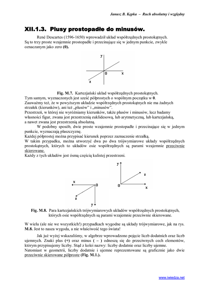 Janusz B. Kępka – Ruch absolutny i względny XII.1.3. Plusy prostopadłe do minusów. René Descartes (1596-1650) wprowadził układ współrzędnych prostokątnych. Są to trzy proste wzajemnie prostopadłe i przecinające się w jednym punkcie, zwykle oznaczanym jako zero (0). Fig. M.7. Kartezjański układ współrzędnych prostokątnych. Tym samym, wyznaczonych jest sześć półprostych o wspólnym początku w 0. Zauważmy też, że w powyższym układzie współrzędnych prostokątnych nie ma żadnych strzałek (kierunków), ani też „plusów” i „minusów”. Przestrzeń, w której nie wyróżniamy kierunków, także plusów i minusów, lecz badamy własności figur, zwana jest przestrzenią euklidesową, lub arytmetyczną, lub kartezjańską, a nawet zwana jest przestrzenią absolutną. W podobny sposób, dwie proste wzajemnie prostopadłe i przecinające się w jednym punkcie, wyznaczają płaszczyznę. Każdej półprostej można przypisać kierunek poprzez zaznaczenie strzałką. W takim przypadku, można utworzyć dwa po dwa trójwymiarowe układy współrzędnych prostokątnych, których to układów osie współrzędnych są parami wzajemnie przeciwnie skierowane. Każdy z tych układów jest ósmą częścią kulistej przestrzeni. Fig. M.8. Para kartezjańskich trójwymiarowych układów współrzędnych prostokątnych, których osie współrzędnych są parami wzajemnie przeciwnie skierowane. W wielu (ale nie we wszystkich!) przypadkach wygodne są układy trójwymiarowe, jak na rys. M.8. Jest to nasza wygoda, a nie właściwość tego świata! Jak już wyżej wskazaliśmy, w algebrze wprowadzono pojęcie liczb dodatnich oraz liczb ujemnych. Znaki plus (+) oraz minus ( – ) odnoszą się do przeciwnych cech elementów, którym przypisujemy liczby. Stąd z kolei nazwy: liczby dodatnie oraz liczby ujemne. Natomiast w geometrii, liczby dodatnie i ujemne reprezentowane są graficznie jako dwie przeciwnie skierowane półproste (Fig. M.1.). www.iwiedza.net Janusz B. Kępka – Ruch absolutny i względny Jeżeli do geometrii wprowadzimy znaki plus oraz minus, to otrzymamy trójwymiarowe układy współrzędnych prostokątnych o przeciwnych znakach, dokładnie dla przeciwnych kierunków. Fig. M.9. Dwa przeciwnych znaków układy współrzędnych prostokątnych. Jeżeli teraz powyższe dwa układy zsuniemy ze sobą tak, aby miały wspólny początek w 0, to otrzymamy układ jak niżej. Fig. M.10. Złożenie dwu układów o przeciwnych znakach. A teraz, uwaga! Optycznie powstał jeden(!) układ, w którym PLUSY SĄ PROSTOPADŁE DO MINUSÓW !!! Ale nie jest to prawda, ponieważ na rys. M.10. są dwa układy według rys. M.9. Jednak w matematyce rysuje się układy współrzędnych prostokątnych, w których jednak „plusy są prostopadłe do minusów”. Dokładnie jak na rys. M.10. Spróbujmy więc zastosować twierdzenie Pitagorasa do obliczenia wartości przeciwprostokątnej trójkąta prostokątnego w układzie według rys. M.10. Fig. M.11. Twierdzenie Pitagorasa dla „prostopadłych” liczb dodatnich i ujemnych w kartezjańskim układzie współrzędnych prostokątnych. I ćwiartka. (+a)2 + (+b)2 = (+16) + (+9) = (+25); c = ( +25) = ( +5) Dokładnie taką samą wartość liczbową otrzymamy dla liczb bezwzględnych. www.iwiedza.net Janusz B. Kępka – Ruch absolutny i względny II ćwiartka. (–a)2 + (+b)2 = ? Mamy: Gdybyśmy zastosowali wskazaną przez nas wyżej regułę, że operacja mnożenia, potęgowania, także operacja pierwiastkowania, nie zmienia znaku tych liczb, to otrzymalibyśmy: (–16) + (+9) = (–7); c = ( -7 ) = ( -2,645...). Jak widać, w tym przypadku nie można zastosować twierdzenia Pitagorasa. Wobec tego, „uczeni w piśmie” wymyślili dodatkową regułę, według której iloczyn liczb tego samego znaku, tak ujemnych jak i dodatnich, zawsze daje w wyniku liczbę… dodatnią, i wtedy otrzymują: (–a)2 + (+b)2 = (+a)2 + (+b)2 = a2 + b2 = (+c)2 = c2 czyli dodatnią wartość c (Fig. M.11.). Taki samą wartość liczbową otrzymuje się dla liczb bezwzględnych. III ćwiartka. Fig. M.12. Twierdzenie Pitagorasa dla „prostopadłych” liczb dodatnich i ujemnych w kartezjańskim układzie współrzędnych prostokątnych. Matematycy otrzymują: ( -a) 2 + ( - b ) 2 = +c 2 Natomiast według wskazanej przez nas wyżej reguły, mamy: ( -a ) 2 + ( -b ) 2 = -c 2 . Z kolei, mamy też: - c 2 = - c . I jest to długość odcinka przeciwnie skierowanego do odcinka (+c) w I ćwiartce. Ale matematycy twierdzą, że jest to długość odcinka (boku kwadratu) w II ćwiartce. W IV ćwiartce jest podobnie jak w II ćwiartce. Powyższe trudności wynikają stąd, że pierwotnie twierdzenie Pitagorasa stosowano dla liczb bezwzględnych. Stąd z kolei sugestia, że twierdzenie to odnosi się tylko do operacji dodawania liczb dodatnich. Ale równie dobrze można przyjąć, że twierdzenie to odnosi się także do sumowania liczb ujemnych. Nie uwzględnia się także, że sumowanie liczb przeciwnego znaku jest równoważne odejmowaniu liczb bezwzględnych. Odcinkom przeciwnie skierowanym przypisuje się liczby przeciwnego znaku. Równie dobrze, liczby przeciwnego znaku można przypisać powierzchniom, np. kwadratom. www.iwiedza.net Janusz B. Kępka – Ruch absolutny i względny Fig. M.13. Twierdzenie Pitagorasa dla liczb dodatnich i ujemnych. Pole kwadratu: w I ćwiartce: Sa = (+a)2 , a w III ćwiartce: Sb = (–b)2 . Pola te możemy przedstawić jako liczby na osiach (+ x) oraz (–x) (Fig. M.15.). Suma tych pól (twierdzenie Pitagorasa): a2 + (– b)2 = (a +b)(a –b) = a2 – b2 = c2 . Lub: Sa + (–Sb) = Sa – Sb = Sc . Sa , Sb oraz Sc są liczbami. Identycznie jak liczbami są: a, b oraz c. Jeżeli Sc > 0, to liczba (+Sc) znajduje się na osi (+x) i może być przedstawiona w postaci kawadratu, podobnie jak (+Sa). Jeżeli Sc < 0, to liczba (–Sc) znajduje się na osi (–x). www.iwiedza.net