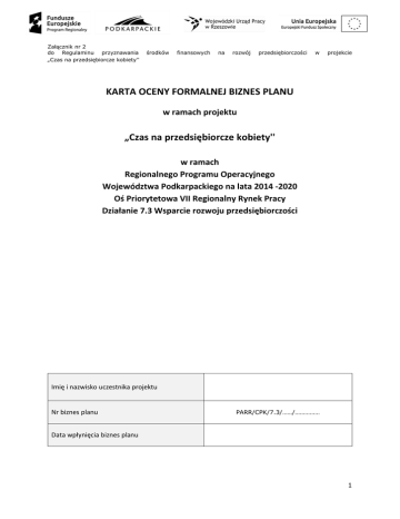 Załącznik nr 2 do Regulaminu przyznawania „Czas na przedsiębiorcze kobiety'' środków finansowych na rozwój przedsiębiorczości w projekcie KARTA OCENY FORMALNEJ BIZNES PLANU w ramach projektu „Czas na przedsiębiorcze kobiety'' w ramach Regionalnego Programu Operacyjnego Województwa Podkarpackiego na lata 2014 -2020 Oś Priorytetowa VII Regionalny Rynek Pracy Działanie 7.3 Wsparcie rozwoju przedsiębiorczości Imię i nazwisko uczestnika projektu Nr biznes planu PARR/CPK/7.3/……/…………… Data wpłynięcia biznes planu 1 OŚWIADCZENIE O BRAKU POWIĄZAŃ Z OCENIANYM UCZESTNIKIEM PROJEKTU ORAZ O BEZSTRONNOŚCI Oświadczam, że: Nie pozostaję w związku małżeńskim, w stosunku pokrewieństwa lub powinowactwa (w linii prostej lub bocznej do II stopnia) z ocenianym uczestnikiem projektu oraz nie jestem związany/a z tytułu przysposobienia, opieki lub kurateli z ocenianym uczestnikiem projektu. …………………………………………. Miejscowość, data ……..………….…………………………………………… Podpis Oceniającego 2 Lp. Kryterium Tak Nie ND Kryteria nie podlegające poprawie 1. Biznes plan został złożony w wyznaczonym terminie 2. Biznes plan jest wypełniony na obowiązującym wzorze 3. Biznes plan jest wypełniony elektronicznie 4. 5. Kwota wnioskowanego wsparcia finansowego /dotacji inwestycyjnej/ nie przekracza 23 000 zł Kwota wnioskowanego finansowego wsparcia pomostowego nie przekracza 19 200 zł Kryteria podlegające poprawie 6. Wszystkie pola biznes planu są wypełnione 7. Wszystkie pola biznes planu są wypełnione prawidłowo 8. Tabele finansowe biznes planu nie zawierają błędów rachunkowych 9. Biznes plan jest parafowany na każdej stronie 10. Wszystkie oświadczenia na końcu biznes planu zostały podpisane 11. 12. 13. 14. 15. 16. 17. Dołączony został podpisany oryginał Oświadczenia o nieotrzymaniu pomocy de minimis Dołączony został podpisany oryginał Oświadczenia o wysokości otrzymanej pomocy de minimis Dołączone zostały potwierdzone za zgodność z oryginałem kopie zaświadczeń o wysokości otrzymanej pomocy de minimis Dołączony został podpisany oryginał Formularz informacji przedstawianych przy ubieganiu się o pomoc de minimis Dołączona została potwierdzona za zgodność z oryginałem kopia dokumentu upoważniającego uczestnika projektu do rejestracji działalności gospodarczej pod adresem wskazanym w biznes planie jako główne miejsce wykonywania działalności gospodarczej Dołączone zostały uzasadnienia cen maszyn, urządzeń, oprogramowania, towarów, prac remontowych planowanych do sfinansowania ze środków dotacji inwestycyjnej Dołączona została wersja elektroniczna biznes planu na nośniku CD/DVD (plik w formacie doc lub docx) WYNIK OCENY FORMALNEJ: pozytywna …………………………………………. Miejscowość, data skierowany do poprawy negatywna ……..………….…………………………………………… Podpis Oceniającego 3 WYKAZ WYMAGANYCH UZUPEŁNIEŃ DO BIZNES PLANU NA ETAPIE OCENY FORMALNEJ INFORMACJA O ZŁOŻENIU UZUPEŁNIEŃ biznes plan uzupełniony poprawnie biznes plan uzupełniony niepoprawnie Informacja na temat braków formalnych, które nie zostały poprawione poprawnie …………………………………………. Miejscowość, data ……..………….…………………………………………… Podpis Oceniającego 4