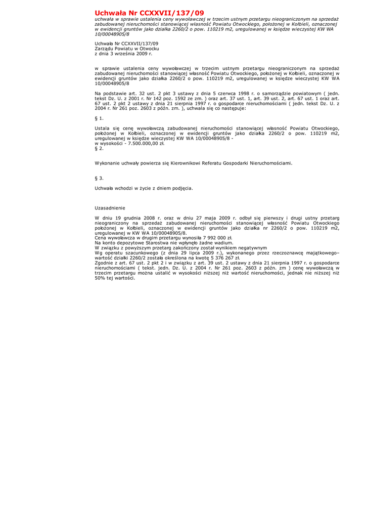 Uchwała Nr CCXXVII/137/09 uchwała w sprawie ustalenia ceny wywoławczej w trzecim ustnym przetargu nieograniczonym na sprzedaż zabudowanej nieruchomości stanowiącej własność Powiatu Otwockiego, położonej w Kołbieli, oznaczonej w ewidencji gruntów jako działka 2260/2 o pow. 110219 m2, uregulowanej w księdze wieczystej KW WA 10/00048905/8 Uchwała Nr CCXXVII/137/09 Zarządu Powiatu w Otwocku z dnia 3 września 2009 r. w sprawie ustalenia ceny wywoławczej w trzecim ustnym przetargu nieograniczonym na sprzedaż zabudowanej nieruchomości stanowiącej własność Powiatu Otwockiego, położonej w Kołbieli, oznaczonej w ewidencji gruntów jako działka 2260/2 o pow. 110219 m2, uregulowanej w księdze wieczystej KW WA 10/00048905/8 Na podstawie art. 32 ust. 2 pkt 3 ustawy z dnia 5 czerwca 1998 r. o samorządzie powiatowym ( jedn. tekst Dz. U. z 2001 r. Nr 142 poz. 1592 ze zm. ) oraz art. 37 ust. 1, art. 39 ust. 2, art. 67 ust. 1 oraz art. 67 ust. 2 pkt 2 ustawy z dnia 21 sierpnia 1997 r. o gospodarce nieruchomościami ( jedn. tekst Dz. U. z 2004 r. Nr 261 poz. 2603 z późn. zm. ), uchwala się co następuje: § 1. Ustala się cenę wywoławczą zabudowanej nieruchomości stanowiącej własność Powiatu Otwockiego, położonej w Kołbieli, oznaczonej w ewidencji gruntów jako działka 2260/2 o pow. 110219 m2, uregulowanej w księdze wieczystej KW WA 10/00048905/8 w wysokości - 7.500.000,00 zł. § 2. Wykonanie uchwały powierza się Kierownikowi Referatu Gospodarki Nieruchomościami. § 3. Uchwała wchodzi w życie z dniem podjęcia. Uzasadnienie W dniu 19 grudnia 2008 r. oraz w dniu 27 maja 2009 r. odbył się pierwszy i drugi ustny przetarg nieograniczony na sprzedaż zabudowanej nieruchomości stanowiącej własność Powiatu Otwockiego położonej w Kołbieli, oznaczonej w ewidencji gruntów jako działka nr 2260/2 o pow. 110219 m2, uregulowanej w KW WA 10/00048905/8. Cena wywoławcza w drugim przetargu wynosiła 7 992 000 zł. Na konto depozytowe Starostwa nie wpłynęło żadne wadium. W związku z powyższym przetarg zakończony został wynikiem negatywnym Wg operatu szacunkowego (z dnia 29 lipca 2009 r.), wykonanego przez rzeczoznawcę majątkowego– wartość działki 2260/2 została określona na kwotę 5 376 267 zł. Zgodnie z art. 67 ust. 2 pkt 2 i w związku z art. 39 ust. 2 ustawy z dnia 21 sierpnia 1997 r. o gospodarce nieruchomościami ( tekst. jedn. Dz. U. z 2004 r. Nr 261 poz. 2603 z późn. zm ) cenę wywoławczą w trzecim przetargu można ustalić w wysokości niższej niż wartość nieruchomości, jednak nie niższej niż 50% tej wartości.