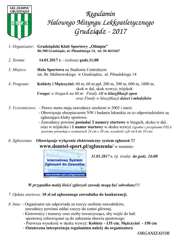 Regulamin Halowego Mityngu Lekkoatletycznego Grudziądz - 2017 1. Organizator: Grudziądzki Klub Sportowy „Olimpia” 86-300 Grudziądz, ul. Piłsudskiego 14, tel. 56 4611667 2. Termin: 14.01.2017 r. - (sobota) godz.11;00 3. Miejsce: Hala Sportowa na Stadionie Centralnym im. Br. Malinowskiego w Grudziądzu, ul. Piłsudskiego 14 4. Program: Kobiety i Mężczyźni: 60 m, 60 m ppł, 200 m, 300 m, 600 m, 1000 m, skok w dal, skok wzwyż, trójskok Uwaga: w biegach na 60 m: Finały AB w klasyfikacji open oraz Finały w klasyfikacji dzieci i młodzików 5. Uczestnictwo: - Prawo startu mają zawodnicy urodzeni w 2005 i starsi. - Obowiązuje ubezpieczenie NW i badania lekarskie za co odpowiedzialnie są zgłaszające kluby sportowe. - Zawodnicy powinni posiadać 2 numery startowe w biegach, skoku w dal, oraz w trójskoku i 1 numer startowy w skoku wzwyż (zgodne z przepisami PZLA poziomy prostokąt o wymiarach 24 cm x 20 cm, wysokość cyfr od 6 do 10 cm) 6. Zgłoszenia: Obowiązuje wyłącznie elektroniczny system zgłoszeń !!! www.domtel-sport.pl/zgloszenia/ w terminie: 11.01.2017 r. (tj. środa) do godz. 24;00 W przypadku małej ilości zgłoszeń zawody mogą być odwołane!!! 7. Opłata startowa: 10 zł od zgłoszonego zawodnika do konkurencji. 8. Inne: - Organizator nie odpowiada za rzeczy osobiste zawodników, zawodnicy powinni oddać rzeczy do szatni głównej. - Kierownicy i trenerzy oraz osoby towarzyszące, aby wejść do hali sportowej zobowiązani są do założenia obuwia sportowego - Pierwsza wysokość w skoku wzwyż: Kobiety - 135 cm; Mężczyźni - 150 cm - Ostateczna interpretacja regulaminu należy do organizatora ORGANIZATOR