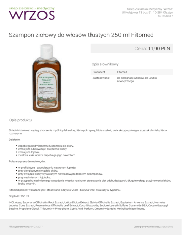 Sklep Zielarsko-Medyczny "Wrzos" Ul.Kolejowa 13 box 51, 10-284 Olsztyn 501490417 Szampon ziołowy do włosów tłustych 250 ml Fitomed Cena: 11,90 PLN Opis słownikowy Producent Fitomed Zastosowanie do pielęgnacji włosów, do użytku zewnętrznego Opis produktu Składniki ziołowe: wyciąg z korzenia mydlnicy lekarskiej, liścia pokrzywy, liścia szałwii, ziela skrzypu polnego, szyszek chmielu, liścia rozmarynu. Działanie: zapobiega nadmiernemu łuszczeniu się skóry, zmniejsza lub likwiduje swędzenie skóry, zmniejsza łojotok, zwalcza lekki łupież i zapobiega jego nawrotom. Polecany przez dermatologów: w profilaktyce i zapobieganiu nawrotom łupieżu, przy alergicznym świądzie skóry, przy świądzie skóry wywołanym niewłaściwym doborem szamponów, przy nadmiernym łojotoku, w przypadku nadmiernego wypadania włosów na skutek stosowania diet odchudzających, długotrwałego przyjmowania leków, braku witamin. Fitomed poleca: wskazane jest stosowanie odżywki "Zioła i biotyna" raz, dwa razy w tygodniu. Objętość: 250 ml. INCI: Aqua, Saponaria Officinalis Root Extract, Urtica Dioica Extract, Salvia Officinalis Extract, Equisetum Arvense Extract, Humulus Lupulus Cone Extract, Rosmarinus Officinalis Leaf Extract, Coco Glucoside, Sodium Laureth Sulfate, Cocamide DEA, Cocamidopropyl Betaine, Propylene Glycol, Trilaureth-4-Phos-phate, Cytric Acid, Parfum, Dmdm Hydantoin, Methylisothiazo-linone, Plik wygenerowano: 04-03-2017 Oprogramowanie sklepu: AptusShop Sklep Zielarsko-Medyczny "Wrzos" Ul.Kolejowa 13 box 51, 10-284 Olsztyn 501490417 Methylchloroisothiazolinone Plik wygenerowano: 04-03-2017 Powered by TCPDF (www.tcpdf.org) Oprogramowanie sklepu: AptusShop