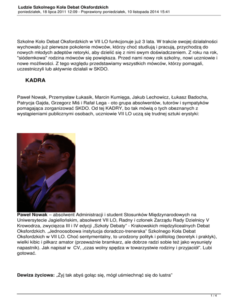 Ludzie Szkolnego Koła Debat Oksfordzkich poniedziałek, 18 lipca 2011 12:09 - Poprawiony poniedziałek, 10 listopada 2014 15:41 Szkolne Koło Debat Oksfordzkich w VII LO funkcjonuje już 3 lata. W trakcie swojej działalności wychowało już pierwsze pokolenie mówców, którzy choć studiują i pracują, przychodzą do nowych młodych adeptów retoryki, aby dzielić się z nimi swym doświadczeniem. Z roku na rok, "siódemkowa" rodzina mówców się powiększa. Przed nami nowy rok szkolny, nowi uczniowie i nowe możliwości. Z tego względu przedstawiamy wszystkich mówców, którzy pomagali, uczestniczyli lub aktywnie działali w SKDO. KADRA Paweł Nowak, Przemysław Łukasik, Marcin Kumięga, Jakub Lechowicz, Łukasz Badocha, Patrycja Gajda, Grzegorz Miś i Rafał Lega - oto grupa absolwentów, tutorów i sympatyków pomagająca zorganizować SKDO. Od tej KADRY, bo tak mówią o tych obeznanych z wystąpieniami publicznymi osobach, uczniowie VII LO uczą się trudnej sztuki erystyki: Paweł Nowak – absolwent Administracji i student Stosunków Międzynarodowych na Uniwersytecie Jagiellońskim, absolwent VII LO, Radny i członek Zarządu Rady Dzielnicy V Krowodrza, zwycięzca III i IV edycji „Szkoły Debaty” - Krakowskich międzylicealnych Debat Oksfordzkich. „Jednoosobowa instytucja doradczo-trenerska” Szkolnego Koła Debat Oksfordzkich w VII LO. Choć sentymentalny, to urodzony polityk i politolog (teoretyk i praktyk), wielki kibic i piłkarz amator (przeważnie bramkarz, ale dobrze radzi sobie też jako wysunięty napastnik). Jak napisał w CV, „czas wolny spędza w towarzystwie rodziny i przyjaciół”. Lubi gotować. Dewiza życiowa: „Żyj tak abyś goląc się, mógł uśmiechnąć się do lustra” 1/4 Ludzie Szkolnego Koła Debat Oksfordzkich poniedziałek, 18 lipca 2011 12:09 - Poprawiony poniedziałek, 10 listopada 2014 15:41 Ulubiony cytat: Nie polityka powinna rządzić ludźmi, lecz ludzie polityką – Napoleon Bonaparte. Mówca: Sir Winston Leonard-Spencer Churchill. Przemysław Łukasik – absolwent Historii i Stosunków Międzynarodowych Uniwersytetu Jagiellońskiego, doktorant w Instytucie Amerykanistyki, Radny, Przewodniczący Komisji Edukacji i Kultury Fizycznej Rady Dzielnicy V Krowodrza. Nauczyciel historii w VII LO i opiekun Szkolnego Koła Debat Oksfordzkich odpowiadający za organizacje i logistykę wszystkich debat Koła. W chwilach wolnych (towar bardzo deficytowy) oddający się pasjom sportowym: piłka nożna (znakomity zawodnik na każdej pozycji, szczególnie rozgrywający) i squash. Ulubiony cytat: słowa Sławomira Mrożka: „Wole być nie zrozumiany, niż zrozumiany głupio”. Dewiza życiowa: "There is no substitution for victory" - Douglas McArthur Marcin „Qmiś” Kumięga – absolwent Historii i student Archeologii, psychologii i filozofii Uniwersytetu Jagiellońskiego, absolwent VII LO, zwycięzca III i IV edycji „Szkoły Debaty”, Krakowskich międzylicealnych Debat Oksfordzkich. Średniowieczny „wuj”, szermierz, poliglota, filozof… można by tak wymieniać długo. Największy pozytywny imprezowicz Krowodrzy, 2/4 Ludzie Szkolnego Koła Debat Oksfordzkich poniedziałek, 18 lipca 2011 12:09 - Poprawiony poniedziałek, 10 listopada 2014 15:41 pomocnik i ekspert SKDO. W chwilach wolnych, które uzależnia od swojego samopoczucia, podróżuje, zwiedza świat szukając odpowiedzi na nurtujące ludzkość pytania. Ulubiony Cytat: „nunc est bibendum” Rafał Lega – student Prawa Uniwersytetu Jagiellońskiego, absolwent VII LO, wybitny mieszkaniec Zabierzowa – mocno związany z Krowodrzą i Debatami. Znakomity retor i obiecujący mówca. Ochotniczo zgłosił się na Sekretarza Szkolnego Koła Debat Oksfordzkich, którego funkcje będzie pełnił w roku szkolnym 2011/2012. Żeglarz, szermierz i filozof. Jak sam twierdzi, nigdy się nie kłóci – jedynie wyjaśnia że ma rację. Ulubiony mówca: Paweł Nowak – ale tylko jak się wcześniej nie przygotuje i jest w formie. Ulubiony Cytat: „Quidquid latine dictum sit, altum videtur” – cokolwiek powiesz po łacinie, brzmi mądrze. Patrycja Gajda – studentka Socjologii na Akademii Górniczo Hutniczej, absolwentka VII LO, wyrafinowana mówczyni, potrafiąca błyskawicznie zareagować na najmniej spodziewane wydarzenia. Ekspert i tutor Szkolnego Koła Debat Oksfordzkich. Ambitna i szalona jest „dobrym duchem drużyny”. Jak twierdzi, inspiruje ją dr House, znakomita i wszechstronna koszykarka, jest ikoną kultury, trendów i mody dla członków SKDO. Ulubiony cytat: nie ma genialności bez domieszki szaleństwa - Cyceron Ulubiony mówca: Grzegorz Miś, zawsze Miś. 3/4 Ludzie Szkolnego Koła Debat Oksfordzkich poniedziałek, 18 lipca 2011 12:09 - Poprawiony poniedziałek, 10 listopada 2014 15:41 Grzegorz Miś Ekonomicznym, międzylicealnych porwać postrachem kobiecych –odpowiednim absolwent student Debat serc. Oksfordzkich. Międzynarodowych VII żartem. LO, zwycięzca wJest Błyskotliwy, modnych niepoprawnym Stosunków VII iedycji eleganckich opanowany romantykiem, kapeluszach. mówca, Debaty” który dżentelmenem -na Krakowskich Uniwersytecie zawsze cytat: same." -publikę Jonathan You Davis laugh atGustuje me because I'm different, IGospodarczych laugh at you because you'repotrafi alli i the Ulubiony mówca: sprawach natury etycznej”. Rafał Lega, szczególnie gdy mówi o:„Szkoły „Władzy, alkoholu, pieniądzach Jakub Lechowicz Jagiellońskim, Koła wyrafinowanym wyśmienicie niejednokrotnie buty iDebat ma bardzo Oksfordzkich. buduje pochodzi wygrywa i Ma szczegółowym tolerancyjne –pozycje zpojedynki Znakomity Tych. sceniczną podejście Administracji Od języku retorskie 3chiuso znawca lat samym wypowiedzi. do jest życia. honorowym oraz prawa, wyglądem. student Zawsze jest rozpoczęciem. niezwykle członkiem Odważny Prawa elegancki na powściągliwym ii ekspertem Uniwersytecie pewny Uwielbia i nienagannie siebie dobrze Szkolnego mówcą, 