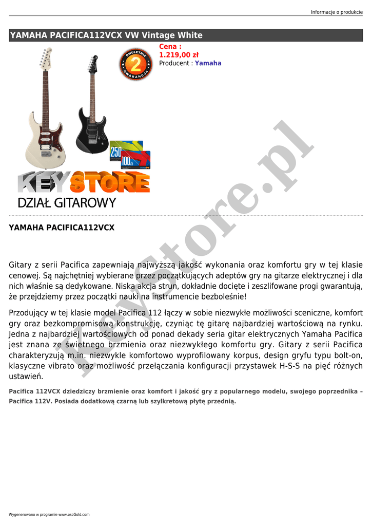 Informacje o produkcie YAMAHA PACIFICA112VCX VW Vintage White Cena : 1.219,00 zł YAMAHA PACIFICA112VCX or e. pl Producent : Yamaha ey St Gitary z serii Pacifica zapewniają najwyższą jakość wykonania oraz komfortu gry w tej klasie cenowej. Są najchętniej wybierane przez początkujących adeptów gry na gitarze elektrycznej i dla nich właśnie są dedykowane. Niska akcja strun, dokładnie docięte i zeszlifowane progi gwarantują, że przejdziemy przez początki nauki na instrumencie bezboleśnie! K Przodujący w tej klasie model Pacifica 112 łączy w sobie niezwykłe możliwości sceniczne, komfort gry oraz bezkompromisową konstrukcję, czyniąc tę gitarę najbardziej wartościową na rynku. Jedna z najbardziej wartościowych od ponad dekady seria gitar elektrycznych Yamaha Pacifica jest znana ze świetnego brzmienia oraz niezwykłego komfortu gry. Gitary z serii Pacifica charakteryzują m.in. niezwykle komfortowo wyprofilowany korpus, design gryfu typu bolt-on, klasyczne vibrato oraz możliwość przełączania konfiguracji przystawek H-S-S na pięć różnych ustawień. Pacifica 112VCX dziedziczy brzmienie oraz komfort i jakość gry z popularnego modelu, swojego poprzednika – Pacifica 112V. Posiada dodatkową czarną lub szylkretową płytę przednią. Wygenerowano w programie www.oscGold.com or e. pl St ey K Informacje o produkcie Przystawki Alnico V Magnesy Alnico V stosowane są zarówno w przystawkach jednocewkowych (single-col), jak i w przetwornikach humbucker, dostarczając czyste, jasne brzmienie, ze świetną projekcją, które na pewno nie zaniknie w muzyce całego zespołu. or e. pl Funkcja Coil Tap Funkcja Coil Cap na tylnej przystawce humbucker zapewnia szeroki zakres możliwości brzmieniowych, od ciężkiego distortion, aż po przejrzyste brzmienie pojedynczej przystawki jednocewkowej (single-coil). Przełącznik w pokrętle umożliwia szybkie przełączanie pomiędzy brzmieniami przystawek. Ustawienie potencjometru Pickup Selector (zmiana przystawki) na czwartą pozycję automatycznie włącza funkcję Coil Tap, która dostarcza czyste półtony z pary pojedynczych przystawek. Tremolo typu Block Saddle Vintage St Tremolo typu Block Saddle Vintage oferuje doskonałe działanie. Siodełko typu Heavy Block zapewnia długi sustain oraz głębokie brzmienie. ey Przystawka przy mostku K Tak jak w najlepszych modelach z serii PACIFICA, przystawka przy mostku jest zamontowana bezpośrednio do korpusu. Taka konfiguracja przechwytuje rezonans korpusu, zapewniając większą dynamikę brzmienia. Potencjometry 1: 5P Pickup Selector (zmiana przystawki) 2: Master Volume (przełącznik wciśnij/pociągnij) 3: Master Tone Specyfikacja: Wygenerowano w programie www.oscGold.com Korpus: Olcha · Gryf: Klon · Podstrunnica: Palisander · Mostek: Vintage Tremolo with Block Saddle · Przetworniki: Alnico V Single x 2, Alnico V Humbucker x 1 · Menzura: 647.7mm · Progi: 22 · Klucze: Die cast K ey St or e. pl ·