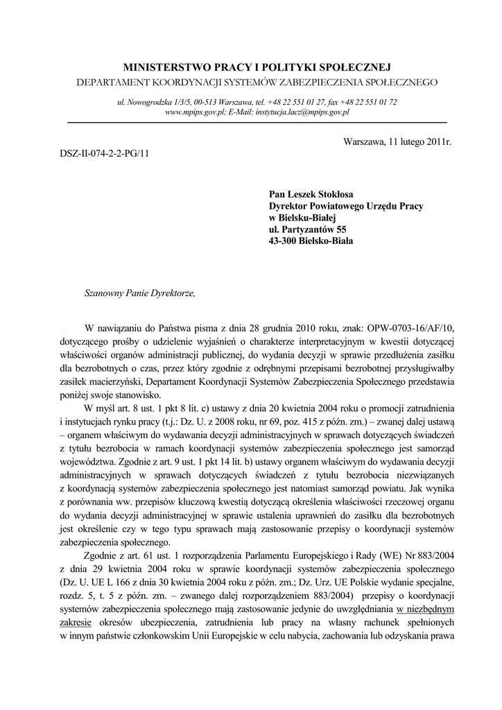 MINISTERSTWO PRACY I POLITYKI SPOŁECZNEJ DEPARTAMENT KOORDYNACJI SYSTEMÓW ZABEZPIECZENIA SPOŁECZNEGO ul. Nowogrodzka 1/3/5, 00-513 Warszawa, tel. +48 22 551 01 27, fax +48 22 551 01 72 www.mpips.gov.pl; E-Mail: [email protected] Warszawa, 11 lutego 2011r. DSZ-II-074-2-2-PG/11 Pan Leszek Stokłosa Dyrektor Powiatowego Urzędu Pracy w Bielsku-Białej ul. Partyzantów 55 43-300 Bielsko-Biała Szanowny Panie Dyrektorze, W nawiązaniu do Państwa pisma z dnia 28 grudnia 2010 roku, znak: OPW-0703-16/AF/10, dotyczącego prośby o udzielenie wyjaśnień o charakterze interpretacyjnym w kwestii dotyczącej właściwości organów administracji publicznej, do wydania decyzji w sprawie przedłużenia zasiłku dla bezrobotnych o czas, przez który zgodnie z odrębnymi przepisami bezrobotnej przysługiwałby zasiłek macierzyński, Departament Koordynacji Systemów Zabezpieczenia Społecznego przedstawia poniżej swoje stanowisko. W myśl art. 8 ust. 1 pkt 8 lit. c) ustawy z dnia 20 kwietnia 2004 roku o promocji zatrudnienia i instytucjach rynku pracy (t.j.: Dz. U. z 2008 roku, nr 69, poz. 415 z późn. zm.) – zwanej dalej ustawą – organem właściwym do wydawania decyzji administracyjnych w sprawach dotyczących świadczeń z tytułu bezrobocia w ramach koordynacji systemów zabezpieczenia społecznego jest samorząd województwa. Zgodnie z art. 9 ust. 1 pkt 14 lit. b) ustawy organem właściwym do wydawania decyzji administracyjnych w sprawach dotyczących świadczeń z tytułu bezrobocia niezwiązanych z koordynacją systemów zabezpieczenia społecznego jest natomiast samorząd powiatu. Jak wynika z porównania ww. przepisów kluczową kwestią dotyczącą określenia właściwości rzeczowej organu do wydania decyzji administracyjnej w sprawie ustalenia uprawnień do zasiłku dla bezrobotnych jest określenie czy w tego typu sprawach mają zastosowanie przepisy o koordynacji systemów zabezpieczenia społecznego. Zgodnie z art. 61 ust. 1 rozporządzenia Parlamentu Europejskiego i Rady (WE) Nr 883/2004 z dnia 29 kwietnia 2004 roku w sprawie koordynacji systemów zabezpieczenia społecznego (Dz. U. UE L 166 z dnia 30 kwietnia 2004 roku z późn. zm.; Dz. Urz. UE Polskie wydanie specjalne, rozdz. 5, t. 5 z późn. zm. – zwanego dalej rozporządzeniem 883/2004) przepisy o koordynacji systemów zabezpieczenia społecznego mają zastosowanie jedynie do uwzględniania w niezbędnym zakresie okresów ubezpieczenia, zatrudnienia lub pracy na własny rachunek spełnionych w innym państwie członkowskim Unii Europejskie w celu nabycia, zachowania lub odzyskania prawa do świadczeń z tytułu bezrobocia na terytorium państwa przyznającego prawo do zasiłku dla bezrobotnych. Decyzje administracyjne wydawane na podstawie art. 73 ust. 3 ustawy – dotyczące przedłużenia okresu pobierania zasiłku dla bezrobotnych w związku z urodzeniem dziecka – nie są związane z sumowaniem okresów ubezpieczenia, zatrudnienia lub pracy na własny rachunek spełnionych w innym państwie, co oznacza, że do tego typu spraw nie mają zastosowania przepisy o koordynacji systemów zabezpieczenia społecznego. Oznacza to, w opinii Departamentu Koordynacji Systemów Zabezpieczenia Społecznego, że organem właściwym do wydania, na podstawie wyłącznie ustawodawstwa polskiego, decyzji na podstawie art. 73 ust. 3 ustawy wydaje się być samorząd powiatu, nawet jeśli zasiłek ten został przyznany na mocy decyzji samorządu województwa. Z poważaniem Elżbieta Rożek (-) 2