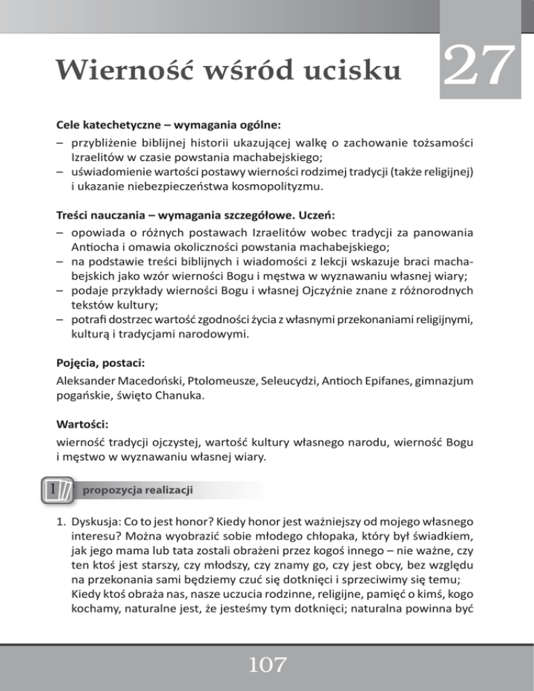 Wierność wśród ucisku 27 Cele katechetyczne – wymagania ogólne: – przybliżenie biblijnej historii ukazującej walkę o zachowanie tożsamości Izraelitów w czasie powstania machabejskiego; – uświadomienie wartości postawy wierności rodzimej tradycji (także religijnej) i ukazanie niebezpieczeństwa kosmopolityzmu. Treści nauczania – wymagania szczegółowe. Uczeń: – opowiada o różnych postawach Izraelitów wobec tradycji za panowania Antiocha i omawia okoliczności powstania machabejskiego; – na podstawie treści biblijnych i wiadomości z lekcji wskazuje braci machabejskich jako wzór wierności Bogu i męstwa w wyznawaniu własnej wiary; – podaje przykłady wierności Bogu i własnej Ojczyźnie znane z różnorodnych tekstów kultury; – potrafi dostrzec wartość zgodności życia z własnymi przekonaniami religijnymi, kulturą i tradycjami narodowymi. Pojęcia, postaci: Aleksander Macedoński, Ptolomeusze, Seleucydzi, Antioch Epifanes, gimnazjum pogańskie, święto Chanuka. Wartości: wierność tradycji ojczystej, wartość kultury własnego narodu, wierność Bogu i męstwo w wyznawaniu własnej wiary. realizacji: propozycja realizacji 1Propozycja 1. Dyskusja: Co to jest honor? Kiedy honor jest ważniejszy od mojego własnego interesu? Można wyobrazić sobie młodego chłopaka, który był świadkiem, jak jego mama lub tata zostali obrażeni przez kogoś innego – nie ważne, czy ten ktoś jest starszy, czy młodszy, czy znamy go, czy jest obcy, bez względu na przekonania sami będziemy czuć się dotknięci i sprzeciwimy się temu; Kiedy ktoś obraża nas, nasze uczucia rodzinne, religijne, pamięć o kimś, kogo kochamy, naturalne jest, że jesteśmy tym dotknięci; naturalna powinna być 107 2. 3. 4. 5. obrona tych wartości, oczywiście w rozsądny sposób; po tym poznaje się dorosłość, odwagę i charakter; Chcecie być dorośli? – Tak! – Dorosły człowiek umie bronić wartości ważniejszych, wyższych, umie je odróżnić. Uczniowie czytają list z podręcznika, następnie wspólnie dyskutują nad kwestią poruszoną w liście. Opowiadanie: Przyjmowanie zwyczajów innych przypomina historię pewnego Nigeryjczyka. Kiedy do Nigerii przypływały okręty ze starymi, poprzecieranymi garniturami zza Oceanu, modne było, aby porzucać piękne regionalne stroje i przebierać się w ciuchy, których w Europie nikt już nie nosił. Nigeryjczyk czuł się jak Europejczyk! – więcej, jak Amerykanin. Okazało się, że za sprawą pomocy stypendialnej pozwolono mu wyjechać do USA na studia, bardzo się ucieszył, spełniły się jego marzenia. Teraz na pewno będzie Amerykaninem, a nie zwykłym Nigeryjczykiem. Założył garnitur, wsiadł do samolotu, wylądował w Ameryce, wyszedł z lotniska i… okazało się, że wywołał salwy śmiechu. Wszyscy się śmiali z jego starego, niemodnego i komicznego stroju. Kiedy po jakimś czasie pokazał się w stroju nigeryjskim, właściwym w jego stronach, zrobił furorę, wszyscy go wypytywali o ten strój i podziwiali jego wygląd. Praca w zespołach (4-osobowych): każda z grup przygotowuje krótką notatkę o Księgach Machabejskich i Machabeuszach na podstawie tekstu z podręcznika i tekstu Pisma Świętego. Wybrane osoby prezentują wyniki swojej pracy na ocenę. Nauczyciel podsumowuje pracę w grupach. propozycja na lekcji propozycja pracypracy na lekcji: 3 inna 12Inna Można w klasie rozpocząć dyskusję na temat zamieszczonego w podręczniku listu. W trakcie dyskusji można stronom podrzucić krótkie teksty (za: 1 Mch 1, 11b; przeciw: 2 Mch 7, 30b). Spór powinien wciąż odnosić się do historii powstania machabejskiego i rozwikłania problemu, czego bronili Machabeusze, a jednocześnie uczniom należałoby wskazywać na niebezpieczeństwo kosmopolityzmu i zatracenia własnej tożsamości. Na koniec należałoby spytać, czego Machabeusze mogą nauczyć nas, Polaków żyjących na przełomie II i III tysiąclecia. Modlitwa: Credo lub Akt wiary. Jakie znajdziesz analogiczne z dziejami Machabeuszy wydarzenia w dziejach naszej Ojczyzny? Napisz na podstawie tego, co nazwiesz heroizmem, jakie są wartości ważniejsze od własnego życia i kiedy sam byś życie poświęcił dla kogoś innego. 108 Korelacja z innymi przedmiotami: język polski – obrona tożsamości narodowej w literaturze (można odnieść się zarówno do twórczości M. Reja, Ł. Górnickiego, jak i do ciekawego fragmentu o modzie francuszczyzny z Pana Tadeusza A. Mickiewicza); historia – walka o zachowanie tożsamości Izraelitów w czasie powstania machabejskiego, walka Polaków o zachowanie własnej tożsamości narodowej; wychowanie do życia w rodzinie – wartości narodowe w życiu rodzinnym; wiedza o społeczeństwie – tożsamość narodowa w życiu politycznym i społecznym, wychowanie do aktywnego udziału w życiu gospodarczym: udział w życiu gospodarczym traktowany jako praca nad podniesieniem dobrobytu własnej Ojczyzny; muzyka – wartość muzyki niektórych kompozytorów polskich (np. F. Chopina, S. Moniuszki) dla zachowania świadomości narodowej; godziny do dyspozycji wychowawcy – znaczenie świętowania rocznic narodowych w rozwijaniu samoświadomości wychowanków. 109