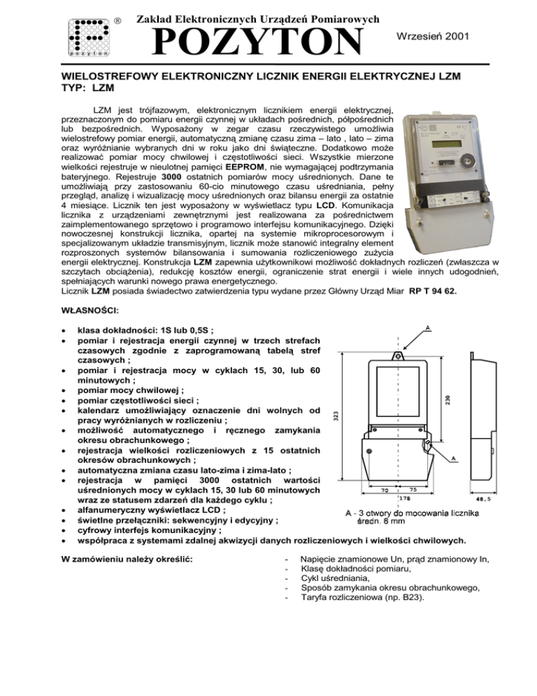 p o z y t o n POZYTON Zakład Elektronicznych Urządzeń Pomiarowych Wrzesień 2001 WIELOSTREFOWY ELEKTRONICZNY LICZNIK ENERGII ELEKTRYCZNEJ LZM TYP: LZM LZM jest trójfazowym, elektronicznym licznikiem energii elektrycznej, przeznaczonym do pomiaru energii czynnej w układach pośrednich, półpośrednich lub bezpośrednich. Wyposażony w zegar czasu rzeczywistego umożliwia wielostrefowy pomiar energii, automatyczną zmianę czasu zima – lato , lato – zima oraz wyróżnianie wybranych dni w roku jako dni świąteczne. Dodatkowo może realizować pomiar mocy chwilowej i częstotliwości sieci. Wszystkie mierzone wielkości rejestruje w nieulotnej pamięci EEPROM, nie wymagającej podtrzymania bateryjnego. Rejestruje 3000 ostatnich pomiarów mocy uśrednionych. Dane te umożliwiają przy zastosowaniu 60-cio minutowego czasu uśredniania, pełny przegląd, analizę i wizualizację mocy uśrednionych oraz bilansu energii za ostatnie 4 miesiące. Licznik ten jest wyposażony w wyświetlacz typu LCD. Komunikacja licznika z urządzeniami zewnętrznymi jest realizowana za pośrednictwem zaimplementowanego sprzętowo i programowo interfejsu komunikacyjnego. Dzięki nowoczesnej konstrukcji licznika, opartej na systemie mikroprocesorowym i specjalizowanym układzie transmisyjnym, licznik może stanowić integralny element rozproszonych systemów bilansowania i sumowania rozliczeniowego zużycia energii elektrycznej. Konstrukcja LZM zapewnia użytkownikowi możliwość dokładnych rozliczeń (zwłaszcza w szczytach obciążenia), redukcję kosztów energii, ograniczenie strat energii i wiele innych udogodnień, spełniających warunki nowego prawa energetycznego. Licznik LZM posiada świadectwo zatwierdzenia typu wydane przez Główny Urząd Miar RP T 94 62. WŁASNOŚCI: x x x x x x x x x x x x x x klasa dokładności: 1S lub 0,5S ; pomiar i rejestracja energii czynnej w trzech strefach czasowych zgodnie z zaprogramowaną tabelą stref czasowych ; pomiar i rejestracja mocy w cyklach 15, 30, lub 60 minutowych ; pomiar mocy chwilowej ; pomiar częstotliwości sieci ; kalendarz umożliwiający oznaczenie dni wolnych od pracy wyróżnianych w rozliczeniu ; możliwość automatycznego i ręcznego zamykania okresu obrachunkowego ; rejestracja wielkości rozliczeniowych z 15 ostatnich okresów obrachunkowych ; automatyczna zmiana czasu lato-zima i zima-lato ; rejestracja w pamięci 3000 ostatnich wartości uśrednionych mocy w cyklach 15, 30 lub 60 minutowych wraz ze statusem zdarzeń dla każdego cyklu ; alfanumeryczny wyświetlacz LCD ; świetlne przełączniki: sekwencyjny i edycyjny ; cyfrowy interfejs komunikacyjny ; współpraca z systemami zdalnej akwizycji danych rozliczeniowych i wielkości chwilowych. W zamówieniu należy określić: - Napięcie znamionowe Un, prąd znamionowy In, Klasę dokładności pomiaru, Cykl uśredniania, Sposób zamykania okresu obrachunkowego, Taryfa rozliczeniowa (np. B23). DANE TECHNICZNE. Licznik pośredni Klasa pomiaru Napięcie odniesienia Prąd znamionowy Prąd rozruchu Zakres częstotliwości pracy Pobór mocy przez obwód napięciowy Pobór mocy przez obwód prądowy Stała impulsowa diody LED Stała impulsowa wyjścia energii Wyjście impulsów energii 3 x 58 / 100 V 0.5 S lub 1S Licznik półpośredni Licznik bezpośredni 1S 3 x 220 / 380 V 10(60)A 40mA 1A lub 5//1A lub 5A 2mA 15 Hz ... 75 Hz <2VA na fazę z zasilaniem licznika <1,5 VA na fazę 12000imp./kWh 3000imp./kWh 12000imp./kWh 3000imp./kWh transoptorowe typu otwarty kolektor Umax=40V, Imax =20mA Unom=24V, Inom=10mA, 300imp/kWh 300imp/kWh impuls negatywny o czasie trwania 50ms transoptorowe typu otwarty kolektor Umax=40V, Imax =20mA Unom=24V, Inom=10mA, Wyjście taktujące cykle pomiarowe impuls pozytywny o czasie trwania 50ms 3 wyjścia transoptorowe typu otwarty kolektor, sterowane wewnętrznym zegarem licznika LZM zgodnie z zaprogramowaną tabelą stref czasowych Umax=40V, Imax =20mA Unom=24V, Inom=10mA Wyjścia informacyjne obowiązywania danej strefy czasowej Wyjście przełączania stref czasowych przekaźnikowe przełączne, bezpotencjałowe programowy wybór wyróżnionych stref czasowych Umax=260V AC lub 24V DC , Imax =100mA AC/DC Smax=30VA Wejście synchronizacji czasu Konfiguracja wejść / wyjść w zależności od zamówienia. transoptorowe typu otwarty kolektor z zasilaniem wewnętrznym Imax =20mA, impuls pozytywny o czasie trwania 50ms Czas uśredniania mocy Złącze komunikacyjne Wyświetlacz Masa Obudowa Warunki pracy: 15, 30 lub 60 minut interfejs optyczny LCD, 2 wiersze po 16 znaków ca. 1,5 kg polikarbonowa: PC, wg normy DIN 43 857, klasa izolacyjności: 2, temperatura :-10 do +45 qC, wysokość npm.:maks. 2000m, wilgotność: <80% / 25 qC SCHEMAT POŁĄCZEŃ: 62 /=0 23,6:<352:$'=( 6.$3 3 3 3 6 6 6 3 6 3 6 6 3 D ED E D E $ %$ % $ % / / :<-&,$75$16237252:( 7<3827:$57<.2/(.725 ]DFLVNZVSyOQ\ ]ZDUWHZVWUHILHF]DVRZHM ]ZDUWHZVWUHILHF]DVRZHM ]ZDUWHZVWUHILHF]DVRZHM Z\MFLHLPSXOVyZHQHUJLL Z\MFLHWDNWXMFHF\NOH SRPLDURZH Z\MFLHSU]HND(QLNRZH SU]HáF]DQLDVWUHIF]DVRZ\FK SU]HáF]QH]HVW\NLZ\MFLRZH EH]SRWHQFMDORZH ZHMFLHV\QFKURQL]DFML F]DVX 8:$*$ ]DFLVNPDSRWHQFMDá]DFLVNX / 1 Zakład Elektronicznych Urządzeń Pomiarowych POZYTON Sp. z o.o. 42-200 Częstochowa, ul. Staszica 8 tel.: (034) 366 44 95, 361 38 32, 364 88 82 fax: (034) 361 38 35, 324 13 50 e-mail: [email protected] http://www.pozyton.com.pl