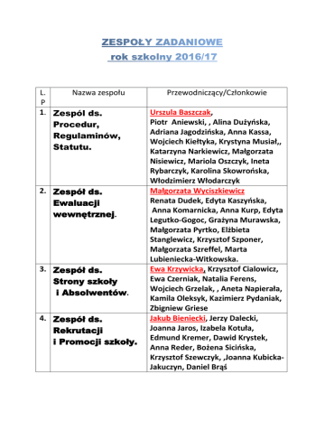 L. Nazwa zespołu P 1. Zespól ds. Procedur, Regulaminów, Statutu. 2. Zespół ds. Ewaluacji wewnętrznej. 3. Zespół ds. Strony szkoły i Absolwentów. 4. Zespół ds. Rekrutacji i Promocji szkoły. Przewodniczący/Członkowie Urszula Baszczak, Piotr Aniewski, , Alina Dużyńska, Adriana Jagodzińska, Anna Kassa, Wojciech Kiełtyka, Krystyna Musiał,, Katarzyna Narkiewicz, Małgorzata Nisiewicz, Mariola Oszczyk, Ineta Rybarczyk, Karolina Skowrońska, Włodzimierz Włodarczyk Małgorzata Wyciszkiewicz Renata Dudek, Edyta Kaszyńska, Anna Komarnicka, Anna Kurp, Edyta Legutko-Gogoc, Grażyna Murawska, Małgorzata Pyrtko, Elżbieta Stanglewicz, Krzysztof Szponer, Małgorzata Szreffel, Marta Lubieniecka-Witkowska. Ewa Krzywicka, Krzysztof Cialowicz, Ewa Czerniak, Natalia Ferens, Wojciech Grzelak, , Aneta Napierała, Kamila Oleksyk, Kazimierz Pydaniak, Zbigniew Griese Jakub Bieniecki, Jerzy Dalecki, Joanna Jaros, Izabela Kotuła, Edmund Kremer, Dawid Krystek, Anna Reder, Bożena Sicińska, Krzysztof Szewczyk, ,Joanna KubickaJakuczyn, Daniel Brąś
