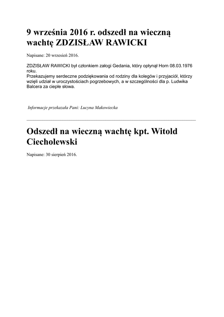 9 września 2016 r. odszedł na wieczną wachtę ZDZISŁAW RAWICKI