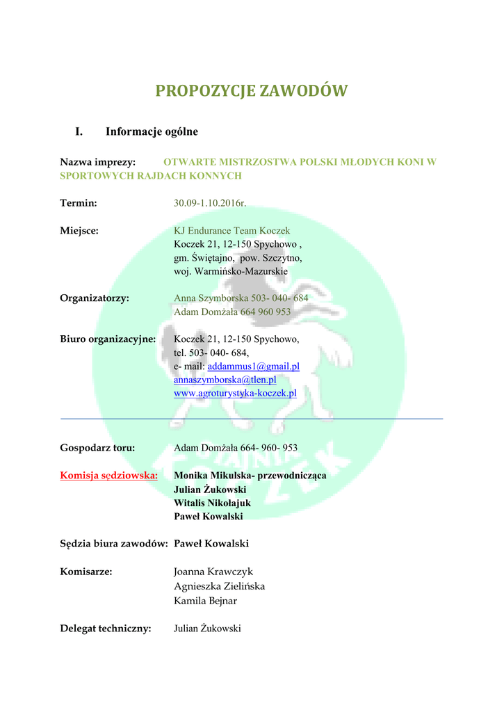 PROPOZYCJE ZAWODÓW I. Informacje ogólne Nazwa imprezy: OTWARTE MISTRZOSTWA POLSKI MŁODYCH KONI W SPORTOWYCH RAJDACH KONNYCH Termin: 30.09-1.10.2016r. Miejsce: KJ Endurance Team Koczek Koczek 21, 12-150 Spychowo , gm. Świętajno, pow. Szczytno, woj. Warmińsko-Mazurskie Organizatorzy: Anna Szymborska 503- 040- 684 Adam Domżała 664 960 953 Biuro organizacyjne: Koczek 21, 12-150 Spychowo, tel. 503- 040- 684, e- mail: [email protected] [email protected] www.agroturystyka-koczek.pl Gospodarz toru: Adam Domżała 664- 960- 953 Komisja sędziowska: Monika Mikulska- przewodnicząca Julian Żukowski Witalis Nikołajuk Paweł Kowalski Sędzia biura zawodów: Paweł Kowalski Komisarze: Joanna Krawczyk Agnieszka Zielińska Kamila Bejnar Delegat techniczny: Julian Żukowski Komisja weterynaryjna: Zbigniew Kołodziejski –przewodniczący Anna Kaczyńska Anna Straszak Komisja odwoławcza: Monika Mikulska Komisja do oceny koni na płycie: Jerzy Urbański – lek. wet. Adam Domżała – inspektor WMZHK Agnieszka Zielińska – inspektor WMZHK Lekarz weterynarii zawodów: Jagoda Pacyńska Opieka medyczna: Mariusz Adamiak Serwis kowalski: Mistrz Józef Antczak Powiatowy lekarz weterynarii: Jerzy Piekarz II. tel.89 624 21 76 Program zawodów Konkurs nr 1 kat. N (konie 6-letnie) – 83,4 km Konkurs nr 2 kat. P (konie 5-letnie) – 52,2 km Konkurs nr 3 kat. L (konie 4-letnie) – 31,2 km 30.09.2016 r. PIĄTEK 17.00 - przegląd weterynaryjny i przegląd na płycie 19.00 - odprawa techniczna 20.00 - ognisko 01.10.2016 r. SOBOTA 7.30 - konkurs nr 1 kat. N – dystans 83,4 km na normę czasu (pętle: : 21+10,2 km i 21+10,2 km i 21 km) Bramki weterynaryjne: 31,2km – odpoczynek:30min 62,4km – odpoczynek:40min 83,4km – meta Zasady rozgrywania konkursu zgodne z regulaminem MPMK. Dopuszcza się udział w konkursie koni starszych, lecz nie będą one klasyfikowane, nie przysługuje im prawo do nagród. Uzyskają one, jak i ich jeźdźcy wpis do książeczek o ukończonym konkursie (tzw. zagrywka). 8.00 - konkurs nr 2 kat. P – dystans 52,2 km na normę czasu (pętle: 21+10,2km i 21 km) Bramki weterynaryjne: 31,2 km – odpoczynek:40min 52,2 km – meta Zasady rozgrywania konkursu zgodne z regulaminem MPMK. Dopuszcza się udział w konkursie koni starszych, (klasyfikacja wg regulaminu SRK) 9.00- konkurs nr 3 kat. L – dystans 31,2 km na normę czasu (pętle: 21 km + 10,2 km) Bramka weterynaryjna na mecie. Zasady rozgrywania konkursu zgodne z regulaminem MPMK. Dopuszcza się udział w konkursie koni starszych, (klasyfikacja wg regulaminu SRK) 17.00 – oficjalne zakończenie zawodów; dekoracja i wręczenie nagród III. Informacje o trasie Dwie pętle odpowiednio o długości 21 km i 10,2 km . Podłoże piaszczyste, miejscami gliniaste, trawiaste z korzeniami, szutrowe, przejazdy kolejowe, fragmenty dróg utwardzone otoczakami. Różnica wzniesień na pętli wynosi 25m. IV. Sprawy organizacyjne Numer konkursu 1–N 2–P 3–L Konkurs klasy L CENNIK Wpisowe 150zł 150zł 150zł Antydoping 15zł 15zł 15zł Konkurs klasy P Open MPMK – 4 letnie Open MPMK – 5 letnie MPMK – 4 letnie MPMK – 5 letnie Open MPMK – konie hod. zagranicznej, konie nie spełniające wymagań rodowodowych PZHK, konie bez kwalifikacji do MPMK spełniające wymogi do startu w danym konkursie wg regulaminu SRK. Opłata wpisowego na miejscu, bezpośrednio po przybyciu. zgłoszenia po terminie 200 zł / koń Cena boksu: 200zł/całe zawody (organizator zapewnia siano) Ostateczny termin zgłoszeń upływa dnia 22.09.2016 r. Zgłoszenia prosimy przesyłać na formularzach PZJ pocztą konwencjonalną lub e-mailem na adres biura organizacyjnego. Zakwaterowanie: na miejscu Pokoje 4-6 osobowe (łóżko z materacem, bez pościeli, piętrowe) z dostępem do wspólnych łazienek; 25 zł / łóżko / noc (płatne za pokój). Pokoje 2-4 osobowe (łóżko z pościelą) z łazienkami; 40zł / łóżko / noc Liczba miejsc ograniczona. Decyduje kolejność zgłoszeń. Zgłoszenia proszę wysyłać pod adres [email protected] lub telefonicznie 503040684 w pobliskich (3-5 km) ośrodkach: Stanica Wodna PTTK „Wodan” Paweł Urbański (0-89) 742-01-14; 502 200 692 Zgon 46, 11-711 Nawiady „Leśny Zakątek” Spychowo- Bystrz 24 p. Jaskólscy (89) 622- 52- 91 604- 913- 705 we własnych namiotach i przyczepach kempingowych (ustawienie płatne 20 zł/doba); bez dostępu do elektryczności Wyżywienie: Na miejscu – catering – śniadanie, obiad, kolacja – posiłki nie będą kolidować z rozgrywanymi konkursami Sklep znajduje się w Spychowie i w Zgonie. V. Warunki techniczne W konkursach 1, 2, 3 mogą startować zawodnicy zarejestrowani w PZJ/WZJ i posiadający aktualną licencję sportową PZJ lub WZJ. Konie muszą posiadać aktualną licencję WZJ lub PZJ oraz Paszport PZJ lub PZHK. Osoby niepełnoletnie muszą posiadać zgody rodziców lub opiekunów prawnych na start w zawodach. Wszystkie konie musza posiadać dokumenty identyfikacyjne z ważnymi szczepieniami p/grypie koni. W czasie rajdu i treningu przed zawodami zawodnika obowiązuje twarde nakrycie głowy (kask z atestem) zgodne z przepisami obuwie oraz estetyczny ubiór. W przypadku braków w dokumentacji jeźdźca lub konia para nie będzie dopuszczona do startu w zawodach. VI. Inne informacje Organizator zastrzega sobie prawo do zmian w programie zawodów, w tym rezygnacji z organizacji konkursu w wypadku zgłoszenia zbyt małej liczby koni. Za wypadki, szkody i ewentualne kradzieże powstałe podczas zawodów lub transportu organizator nie ponosi odpowiedzialności. Organizator zapewnia puchary, flot’s dla koni i skromne nagrody rzeczowe. WSZYSTKICH UCZESTNIKÓW OBOWIĄZUJE PRZESTRZEGANIE ZASAD KODEKSU POSTĘPOWANIA Z KONIEM I. Na wszystkich etapach treningu i przygotowań z konia do startu w zawodach, dobro konia musi stać ponad wszelkimi innymi wymaganiami. Dotyczy to stałej opieki, metod treningu, starannego obrządku, kucia i transportu. II. Konie i jeźdźcy muszą być wy
