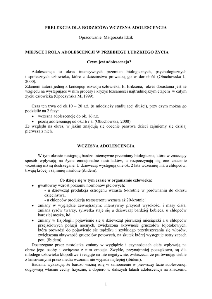 PRELEKCJA DLA RODZICÓW: WCZESNA ADOLESCENCJA Opracowanie: Małgorzata Idzik MIEJSCE I ROLA ADOLESCENCJI W PRZEBIEGU LUDZKIEGO ŻYCIA Czym jest adolescencja? Adolescencja to okres intensywnych przemian biologicznych, psychologicznych i społecznych człowieka, które z dzieciństwa prowadzą go w dorosłość (Obuchowska I., 2000). Zdaniem autora jednej z koncepcji rozwoju człowieka, E. Eriksona, okres dorastania jest ze względu na występujące w nim procesy i kryzys tożsamości najtrudniejszym etapem w całym życiu człowieka (Opoczyńska M.,1999). Czas ten trwa od ok.10 – 20 r.ż. (u młodzieży studiującej dłużej), przy czym można go podzielić na 2 fazy: wczesną adolescencję do ok. 16 r.ż. późną adolescencję od ok.16 r.ż. (Obuchowska, 2000) Ze względu na okres, w jakim znajdują się obecnie państwa dzieci zajmiemy się dzisiaj pierwszą z nich. WCZESNA ADOLESCENCJA W tym okresie następują bardzo intensywne przemiany biologiczne, które w znaczący sposób wpływają na życie emocjonalne nastolatków, a rozpoczynają się one znacznie wcześniej niż są dostrzegane. U dziewcząt występują one ok. 2 lata wcześniej niż u chłopców, trwają krócej i są mniej nasilone (ibidem). Co dzieje się w tym czasie w organizmie człowieka: gwałtowny wzrost poziomu hormonów płciowych: - u dziewcząt produkcja estrogenu wzrasta 6-krotnie w porównaniu do okresu dzieciństwa, - u chłopców produkcja testosteronu wzrasta aż 20-krotnie! zmiany w wyglądzie zewnętrznym: intensywny przyrost wysokości i masy ciała, zmiana rysów twarzy, sylwetka staje się u dziewcząt bardziej kobieca, u chłopców bardziej męska, itd. zmiany w fizjologii: pojawienie się u dziewcząt pierwszej miesiączki a u chłopców przejściowych polucji nocnych, zwiększona aktywność gruczołów łojotokowych, która prowadzi do pojawienie się trądziku i szybkiego przetłuszczania się włosów, zwiększona aktywność gruczołów potowych, na skutek której występuje ostry zapach potu (ibidem). Dostrzegane przez nastolatka zmiany w wyglądzie i czynnościach ciała wpływają na obraz jego osoby i związane z nim emocje. Zwykle, przynajmniej początkowo, są dla młodego człowieka kłopotliwe i reaguje na nie negatywnie, zwłaszcza, że porównując siebie z lansowanymi przez media wzorami nie wypada najlepiej (ibidem). Badania wykazują, że bardzo ważną rolę w samoocenie w pierwszej fazie adolescencji odgrywają właśnie cechy fizyczne, a dopiero w dalszych latach adolescencji na znaczeniu 1 zyskują właściwości intelektualne i społeczne. Zwłaszcza u dziewcząt wygląd zewnętrzny jest bardzo wysoko oceniany i ściśle wiąże się z ich samooceną (ibidem). Emocje związane ze zmianami fizjologicznymi zależą również od tego, czy młody człowiek należy do wcześnie czy późno dojrzewających (ibidem): Dziewczęta wcześnie dojrzewające częściej borykają się z problemami osobistymi m.in. zakłopotaniem wzrostem, sylwetką, menstruacją niż ich późno dojrzewające rówieśniczki. Mają też zwykle więcej konfliktów z rodzicami, otoczenie oczekuje od nich większej odpowiedzialności, podczas gdy społecznie i intelektualnie są jeszcze dziećmi. Dziewczęta późno dojrzewające mają bardziej pozytywne wyobrażenie na temat własnego ciała i wyższą samoocenę. Z kolei wcześnie dojrzewający chłopcy są bardziej pewni siebie, swobodni i aktywni. Może to jednak wywoływać u nich problemy natury psychologicznej i społecznej ze względu na większe w stosunku do nich oczekiwania dorosłych. Opóźniony rozwój chłopców wpływa na zaniżenie samooceny – brak wiary w siebie, poczucie osamotnienia a także potrzebę podporządkowania się innym ze względu na słabą pozycję w hierarchii władzy i przywództwa wśród rówieśników. Emocje nastolatka nie wynikają jednak tylko ze zmieniającego się obrazu własnej osoby. Hormony, które w tym okresie przekształcają organizm przyczyniają się do występowania większego pobudzenia emocjonalnego i chwiejności emocji (ibidem): Chłopcy stają się bardziej agresywni pod wpływem testosteronu. Dziewczęta miewają duże wahania nastroju zwłaszcza w okresie poprzedzającym menstruację i w czasie jej trwania. Poza tym u młodych nasila się lękliwość, zwłaszcza w okresie 13-14 lat. Pojawiają się lęki społeczne – lęk przed niepowodzeniem, zakłopotaniem, negatywną oceną ze strony rówieśników, ponieważ mają dużą potrzebę uznania przez grupę i boją się, by nie zostać przez nią wykluczonym. Samoocena adolescentów W okresie dojrzewania samoocena u obojga płci jest znacznie zaniżona (Gurian M., 2005). Wskaźniki zaniżonej samooceny u dziewcząt: brak udziału w lekcji, pozwalanie na to, by ktoś zabierał głos w ich imieniu, bierność, jawna depresja (okazują zmęczenie, mówią o niskiej samoocenie, przygnębieniu). Wskaźniki obniżonej samooceny u chłopców: brawura, zachowania ryzykowne, udawanie większej pewności siebie, nieprzyznawanie się do słabości, pozowanie, próba skupiania na sobie uwagi, duża agresja, a nawet zachowania przestępcze. Powyższe różnice są w znacznej wynikiem tego, że dziewczęta od najwcześniejszych lat mają przyzwolenie na to, by okazywać swoje uczucia i słabości, prosić o pomoc, natomiast chłopcom wpaja się, że powinni być odporni na niepowodzenia i samodzielni. Kryzys tożsamości Na granicę między wczesną a późną adolescencją, czyli wiek ok. 16 lat, przypada kryzys tożsamości – trudny, ale i niezbędny czas, w którym młody człowiek musi dokonać wyboru między ważnymi dla niego wartościami, scalić dotychczasową wiedzę o sobie zawartą w pełnionych przez niego rolach (syna czy córki, ucznia, przyjaciela), by móc określić siebie i stać się autonomiczną jednostką. Jest to czas poszukiwania odpowiedzi na zasadnicze pytania: „kim jestem” i „jakie jest moje miejsce we wszechświecie”. Byci