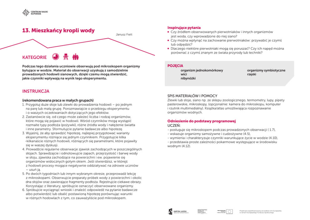 13. Mieszkańcy kropli wody Inspirujące pytania Janusz Fiett Czy źródłem obserwowanych pierwotniaków i innych organizmów jest woda, czy wprowadzone do niej siano? Czy można wpłynąć na zachowanie pierwotniaków: przywabić je czymś lub odpędzić? Dlaczego niektóre pierwotniaki mogą się poruszać? Czy ich napęd można porównać z czymś znanym ze świata przyrody lub techniki? KATEGORIE Podczas tego działania uczniowie obserwują pod mikroskopem organizmy bytujące w wodzie. Materiał do obserwacji uzyskują z samodzielnie prowadzonych hodowli sianowych, dzięki czemu mogą stwierdzić, jakie czynniki wpływają na wynik tego eksperymentu. POJĘCIA organizm jednokomórkowy organizmy symbiotyczne wicirzęski nibynóżki INSTRUKCJA SPIS MATERIAŁÓW I POMOCY (rekomendowana praca w małych grupach) 1. Przygotuj duże słoje lub zlewki do prowadzenia hodowli – po jednym na parę lub małą grupę. Porozmawiajcie o przebiegu eksperymentu i o waszych oczekiwaniach dotyczących jego efektów. 2. Zastanówcie się, od czego może zależeć liczba i rodzaj organizmów, które mogą się pojawić w hodowli. Wśród czynników mogą wystąpić rozmaite typy podłoża (pożywki), różne źródła wody i natężenie światła i inne parametry. Sformułujcie pytanie badawcze albo hipotezę. 3. Wyjaśnij, że aby sprawdzić hipotezę, najlepiej przygotować warianty eksperymentu różniące się jednym czynnikiem. Przygotujcie kilka -kilkanaście różnych hodowli, różniących się parametrami, które pojawiły się w waszej dyskusji. 4. Prowadźcie regularne obserwacje zjawisk zachodzących w poszczególnych słojach. Sprawdzajcie i odnotowujcie zapach, przejrzystość i barwę wody w słoju, zjawiska zachodzące na powierzchni i ew. pojawienie się organizmów widocznych gołym okiem. Jeśli stwierdzisz, w którejś z hodowli procesy mogące negatywnie oddziaływać na zdrowie uczniów – usuń ją. 5. Po dwóch tygodniach lub innym wybranym okresie, przeprowadź lekcję z mikroskopami. Obserwujcie preparaty próbek wody z powierzchni i okolic dna słojów oraz zawierające fragmenty podłoża. Rejestrujcie ciekawe obrazy. Korzystając z literatury, spróbujcie oznaczyć obserwowane organizmy. 6. Spróbujcie wyciągnąć wnioski i znaleźć odpowiedź na pytanie badawcze albo potwierdzić lub obalić postawioną hipotezę porównując warunki w różnych hodowlach z tym, co zauważyliście pod mikroskopem. Zlewki lub słoje, siano np. ze sklepu zoologicznego, termometry, lupy, pipety pasterowskie, mikroskopy, (opcjonalnie: kamera do mikroskopu, komputer i rzutnik multimedialny). Książka/atlas umożliwiająca rozpoznawanie organizmów wodnych. Odniesienie do podstawy programowej UCZEŃ: - posługuje się mikroskopem podczas prowadzonych obserwacji ( 1.7), - wskazuje organizmy samożywne i cudzożywne (4.5), - wymienia i charakteryzuje czynniki warunkujące życie w wodzie (4.10), - przedstawia proste zależności pokarmowe występujące w środowisku wodnym (4.12). Projekt jest współfinansowany ze środków Unii Europejskiej w ramach Europejskiego Funduszu Społecznego.